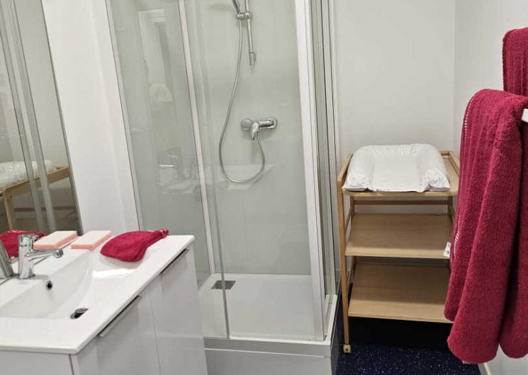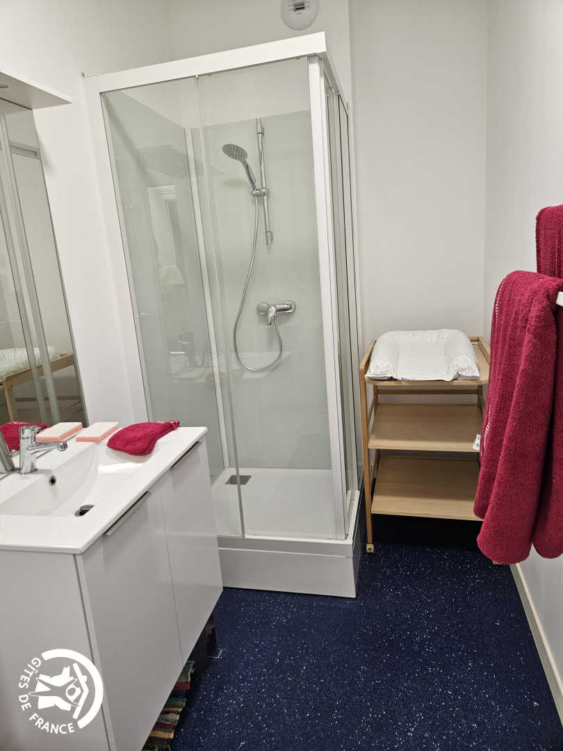 – chambre avec lit double 140x190cm, salle d’eau privative accessible aux personnes à mobilité réduite (douche, vasque)