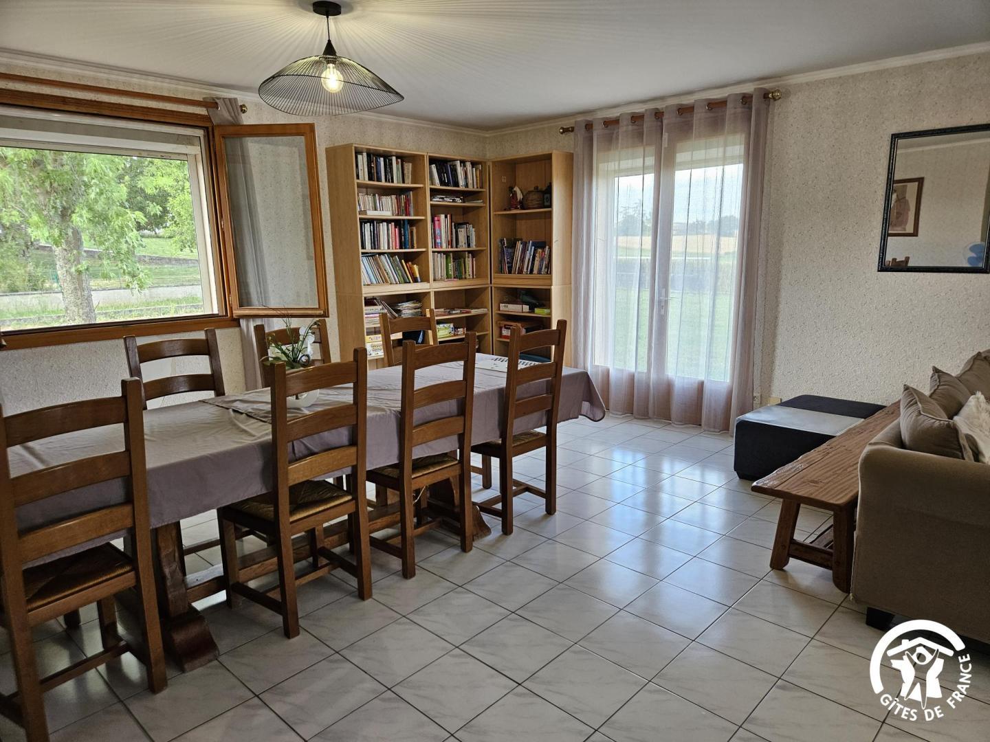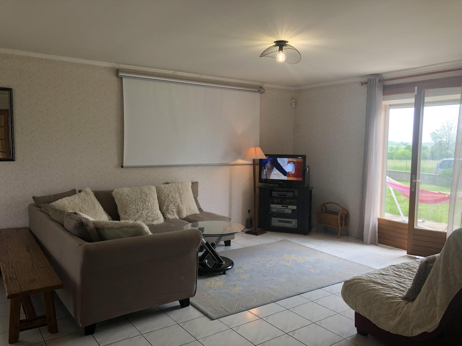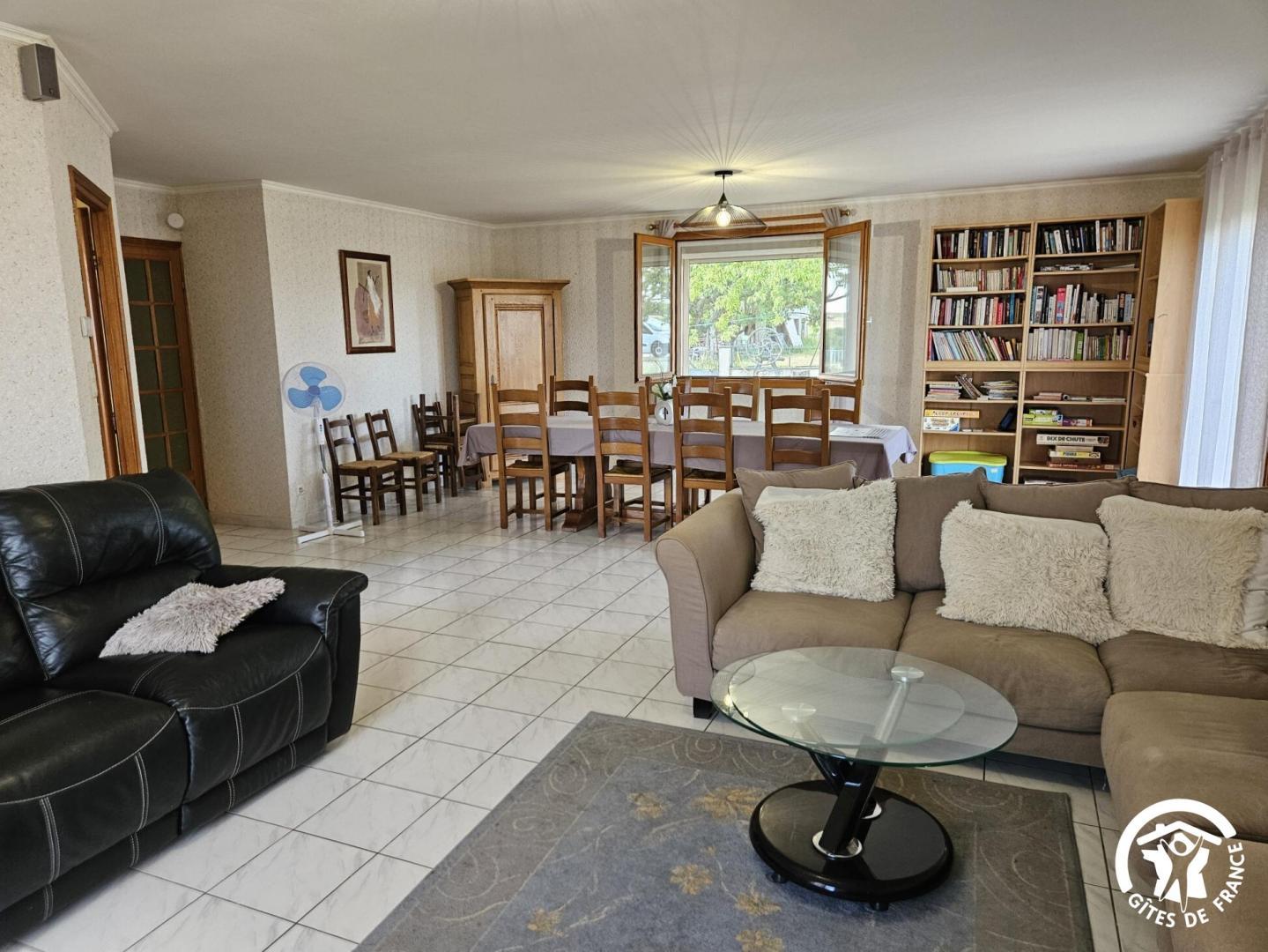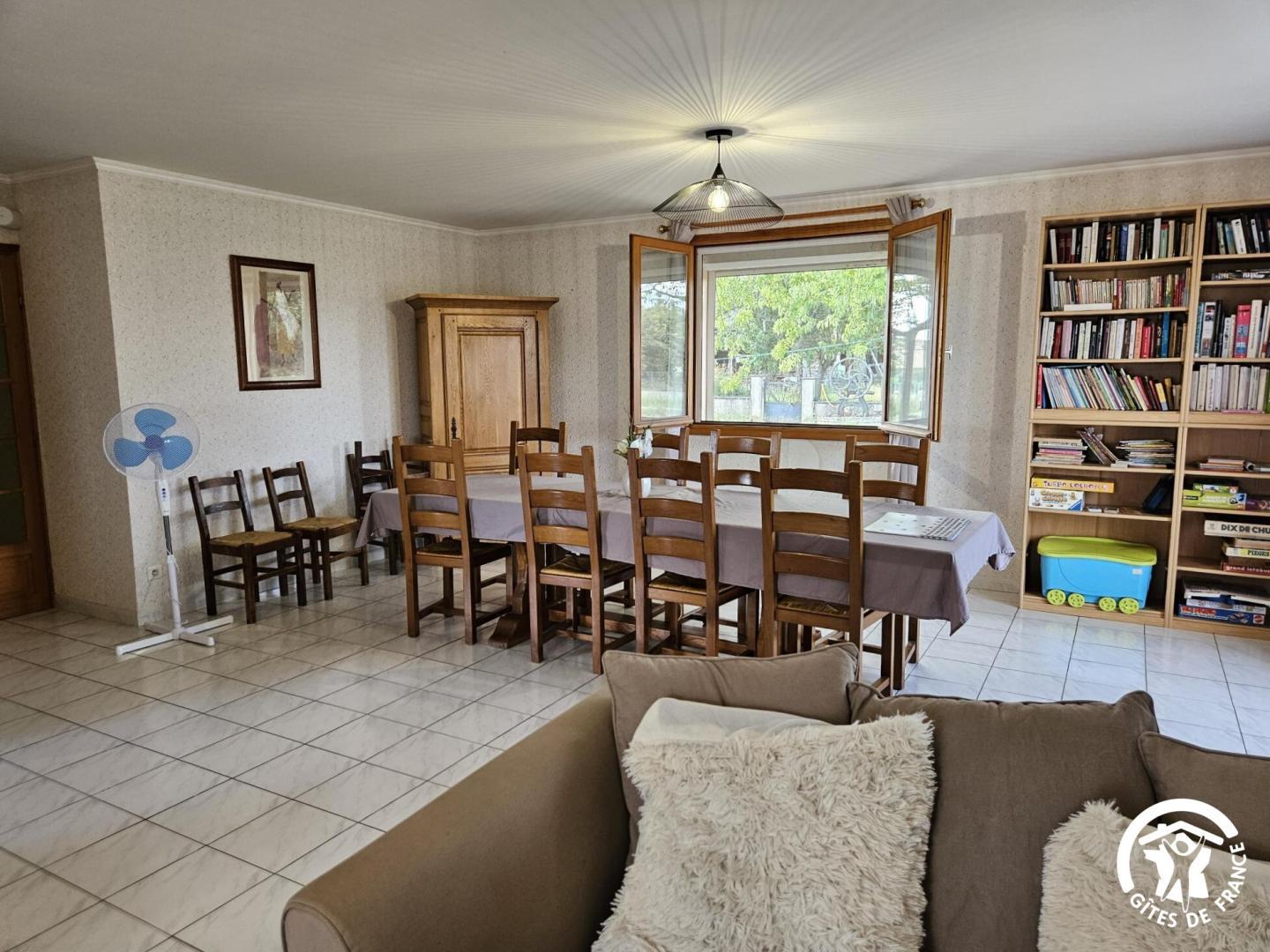 Salle à manger / salon avec bibliothèque, jeux de société, télévision et écran de vidéo-projection (possibilité de prêt de vidéoprojecteur sur demande).