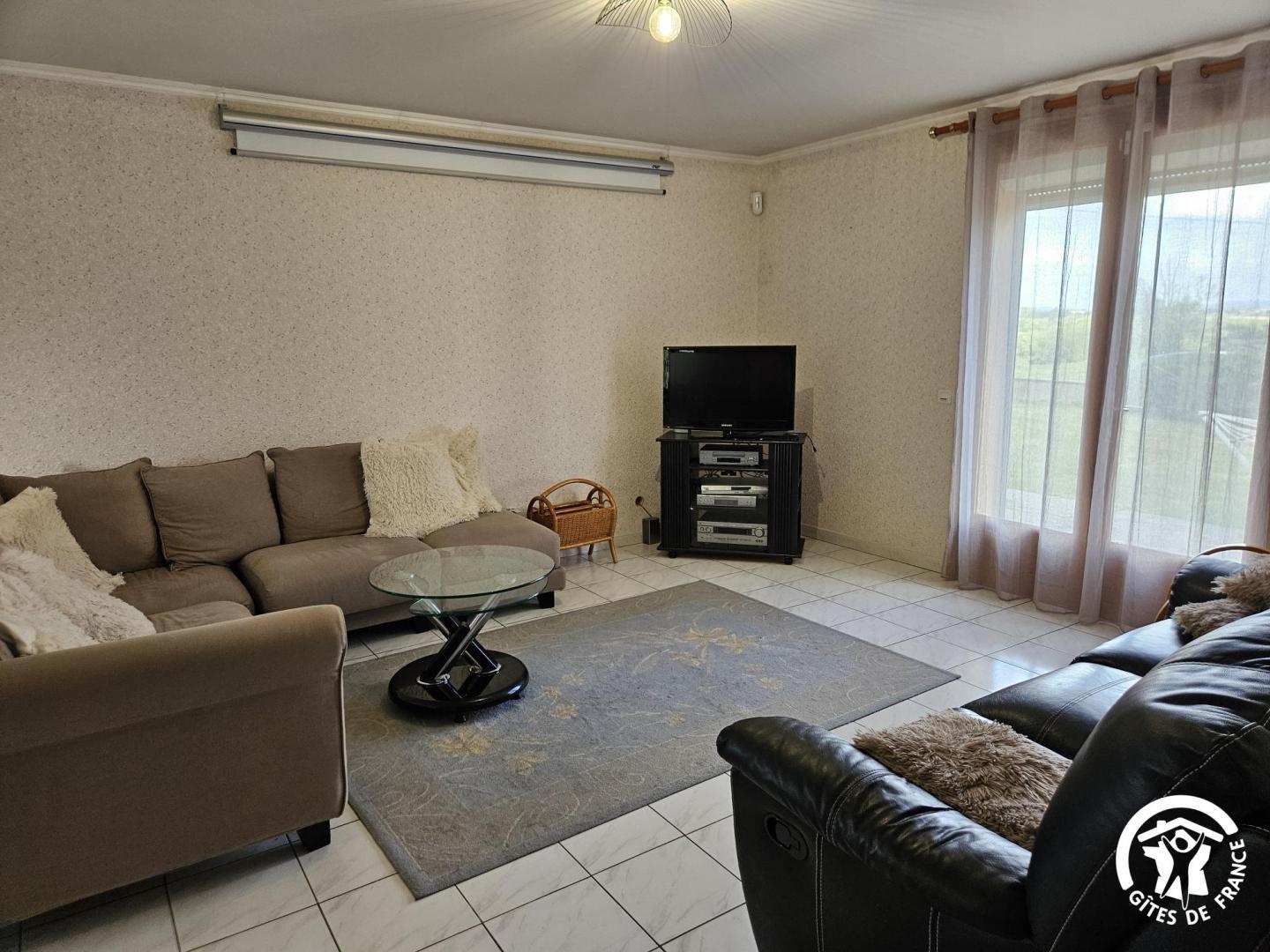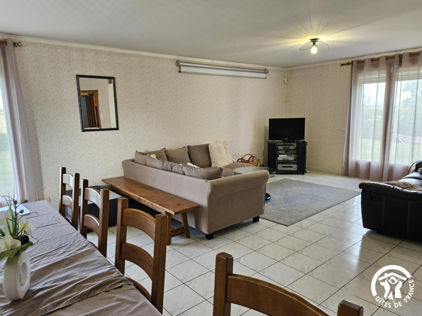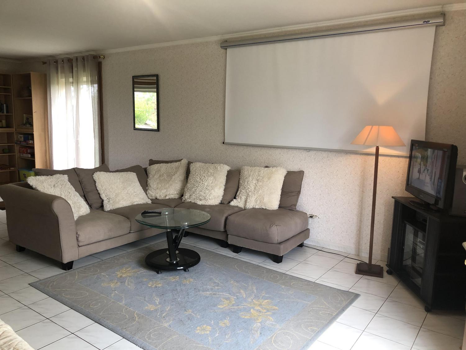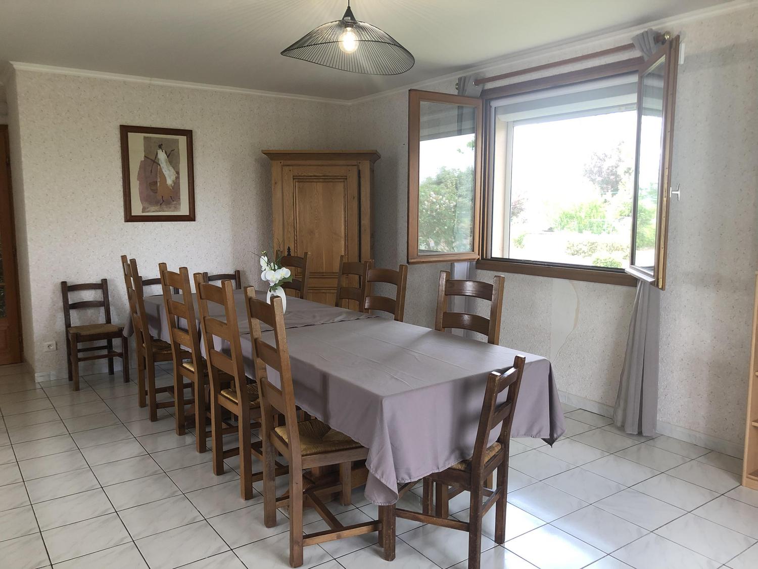 Salle à manger / salon avec bibliothèque, jeux de société, télévision et écran de vidéo-projection (possibilité de prêt de vidéoprojecteur sur demande).