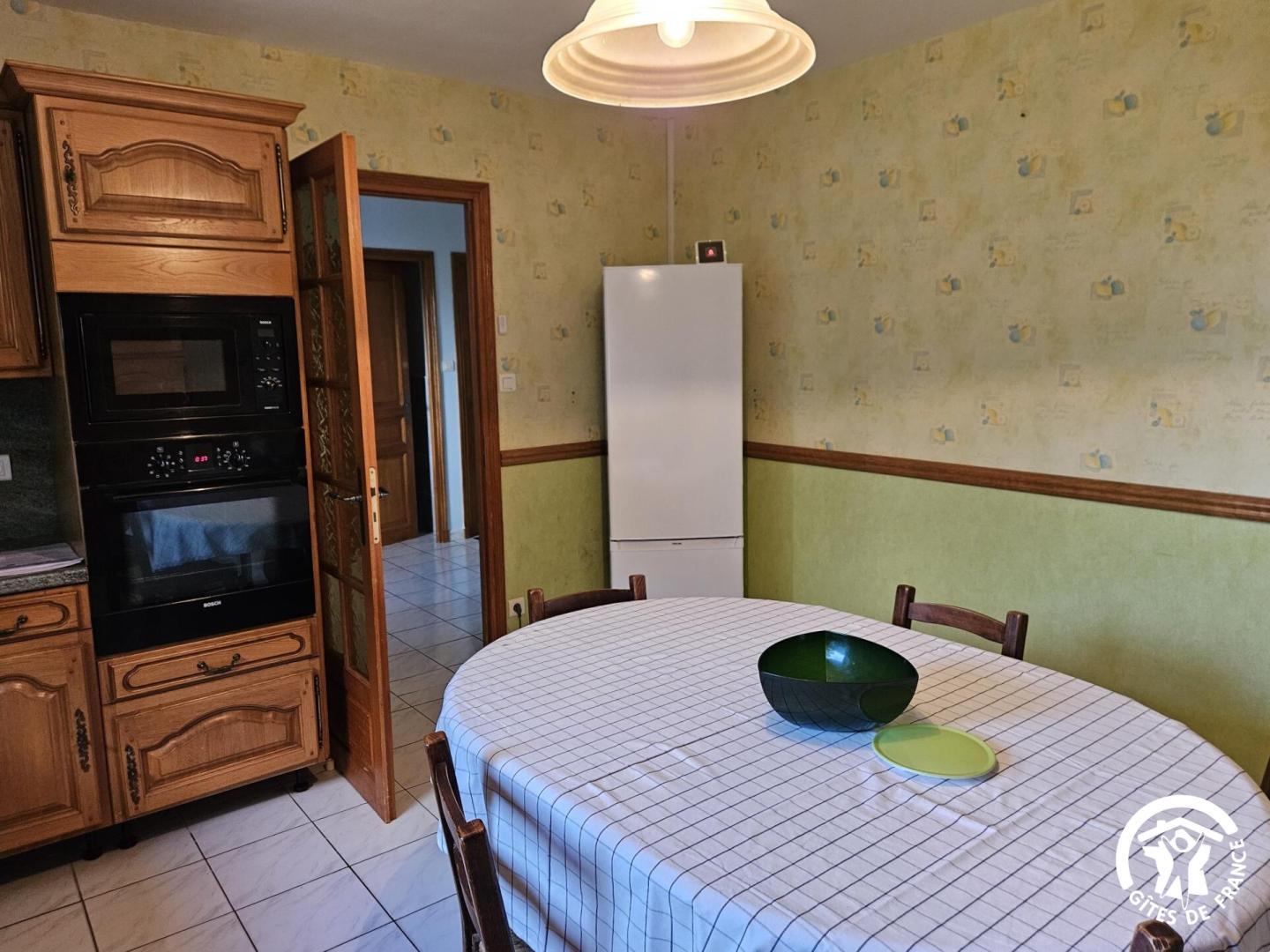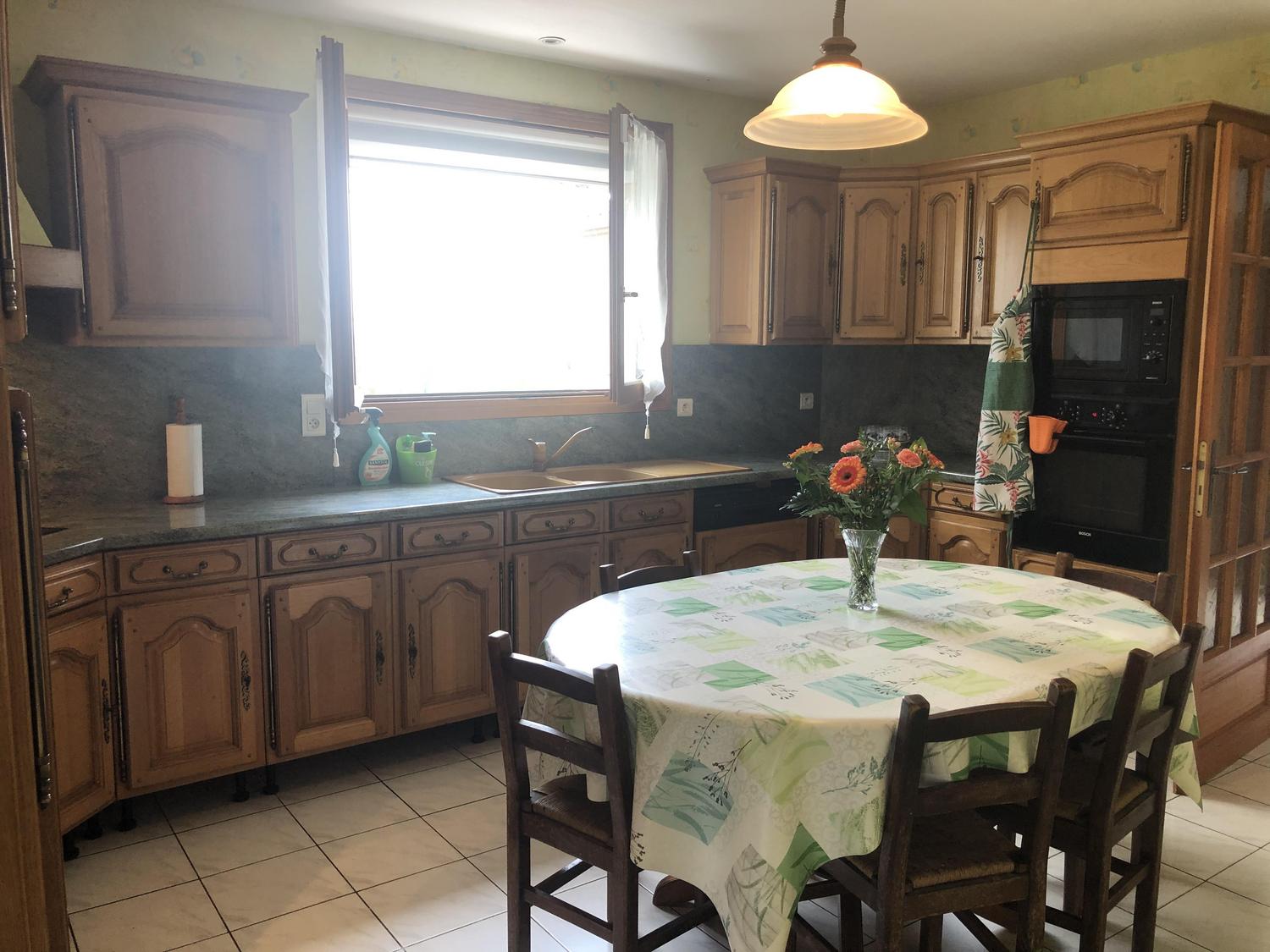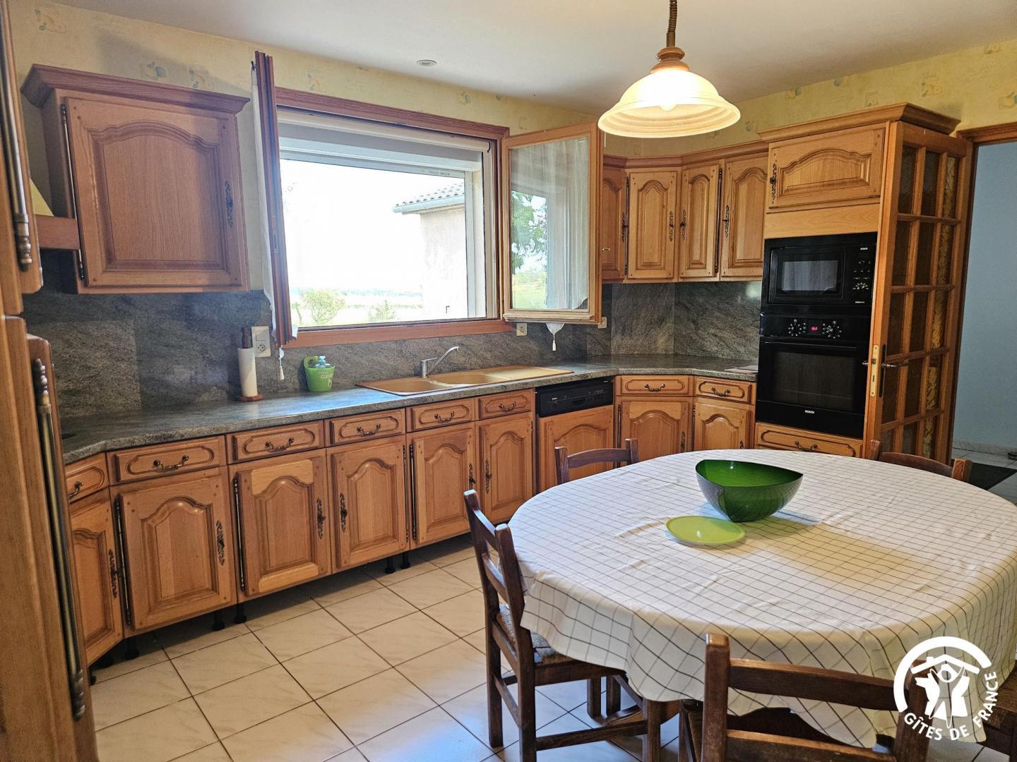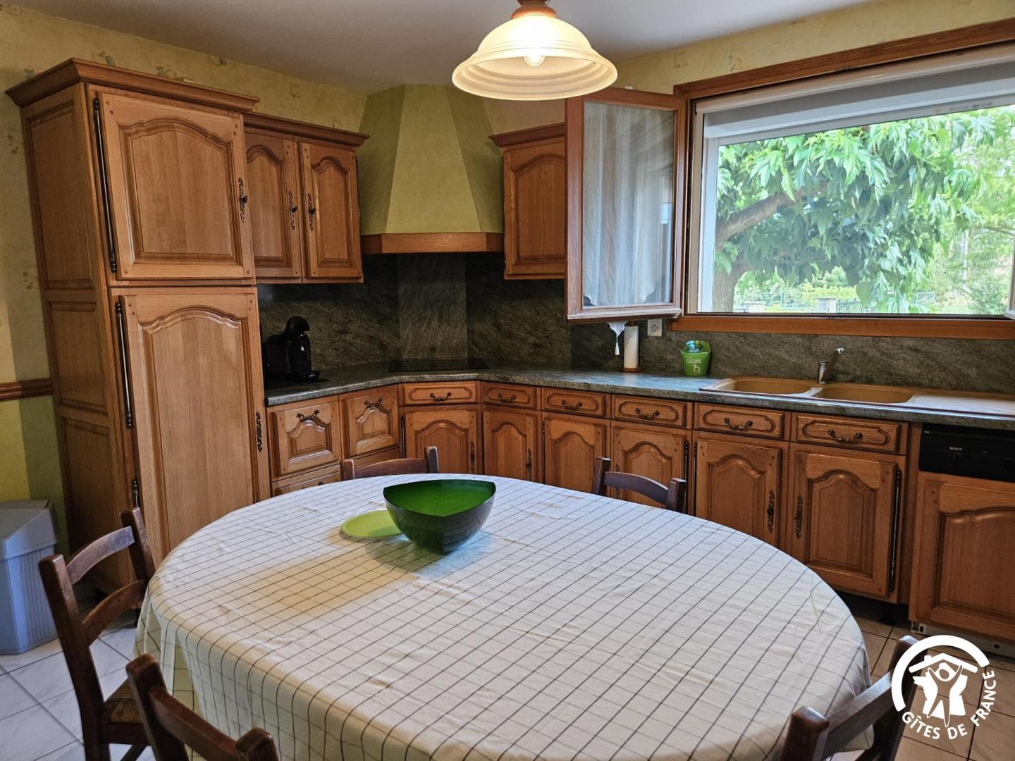 Cuisine indépendante toute équipée (machine à café Tassimo) avec table pour 6 et vue sur le grand jardin.