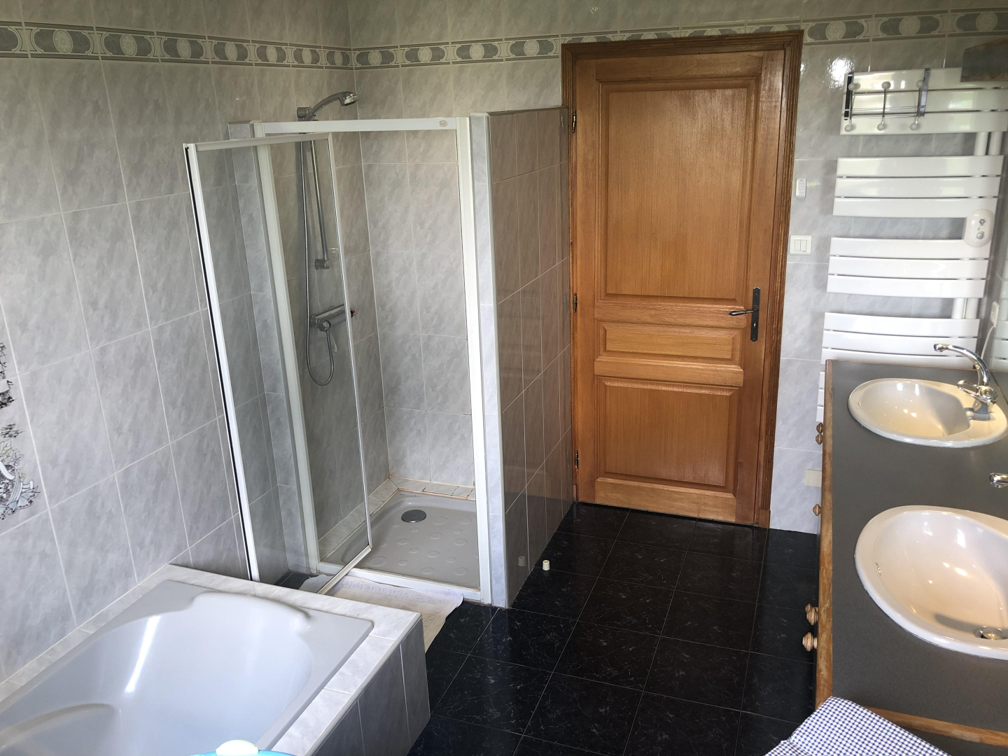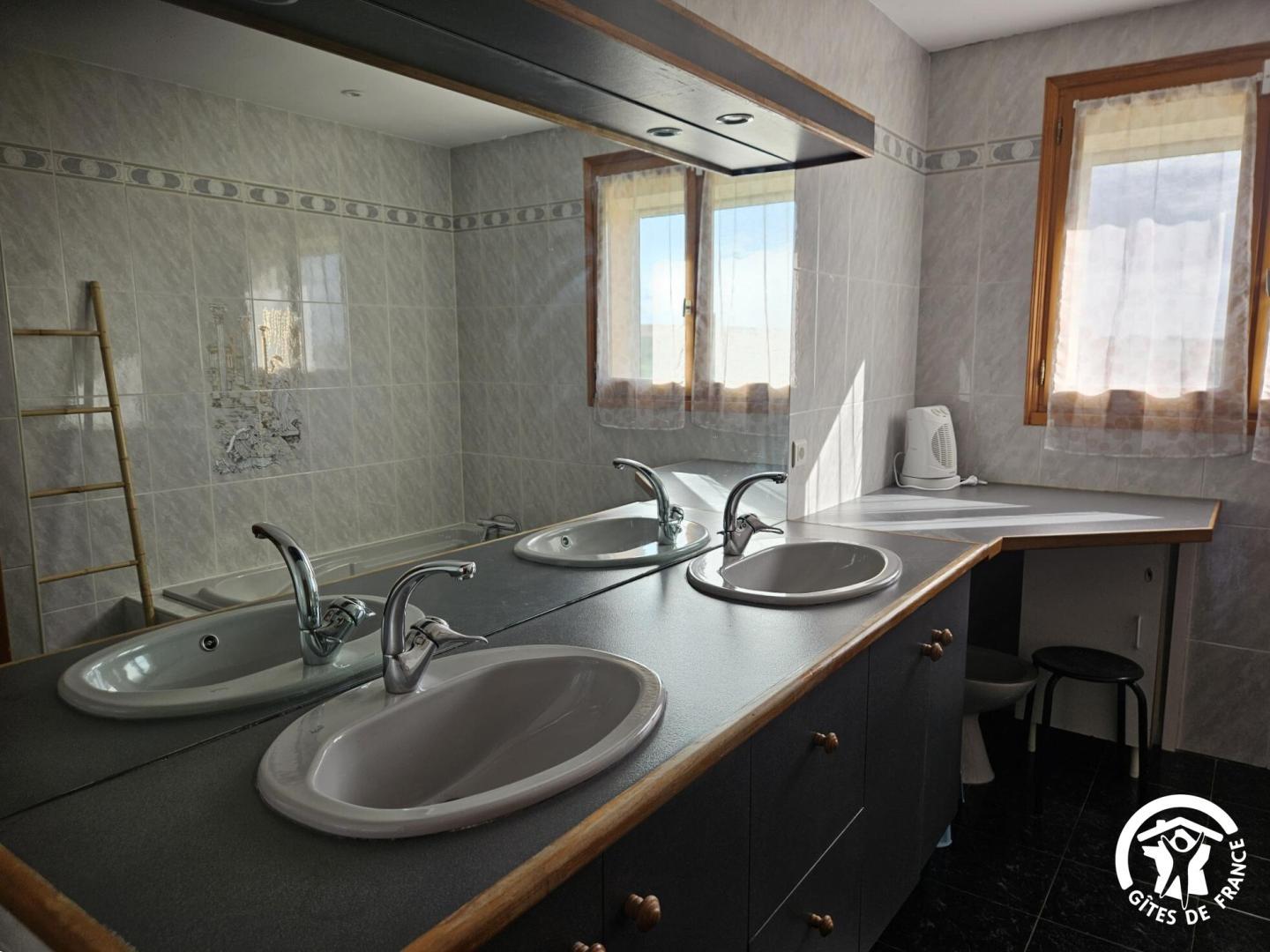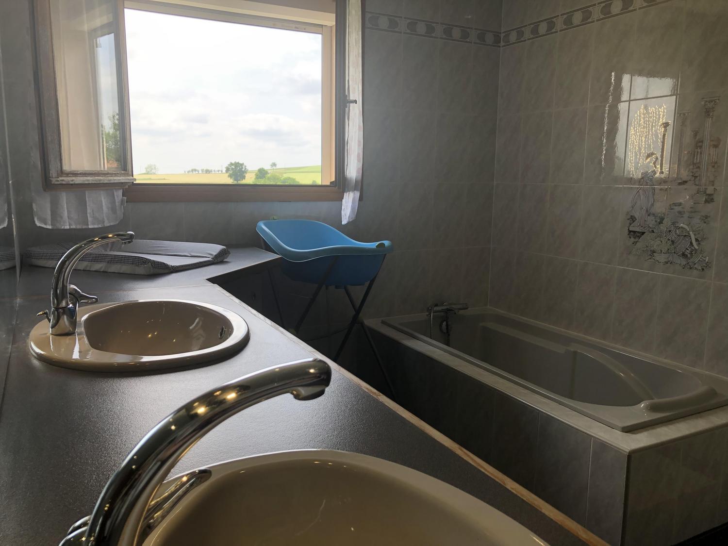 Salle de bain : double vasque, baignoire + douche, baignoire pour bébé et change-bébé. Deux WC indépendants.