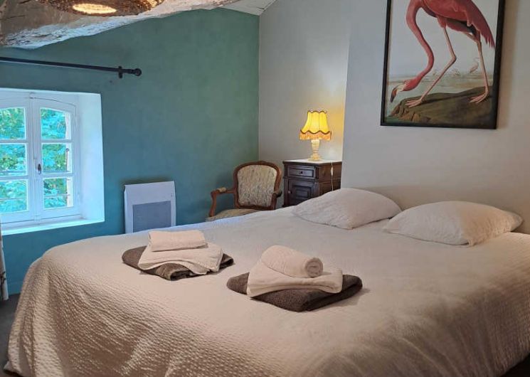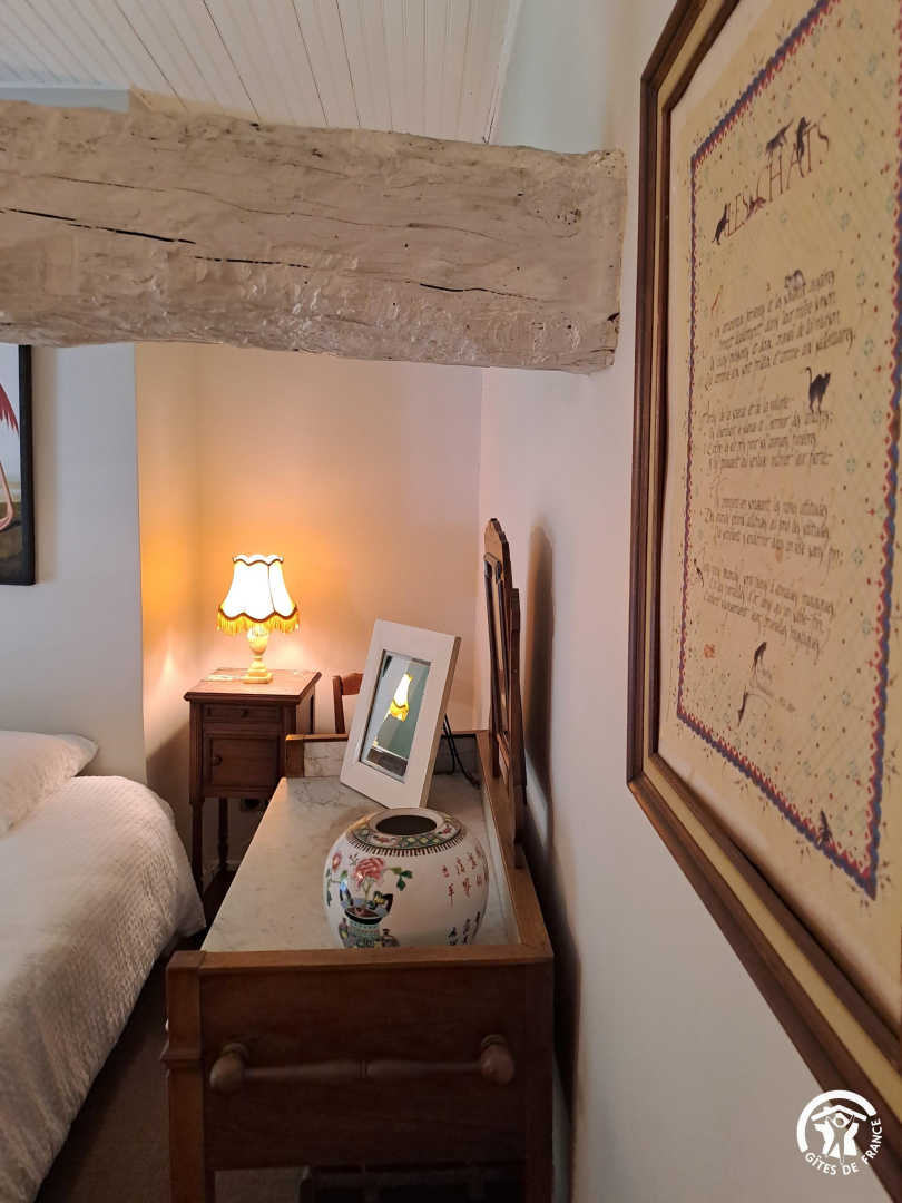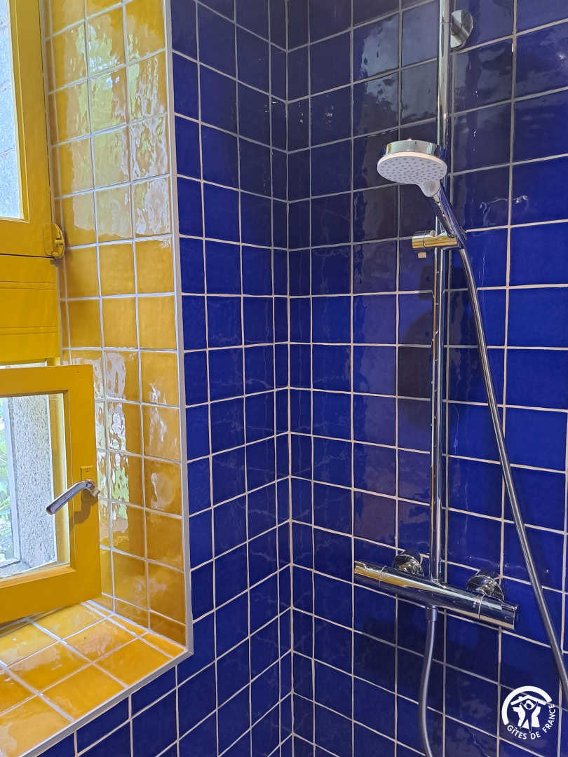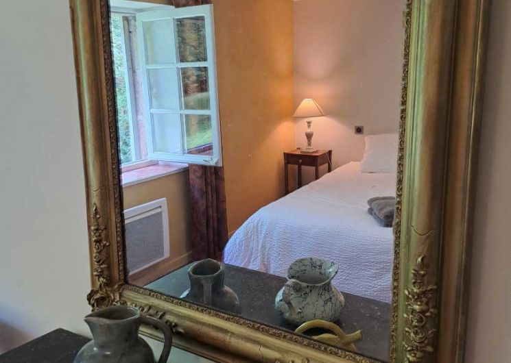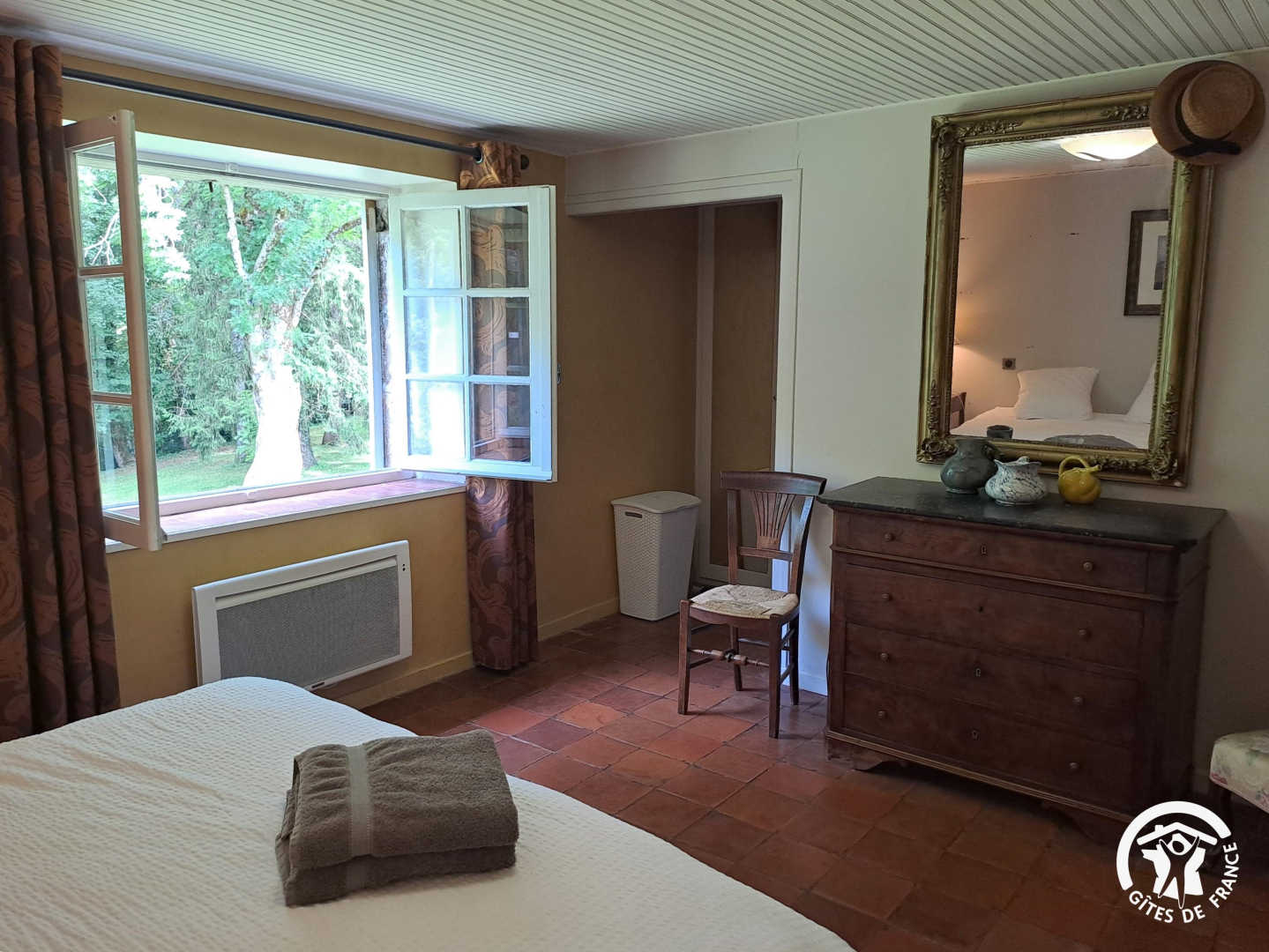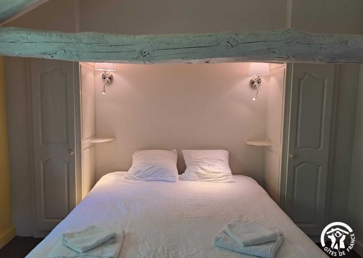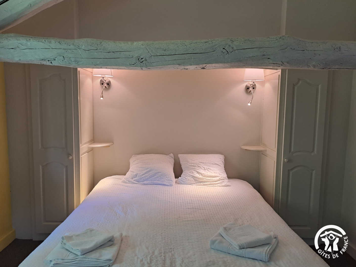 – The yellow bedroom, very spacious, accommodates 4 people with one 160×200 cm double bed and two single beds