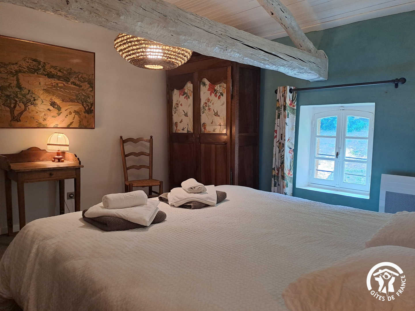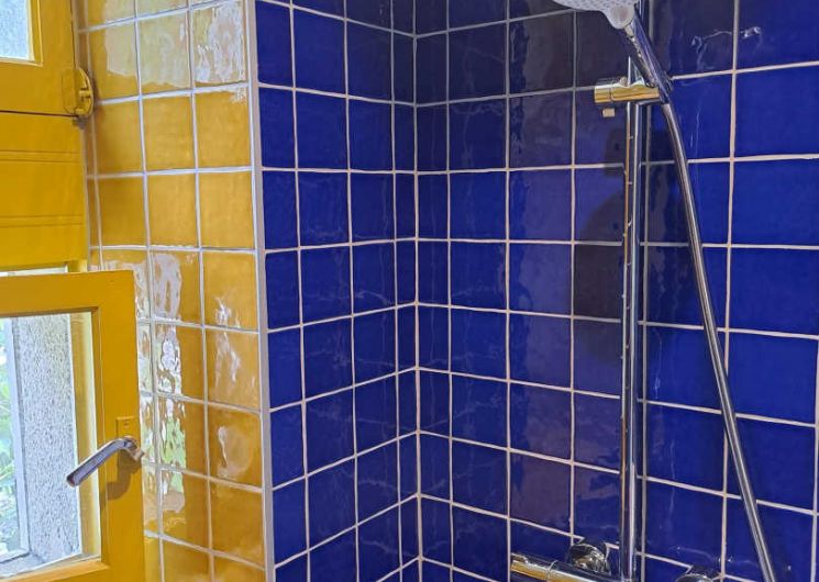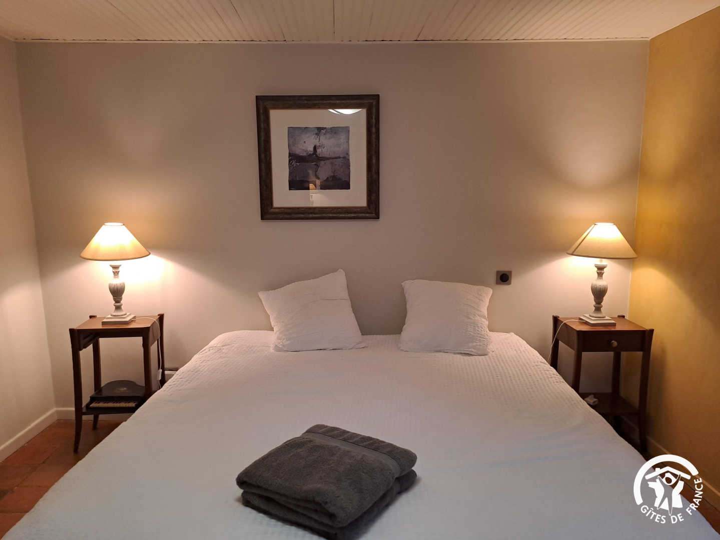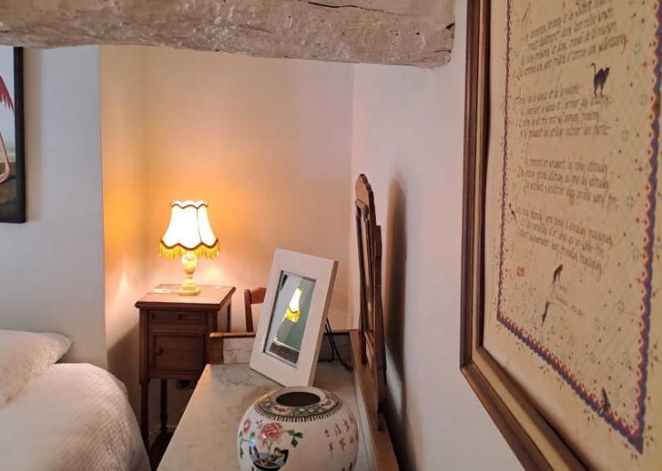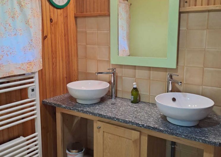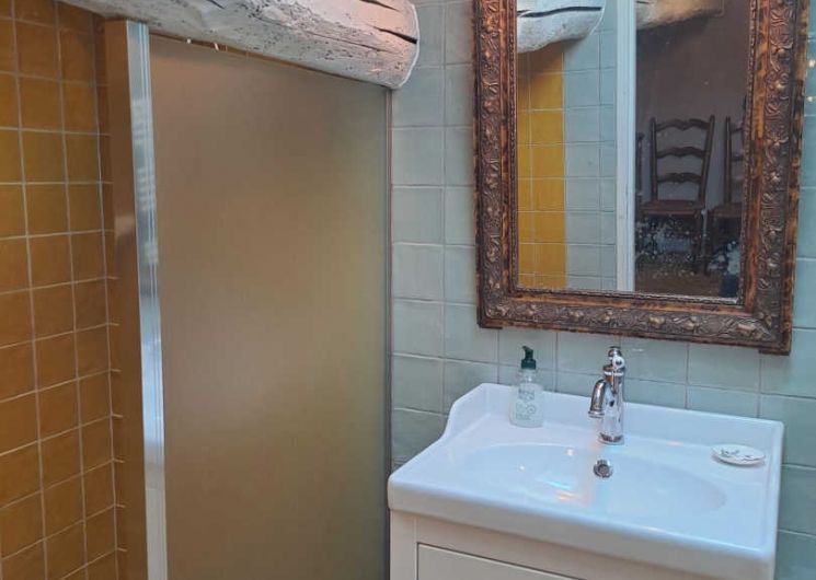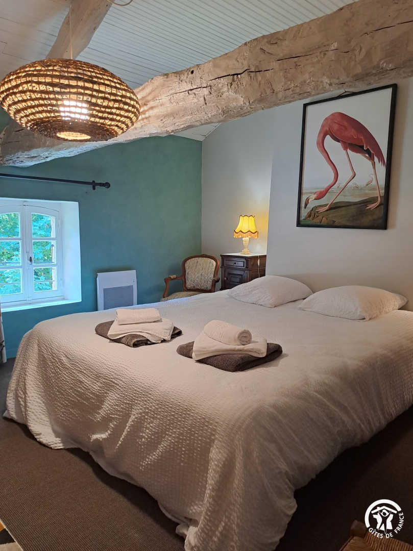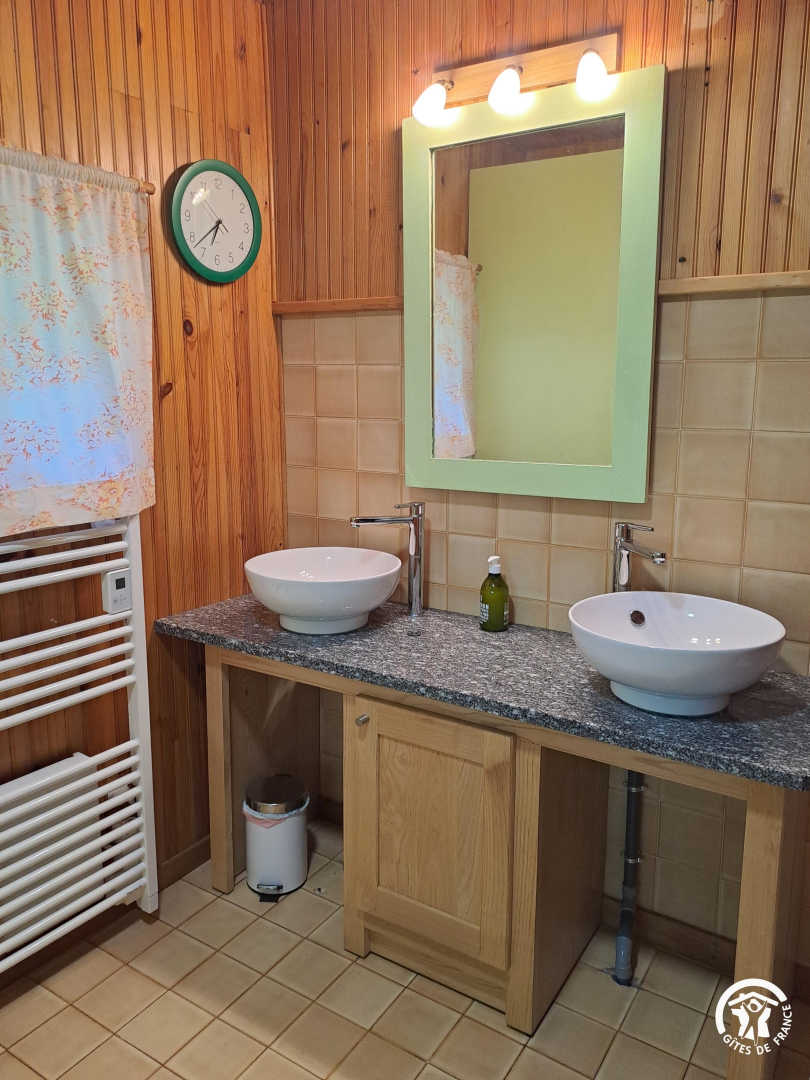 – The yellow bedroom, very spacious, accommodates 4 people with one 160×200 cm double bed and two single beds