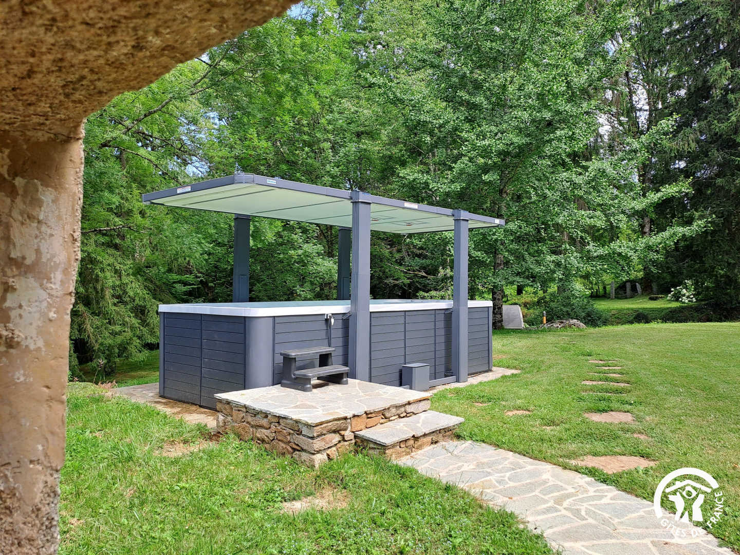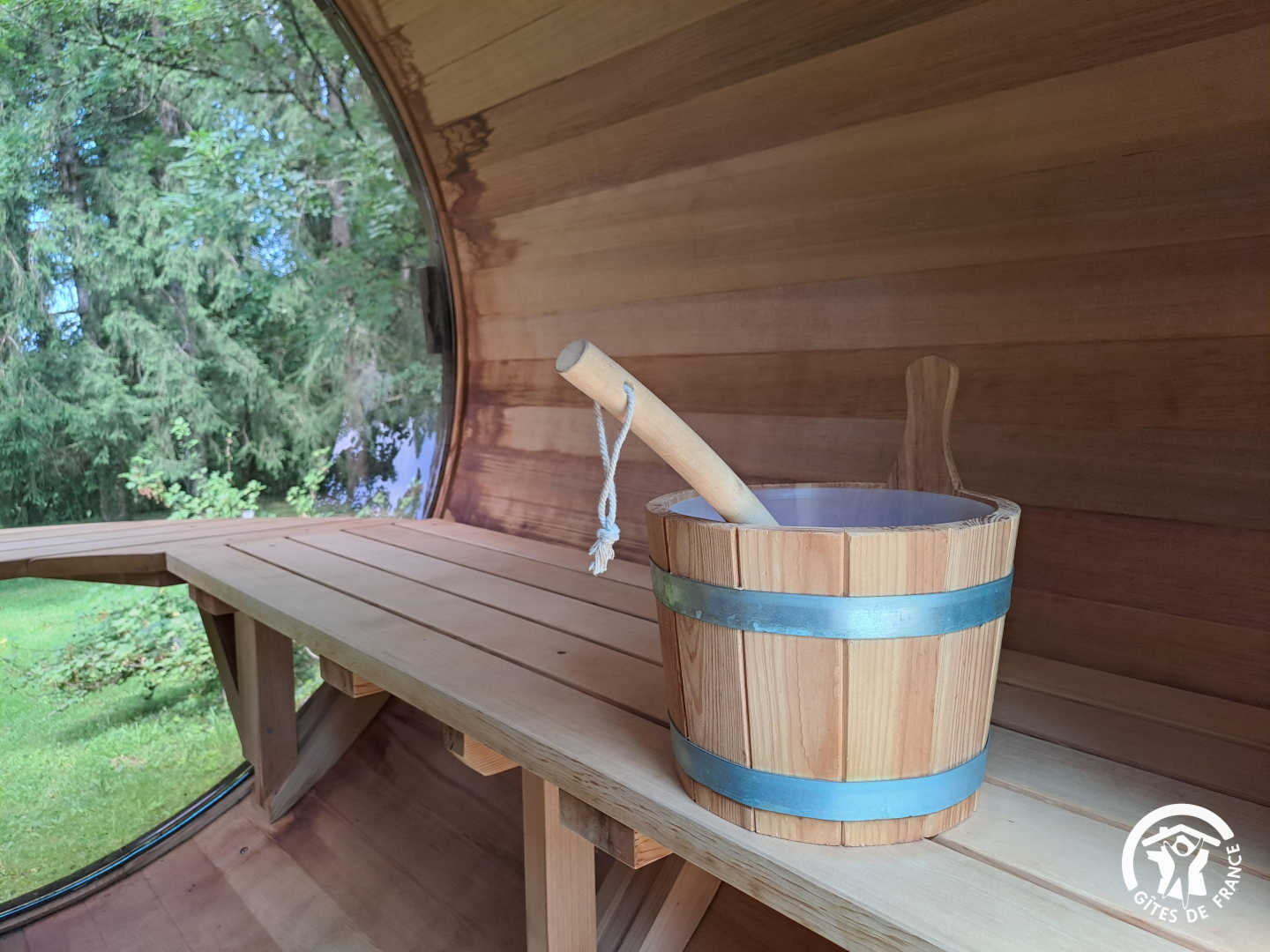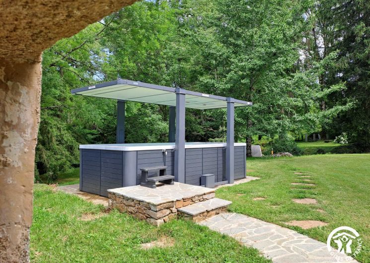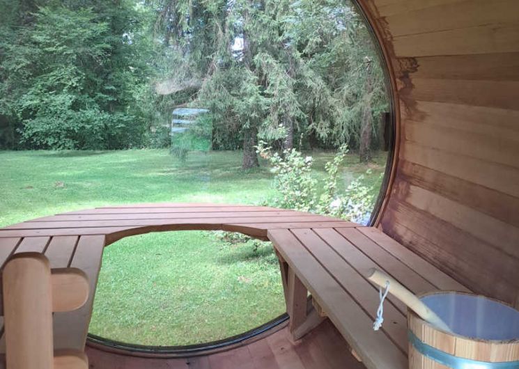 A heated swim spa (5.50 m x 2.10 m) with counter-current swimming and jacuzzi area, usable summer and winter, day and night, as well as a cylindrical wooden electric sauna with viewing window.