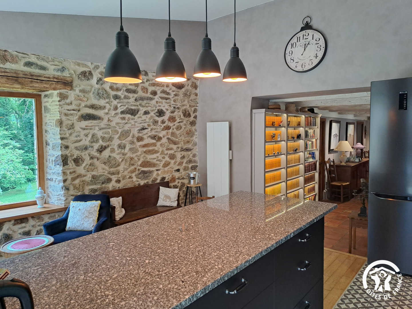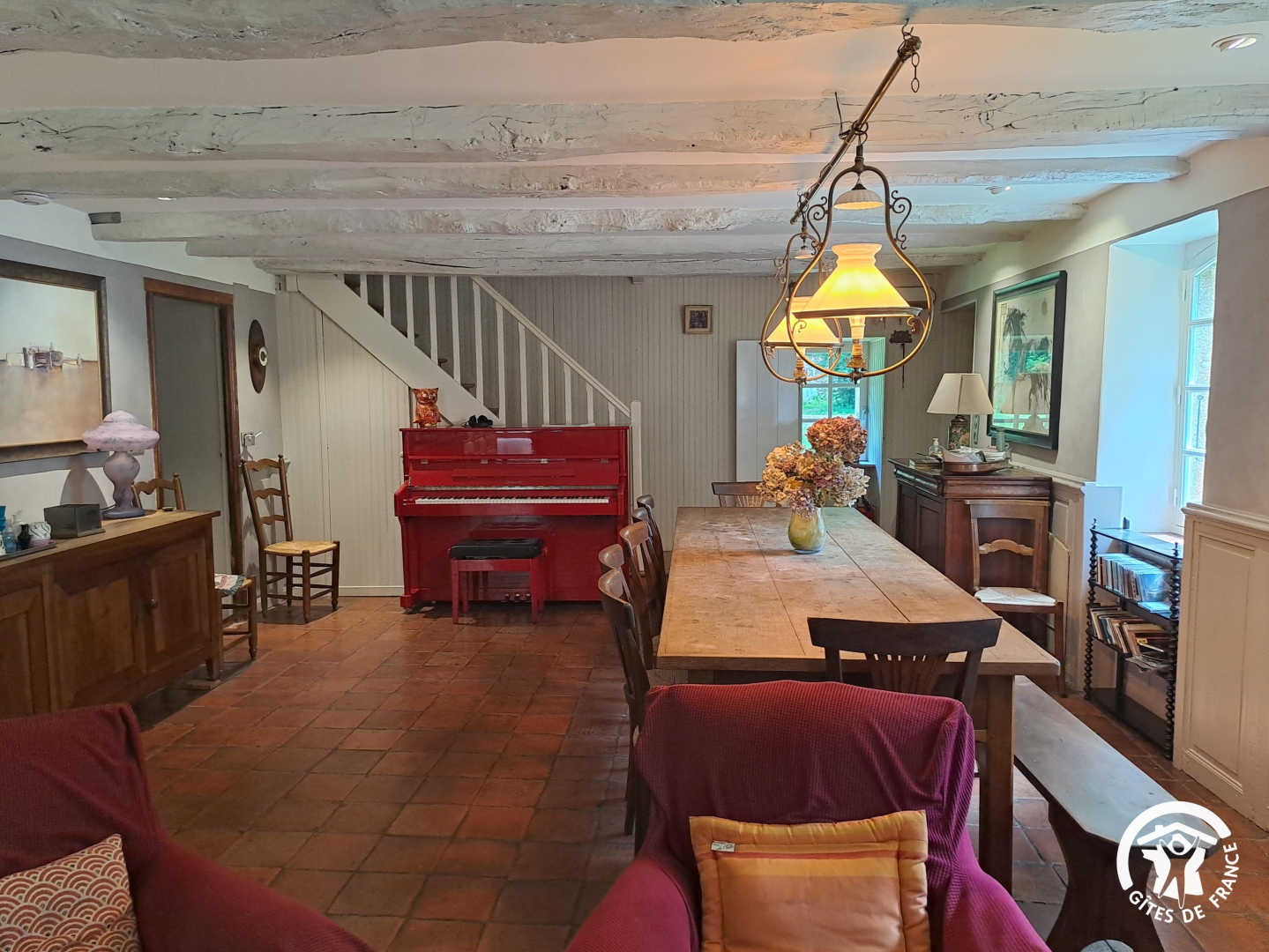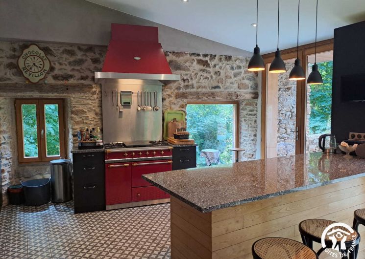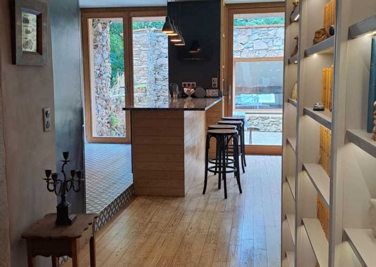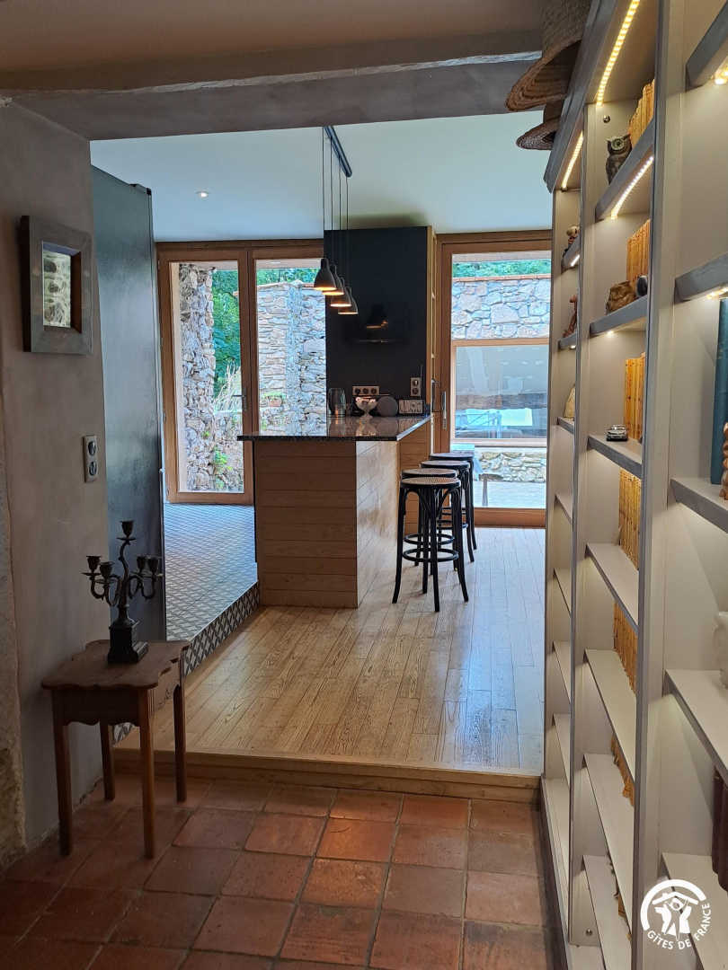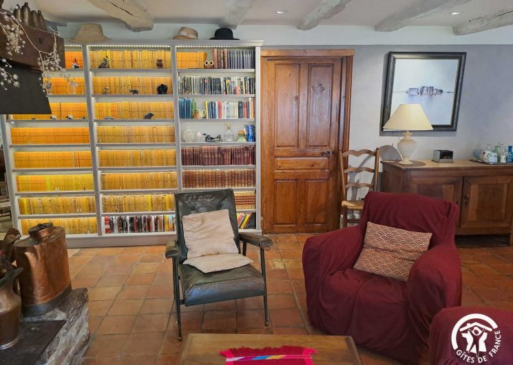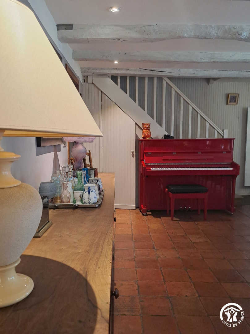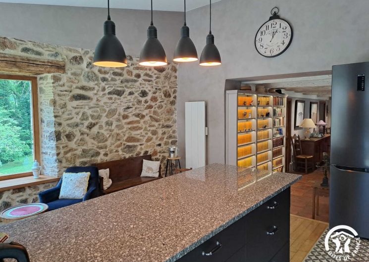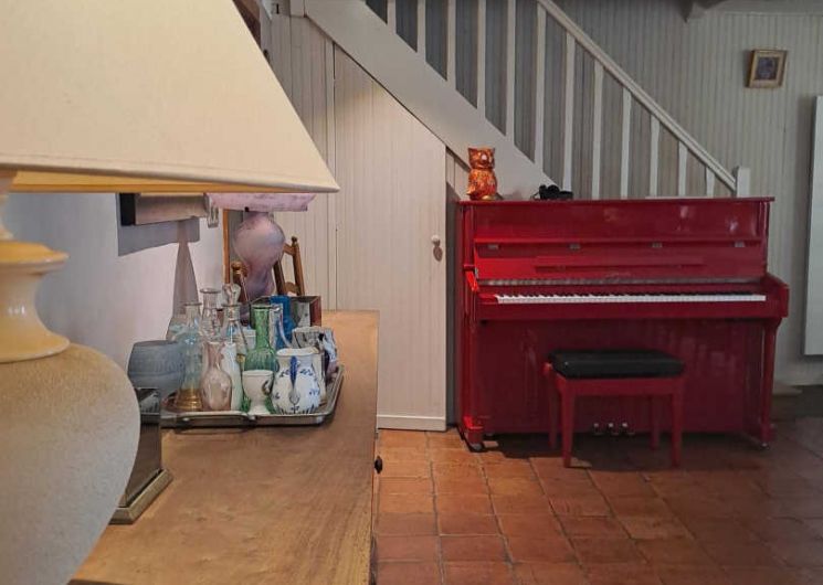 Living room / dining room with fireplace and library, beautiful and spacious fully equipped kitchen featuring a Sidobre granite central console and a Lacanche range cooker. Musicians can enjoy playing a “real” piano, even in silent mode.