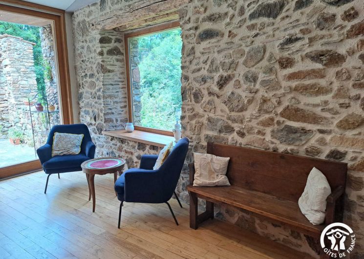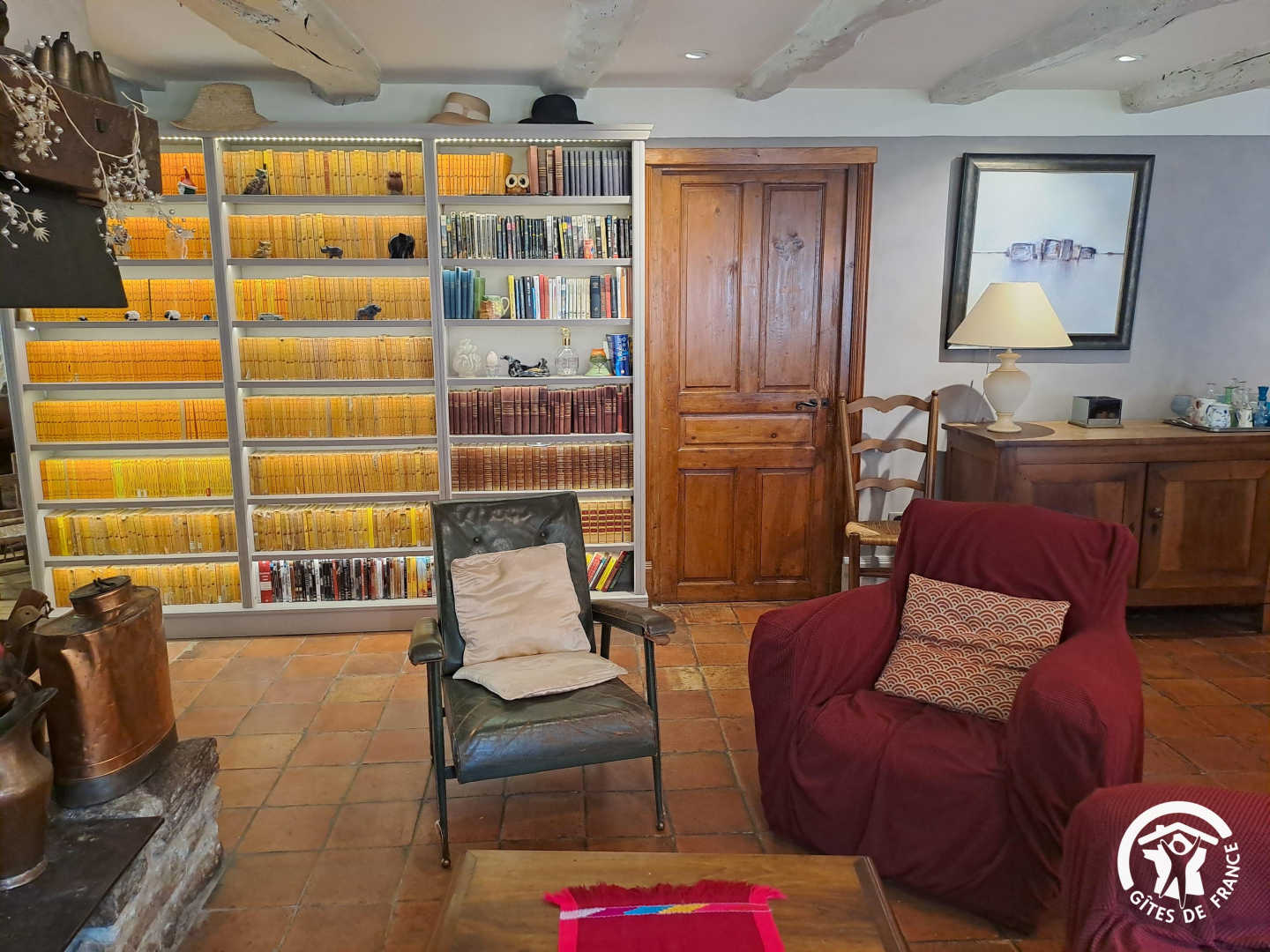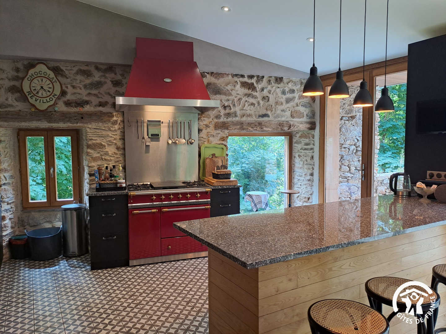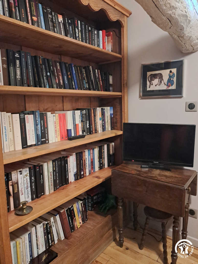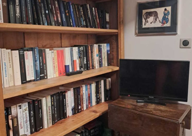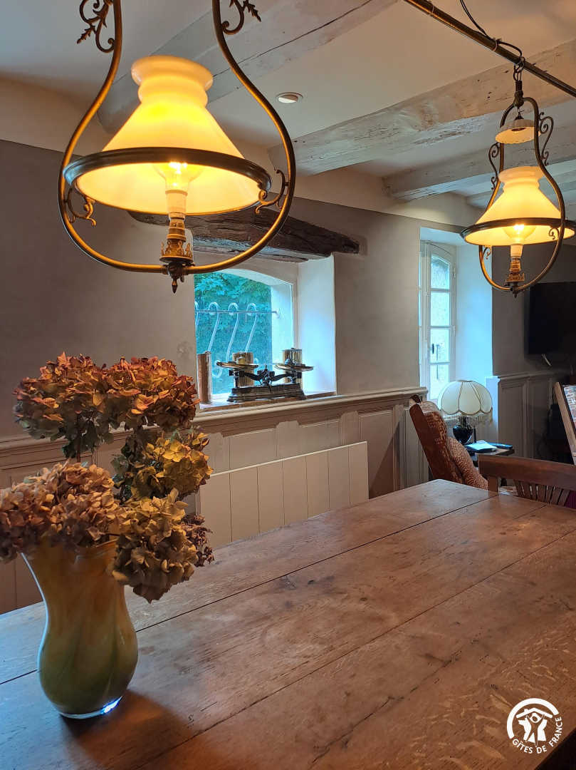 Living room / dining room with fireplace and library, beautiful and spacious fully equipped kitchen featuring a Sidobre granite central console and a Lacanche range cooker. Musicians can enjoy playing a “real” piano, even in silent mode.