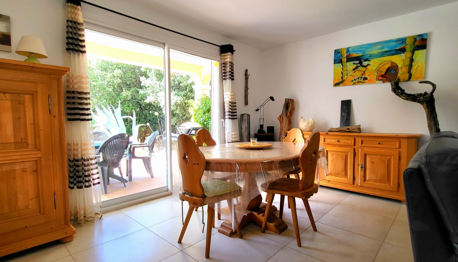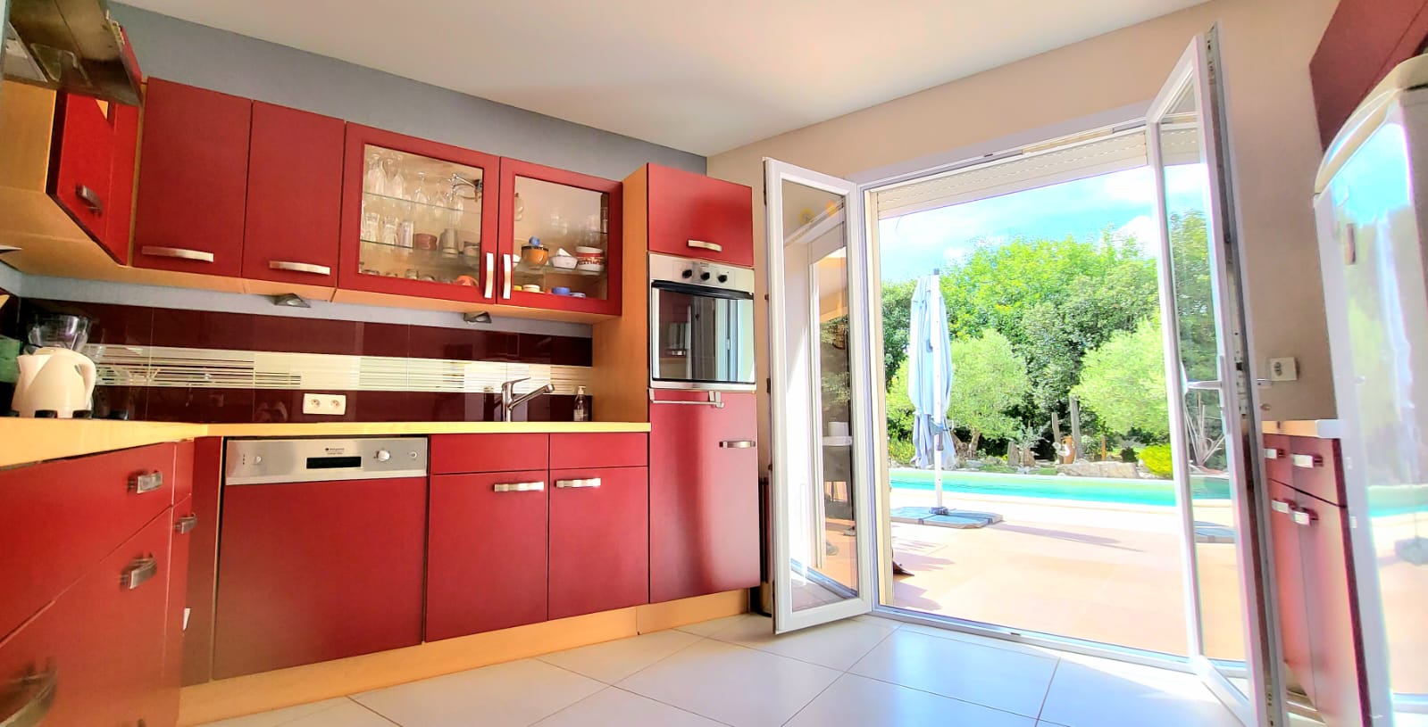 La maison, orientée vers le sud, s’ouvre sur une grande pièce à vivre très lumineuse donnant sur une cuisine équipée, semi-séparée et la terrasse (dont une partie couverte)