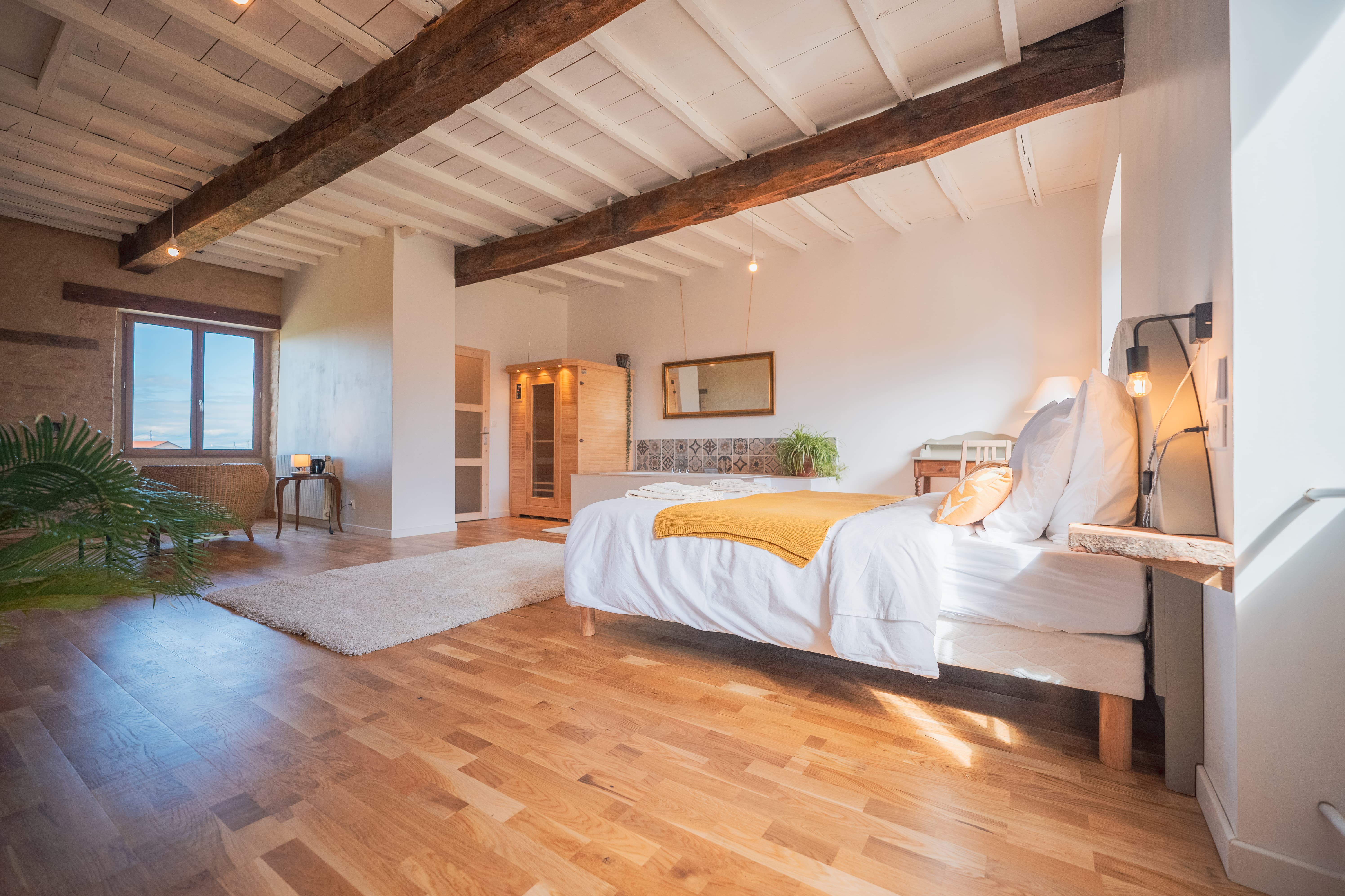 La maison est composée de cinq chambres, chacune avec sa salle de bain privative. Nous avons 3 chambres doubles, une suite parentale pour 4 personnes et une suite bien-être pour 2 personnes avec sauna et baignoire à remous. Toutes les chambres sont situées au 1er étage.