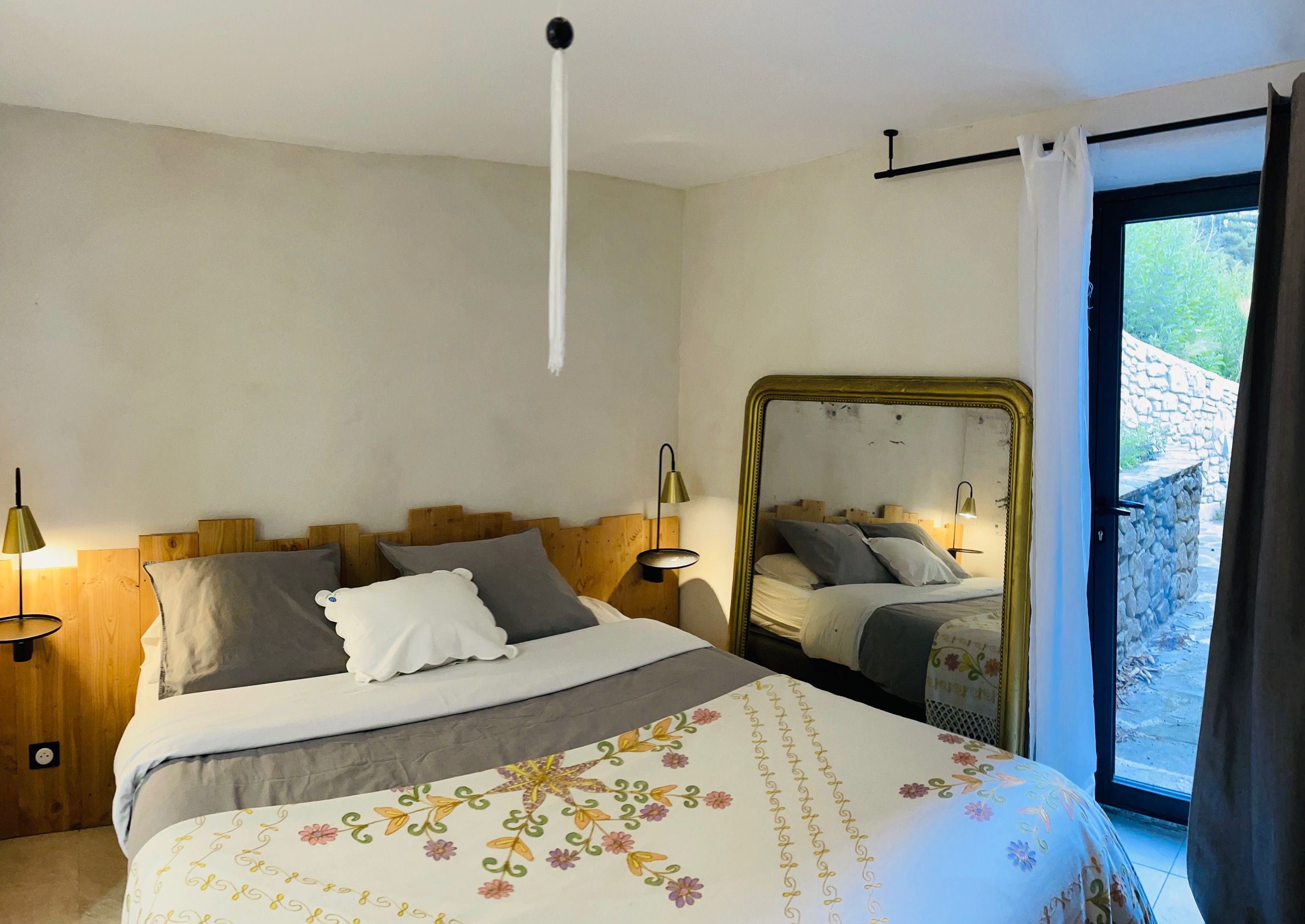 Le Repaire dispose de 3 chambres élégantes (dont une avec une mezzanine pour accueillir 2 personnes supplémentaires). Chacune dispose de sa propre salle d’eau. La pièce de vie, chaleureuse et lumineuse, comprend une cuisine toute équipée. Elle s’ouvre sur une belle terrasse couverte avec une vue exceptionnelle sur les Cévennes.