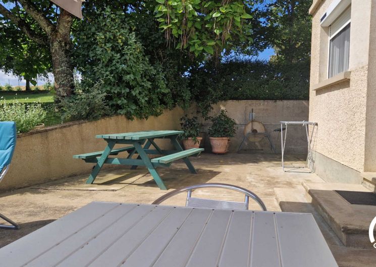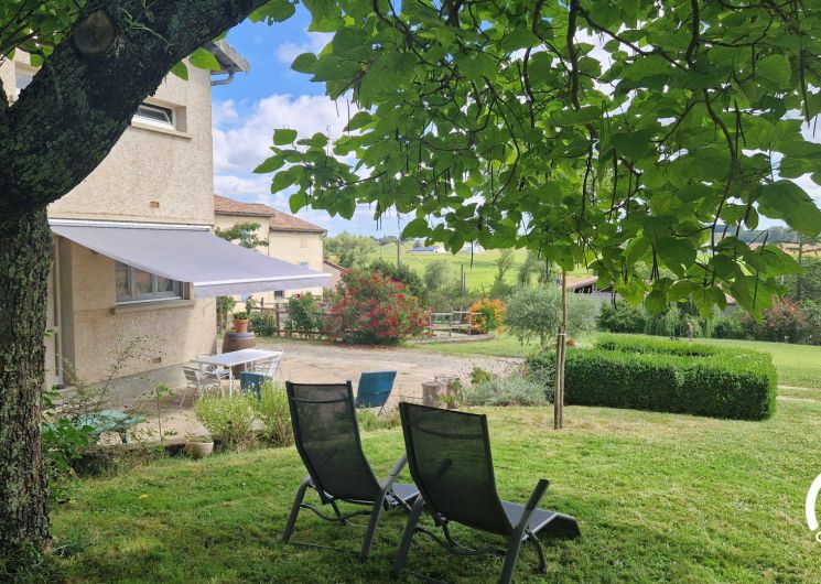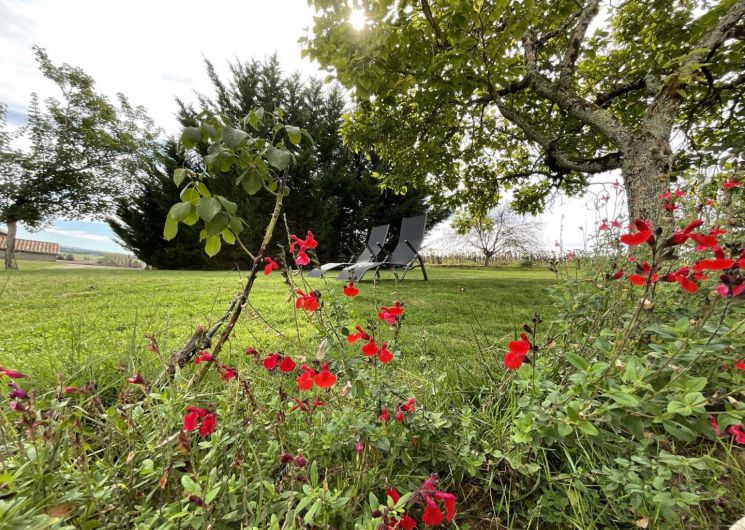 Cour attenante avec table de jardin couverte par un auvent, barbecue au charbon, transats et accès au grand jardin non clos d’environ 2000m² !