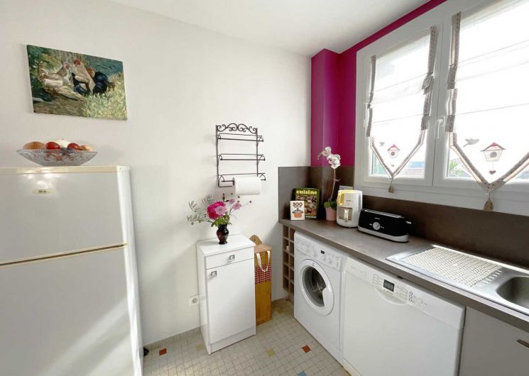 – cuisine ouverte et équipée : lave-vaisselle, lave-linge, four, réfrigérateur avec congélateur, micro-ondes, cafetière à filtre et à dosettes Tassimo, grille pain.