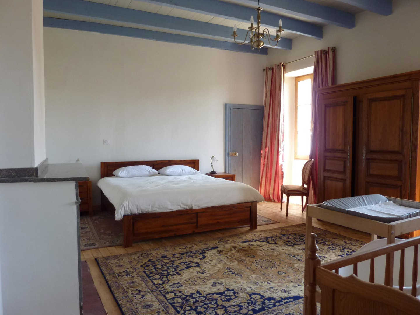 – A l’étage se trouve la grande chambre (lit double 180x200cm + lit bébé) et la salle d’eau avec WC. Grand hall avec lit simple en 90x190cm sous l’escalier qui mène au 2e étage pour une personne supplémentaire, sur demande uniquement.