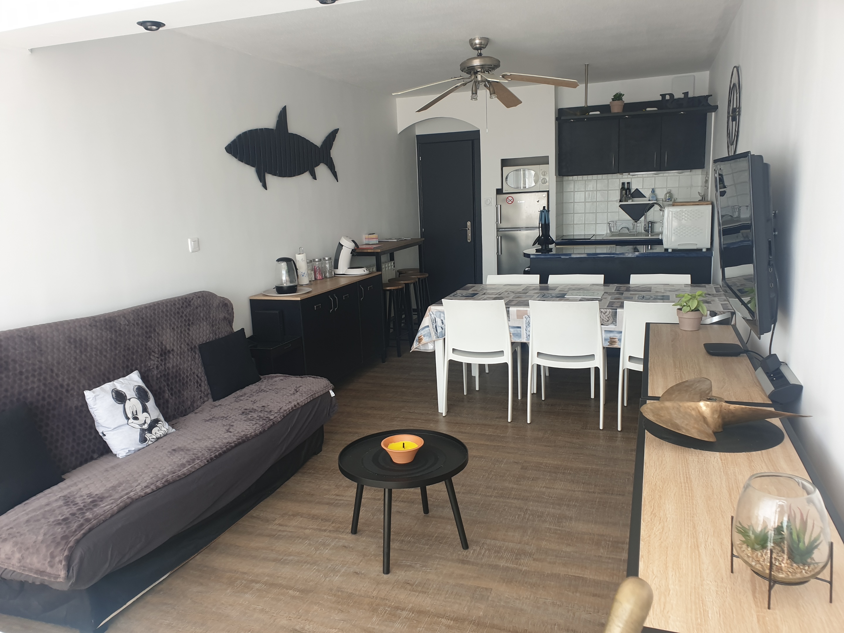 Es liegt direkt am Meer und verfügt über einen privaten Garten mit Zugang zum Strand. Es verfügt außerdem über einen privaten Parkplatz in einer geschlossenen Wohnanlage. In der Nähe finden Sie eine Apotheke, einen Tabakladen, ein kleines Lebensmittelgeschäft und andere Geschäfte und Restaurants.