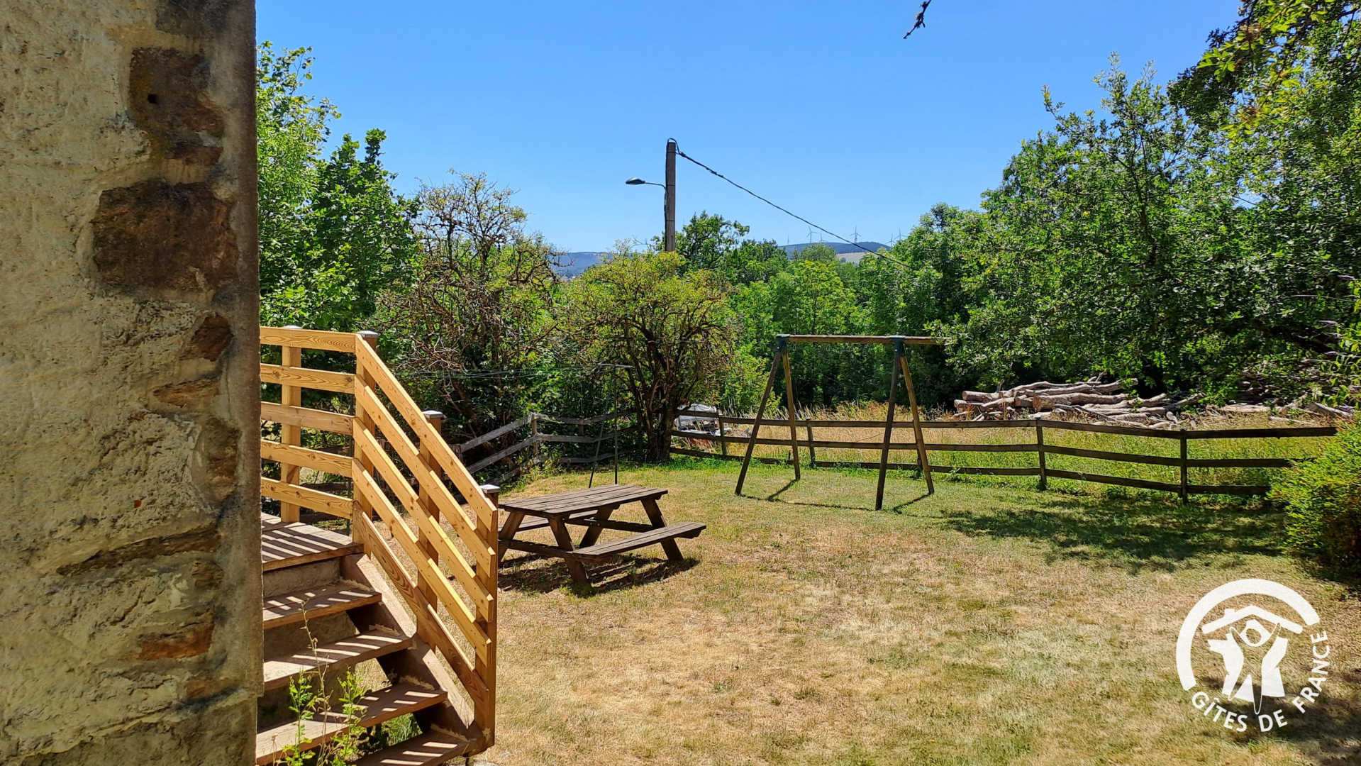 Independent gîte with enclosed garden, swing, play frame and garage.
