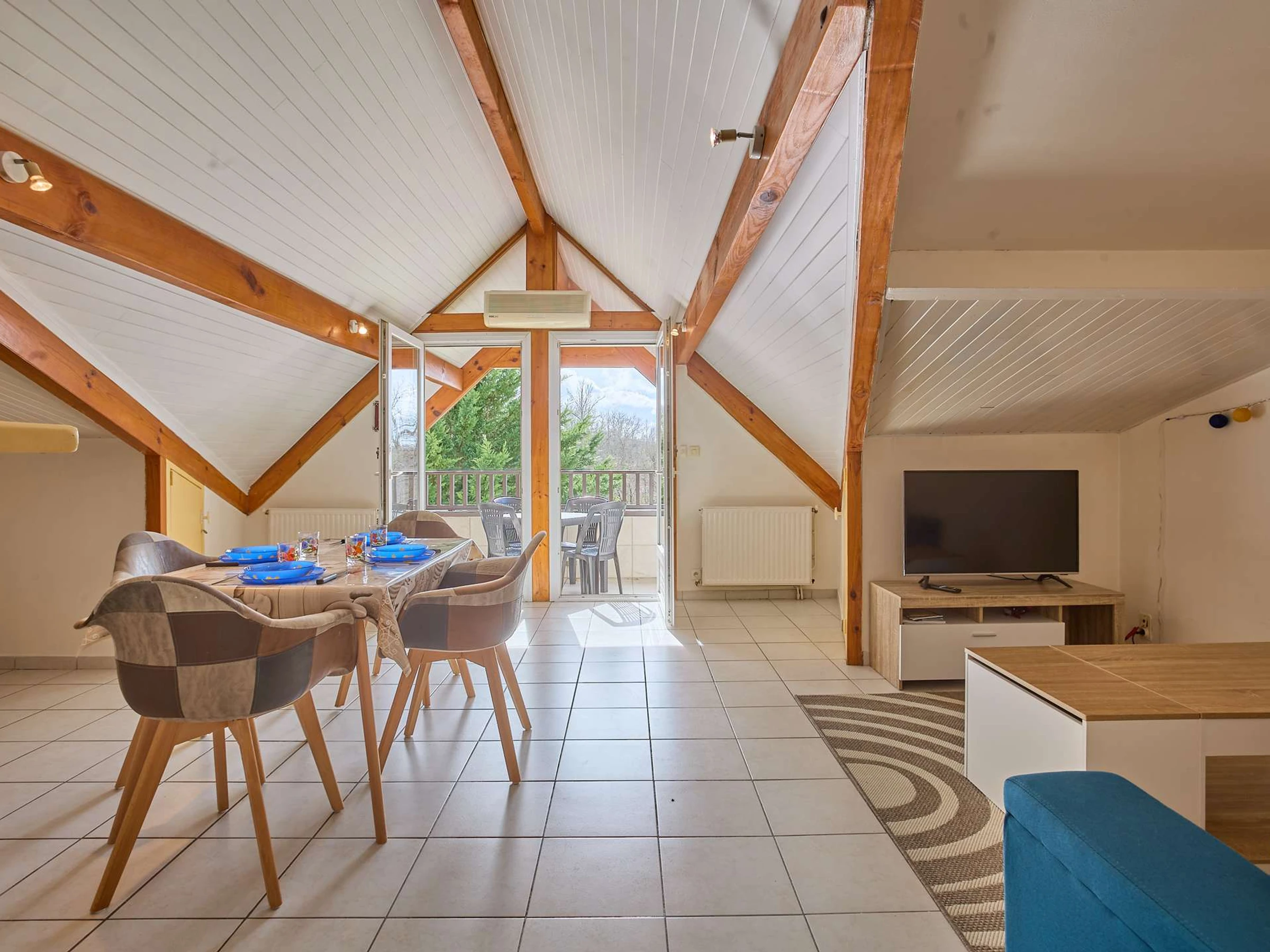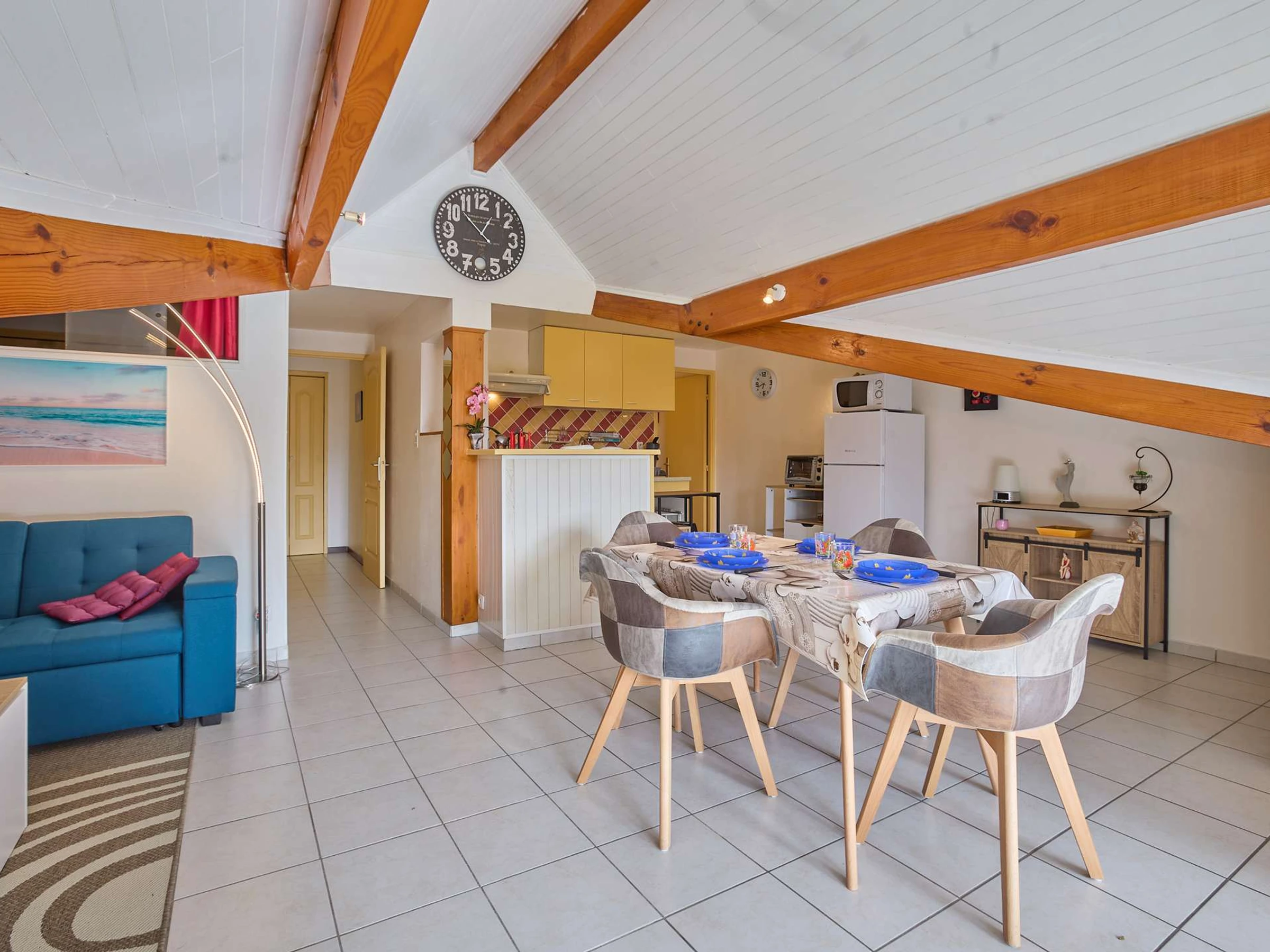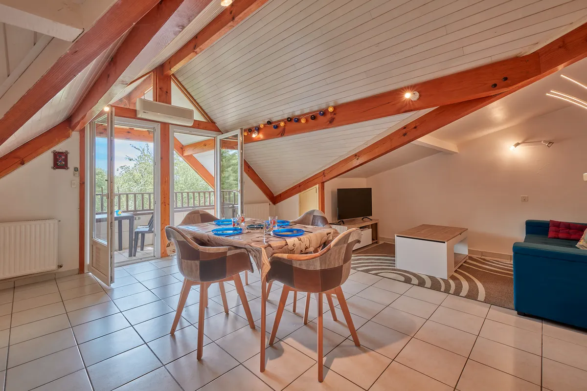 Située à 700 m du centre Thermal. Cette petite résidence avec parking, est constituée de seulement quatorze appartements, et sa situation au fond d’une impasse garantie sa tranquillité. Ce spacieux T2 cabine mansardée de plus de 45 m² est situé au second étage de la résidence des Ormes, et offre une vue dégagée sur la nature avec son exposition au sud. Sa grande pièce à vivre intègre une cuisine ouverte équipée de 4 plaques de cuisson, d’un réfrigérateur-congélateur, d’un micro-ondes, d’un mini-four et d’un lave-vaisselle, une partie salon avec canapé et téléviseur, une table à manger avec 4 chaises, un buffet. Cette dernière est éclairée par une porte fenêtre, s’ouvrant sur un balcon exposé au sud, offrant un salon de jardin, et deux bains de soleil et une plancha. Sa chambre mansardée avec un lit en 140 cm (petit dressing), une seconde chambre cabine avec un lit gigogne de 90 cm et un placard de rangement. Sa salle d’eau offre une cabine de douche et un vasque sur meuble et son lave-linge. Ses WC sont indépendants. Parking et Wifi gratuit. Caution 150 € demandée à l’arrivée