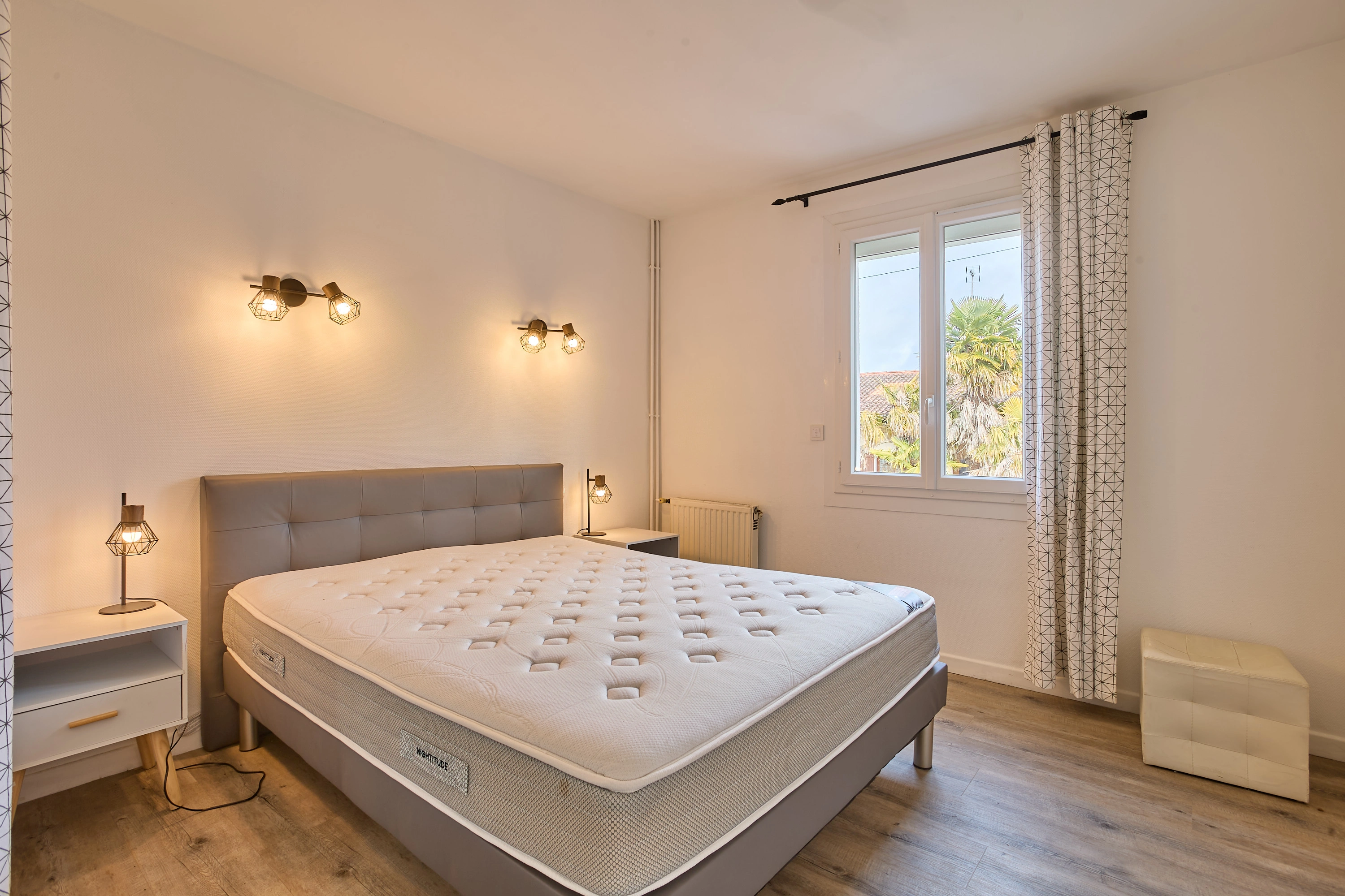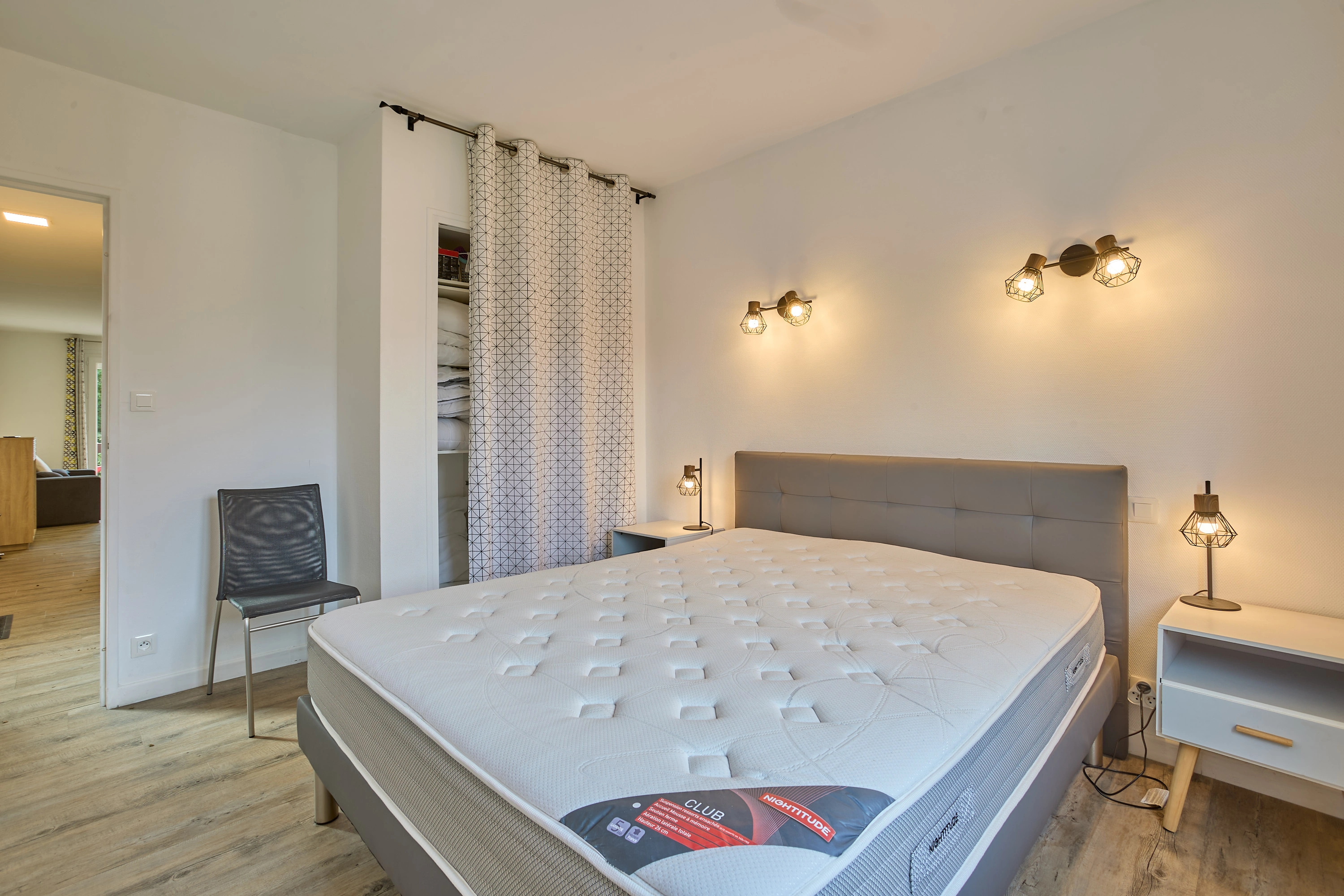 La chambre dispose d’un lit double (160 cm) et d’un grand placard de rangement.