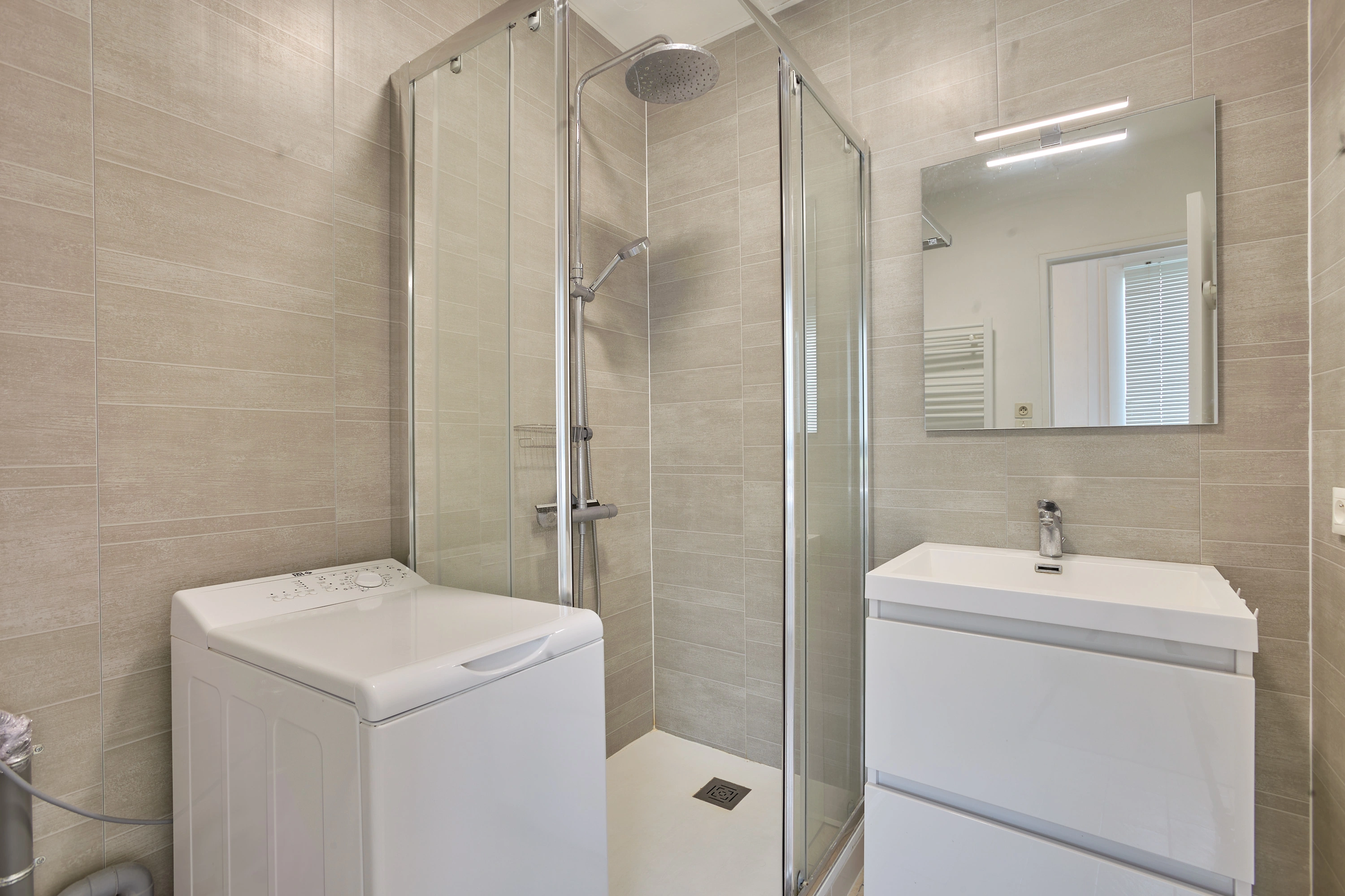 La salle d’eau est équipée d’une cabine de douche, d’un lavabo et d’un lave-linge. Les toilettes sont indépendantes. Chauffage électrique