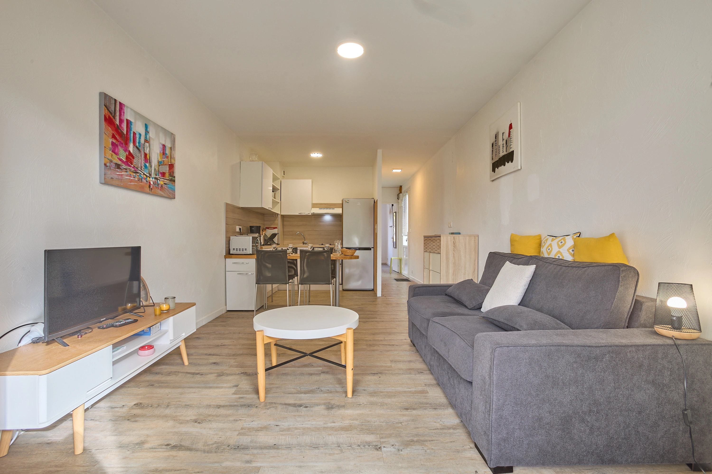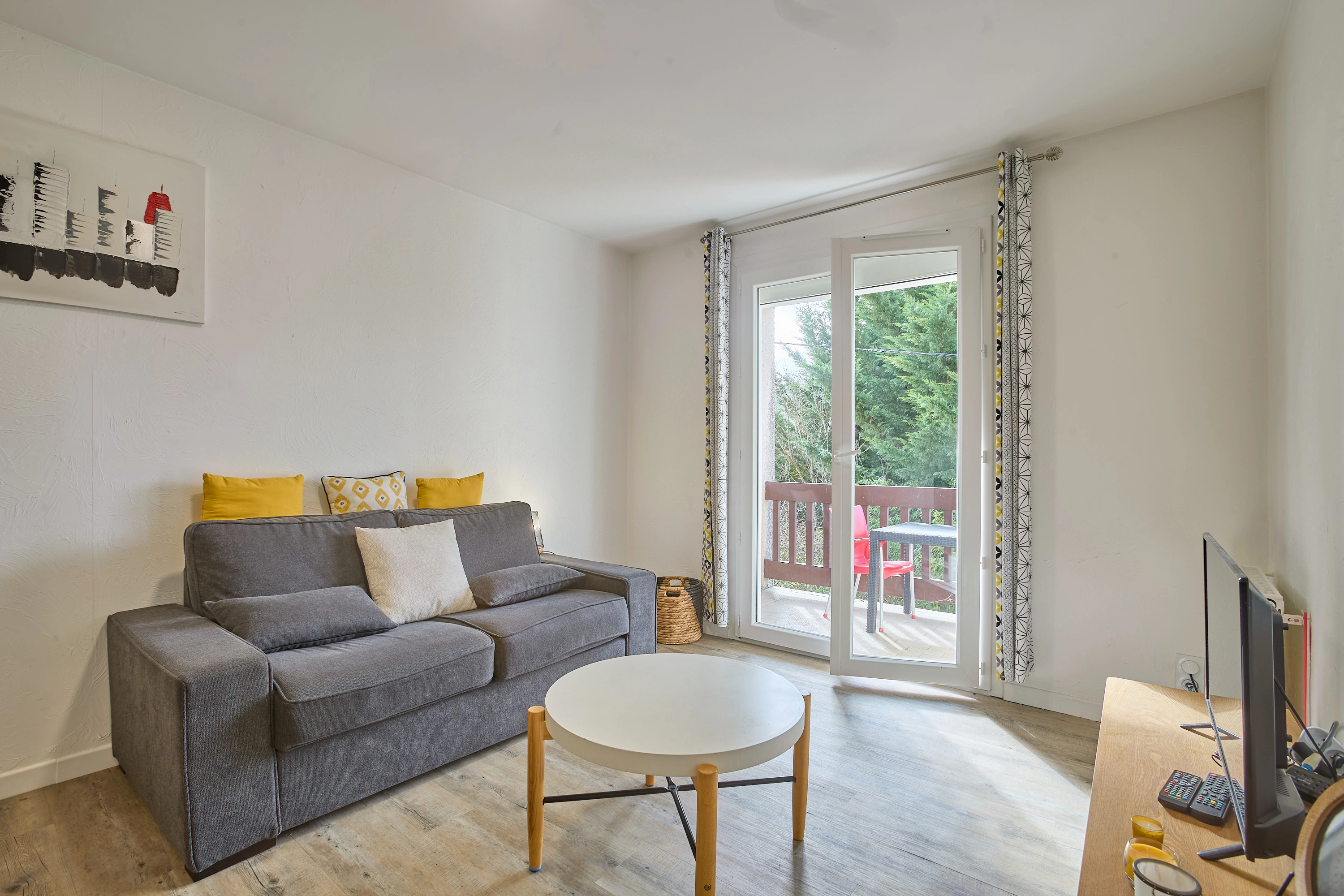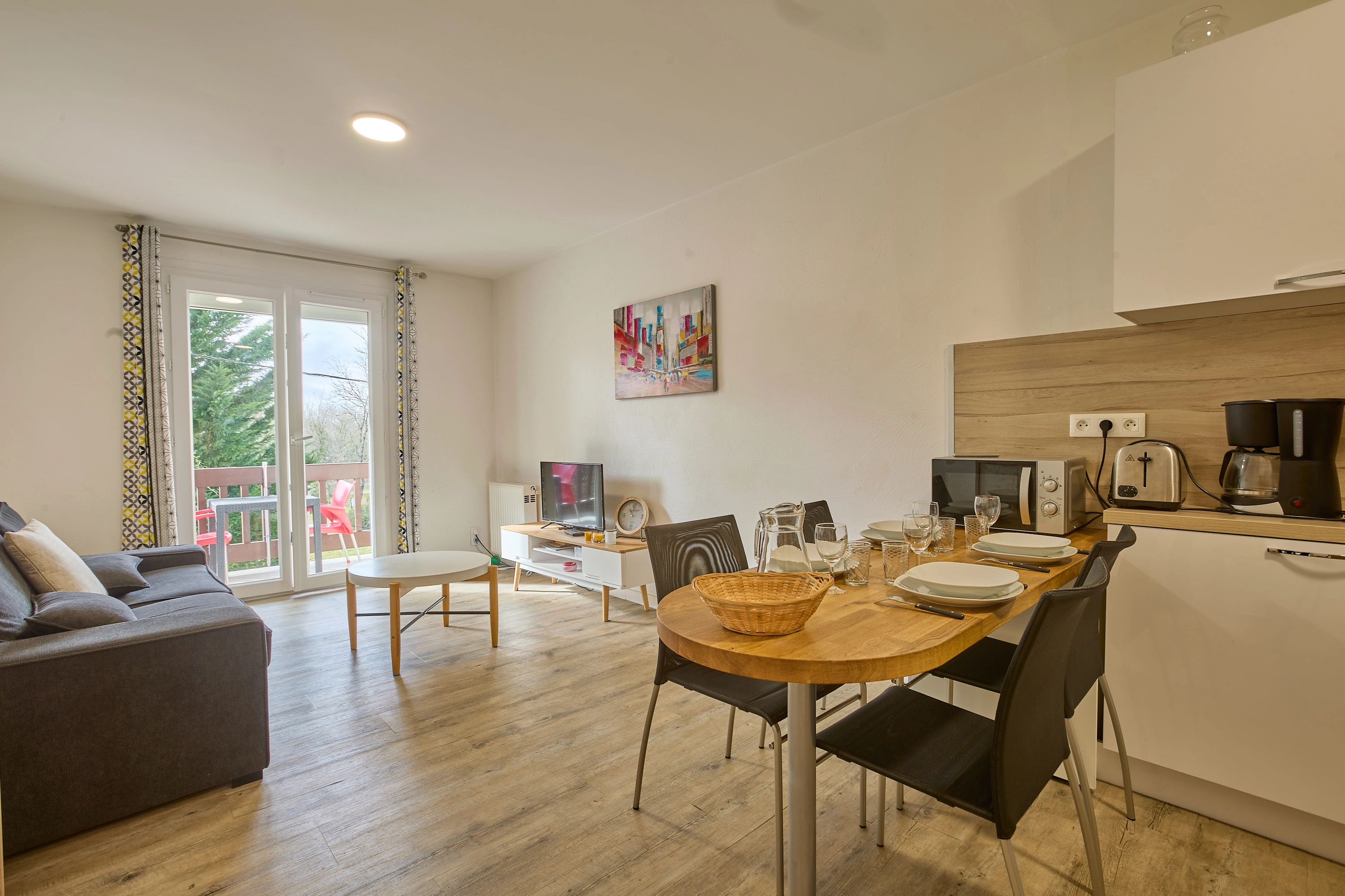 La grande pièce à vivre de 19 m² comprend une cuisine ouverte entièrement équipée (plaques vitrocéramiques, réfrigérateur-congélateur, lave-vaisselle, micro-ondes, mini-four), ainsi qu’un salon avec canapé convertible et téléviseur. Une porte-fenêtre apporte une belle luminosité et donne accès à un balcon exposé plein sud, aménagé avec un salon de jardin.
