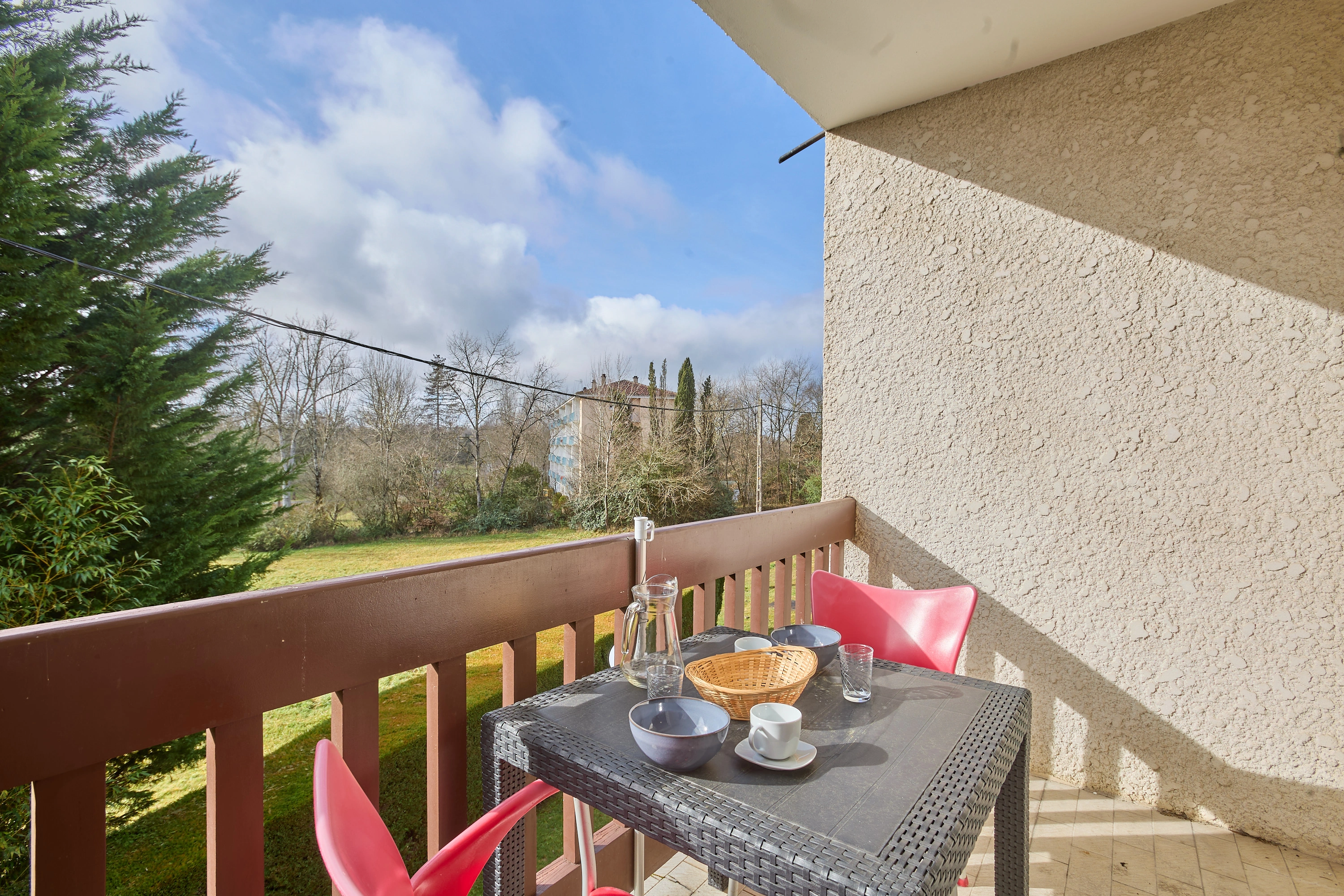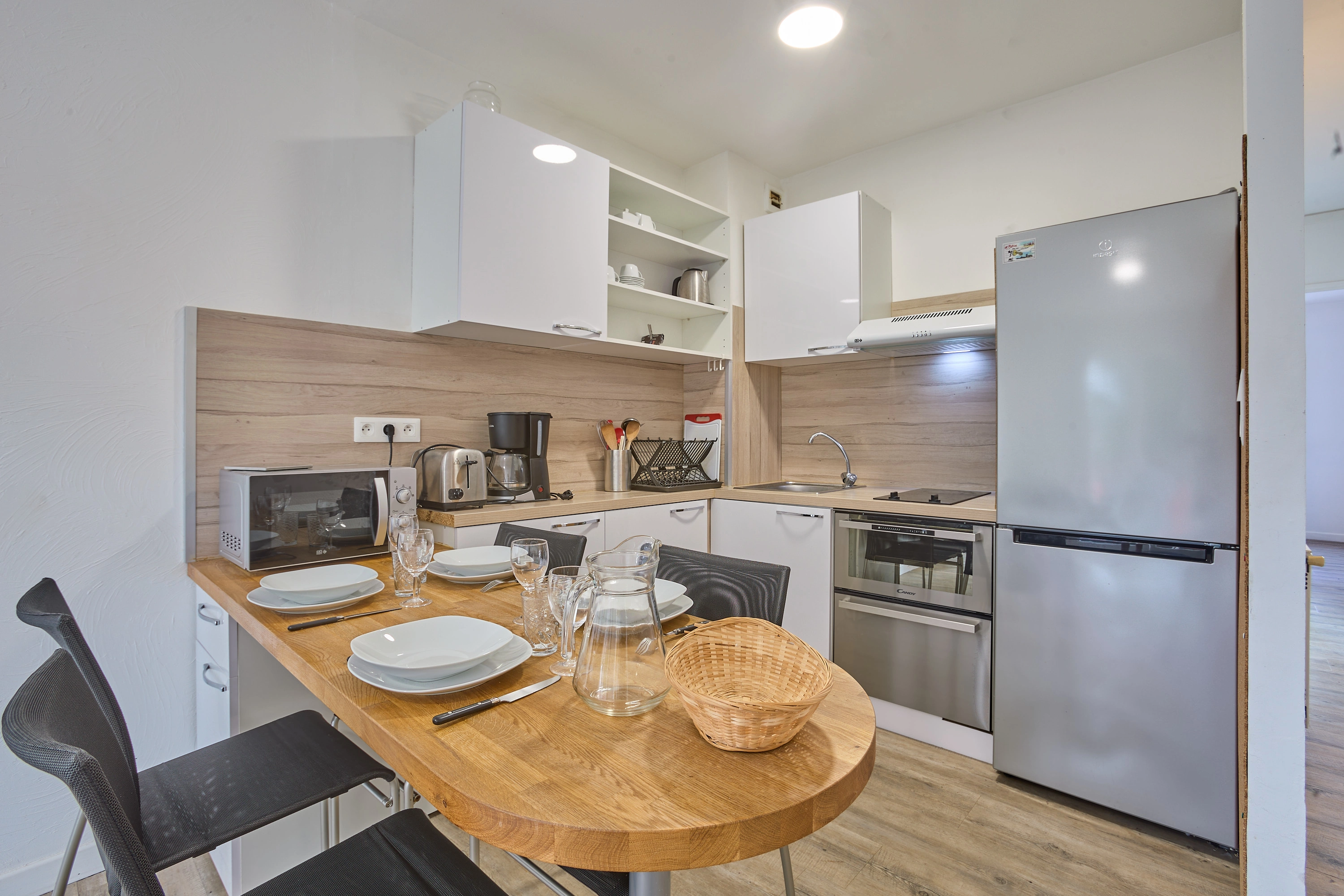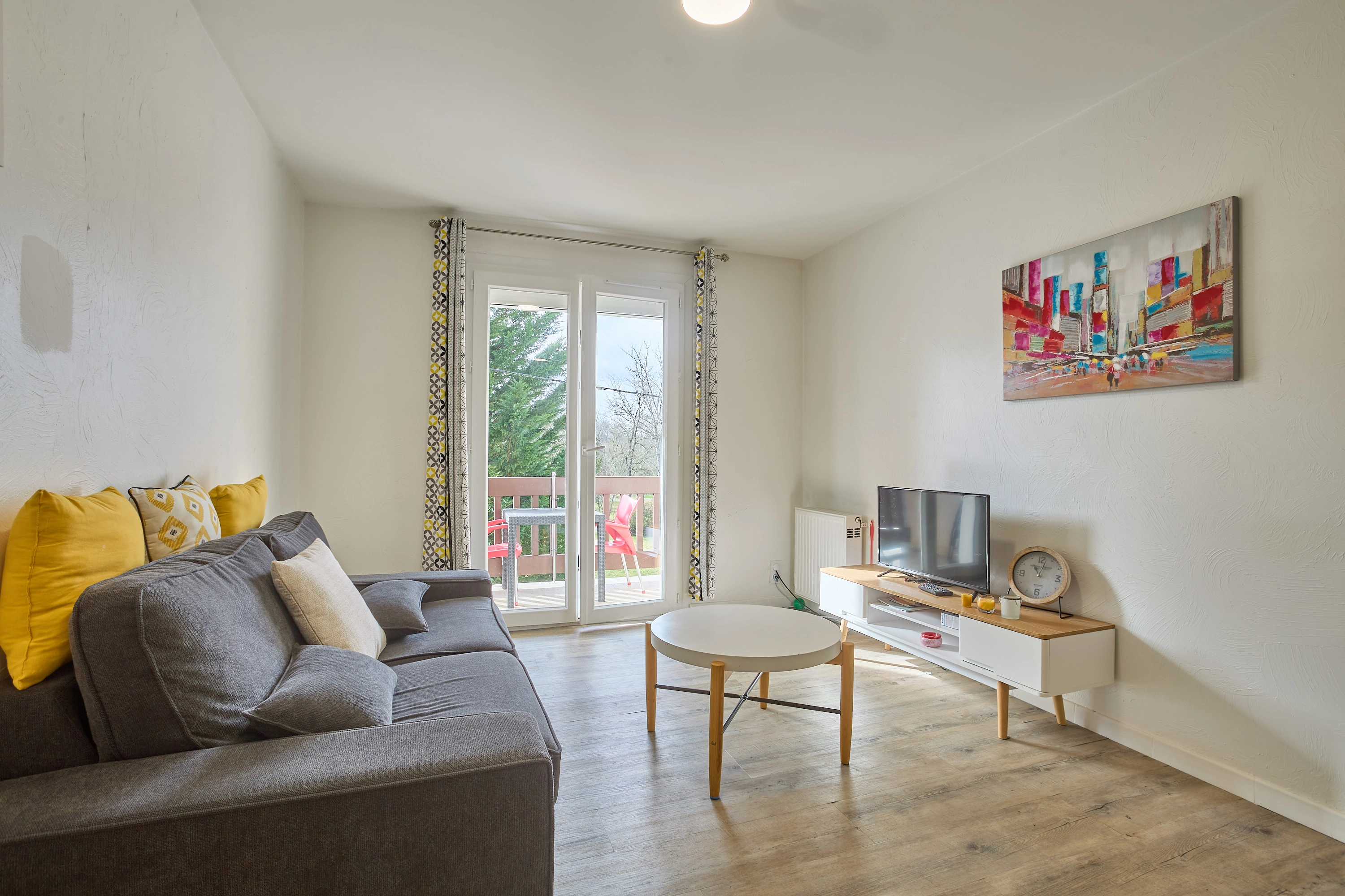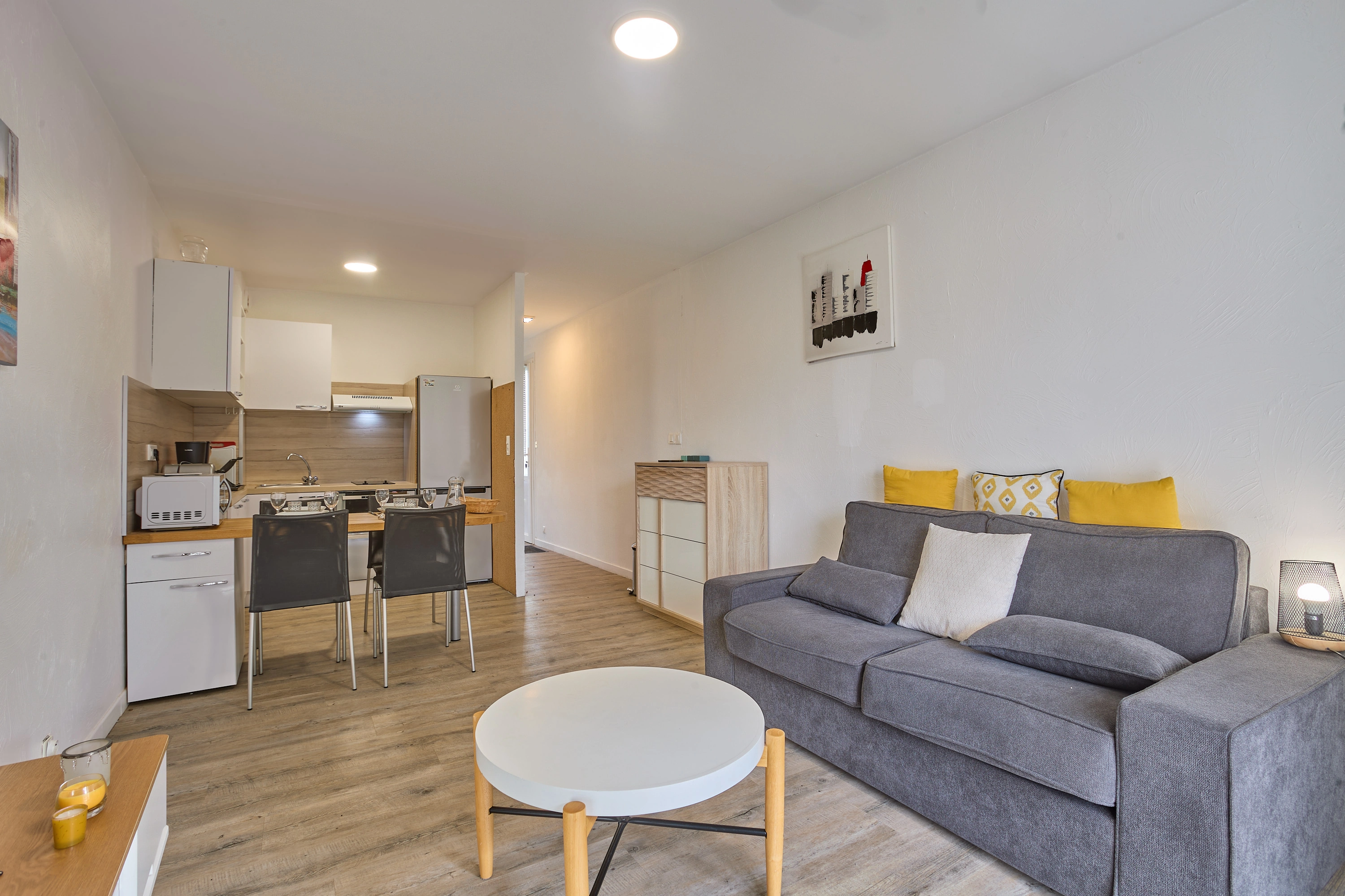 La grande pièce à vivre de 19 m² comprend une cuisine ouverte entièrement équipée (plaques vitrocéramiques, réfrigérateur-congélateur, lave-vaisselle, micro-ondes, mini-four), ainsi qu’un salon avec canapé convertible et téléviseur. Une porte-fenêtre apporte une belle luminosité et donne accès à un balcon exposé plein sud, aménagé avec un salon de jardin.