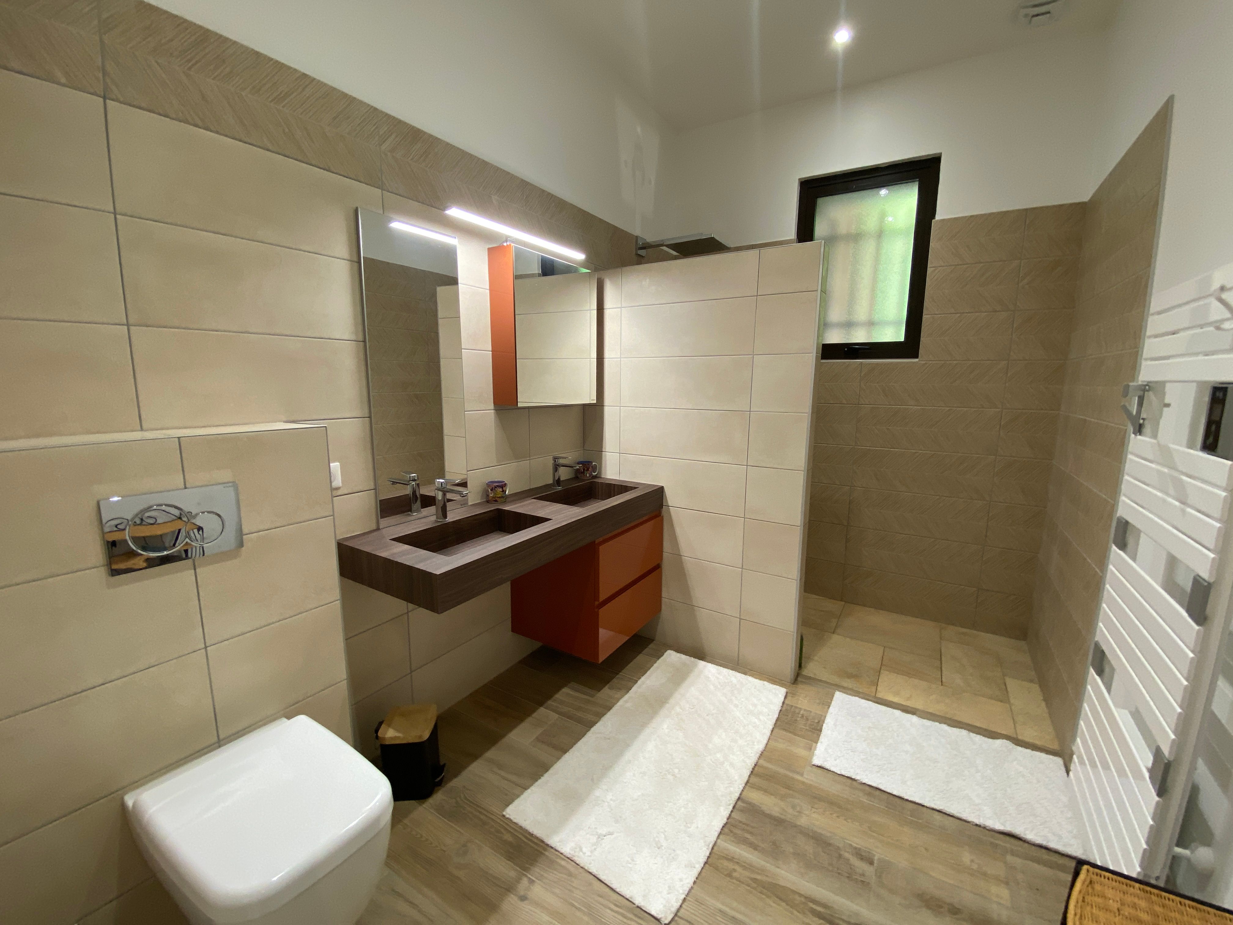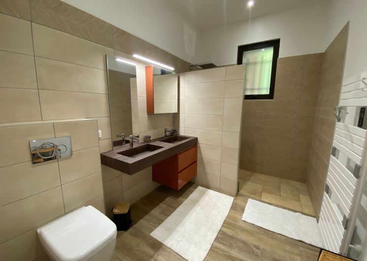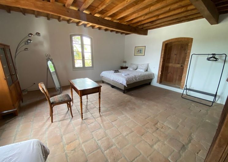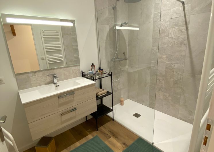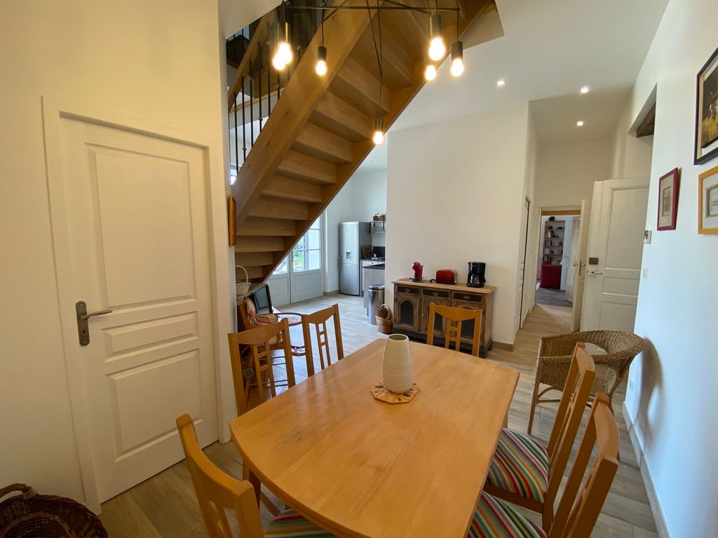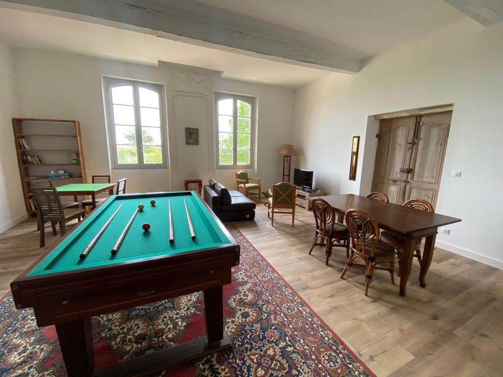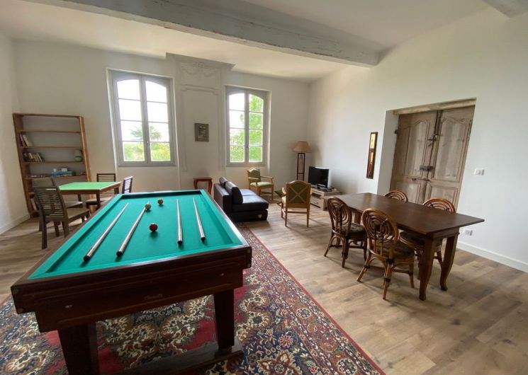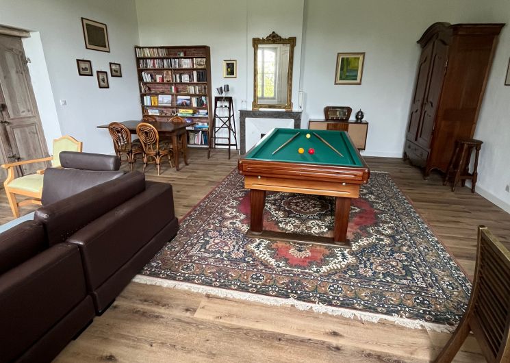 The ground floor comprises a kitchen (fitted units, oven, fridge, freezer, hob, dishwasher), with flexible dining area, pantry (washing machine, additional fridge). One bedroom (1 x 200cm bed, 1 x 0.90cm bed), shower room with wc. A lounge/library (2 sofas, one of which converts to 160cm, armchairs), 1 separate WC (washbasin). Dining room (table, chairs, sitting area). 1st floor: 1 bedroom (1 x 200cm bed, 1 x 160cm bed), shower room and separate toilet. 1 bedroom (3 single beds 0.90 x 200), with access to a shower room and separate toilet. At the top of the stairs, a reading area and children’s play area (BZ 130 x 190). Huge games room with pool table, games table, TV area and books. Wifi throughout. Terrace with garden furniture and lounge. Barbecue. Parasol. Swimming pool shared with the owner, sun loungers, deckchairs. Enclosed indoor parking.