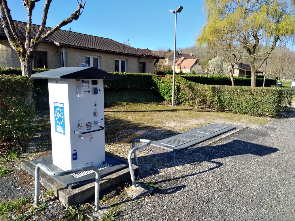 Bornes multi-services Eurorelais Box avec eau potable, rinçage et vidange wc, prise électrique. Éclairage automatique. Jetons disponibles à l’épicerie, à l’Auberge et à la mairie.