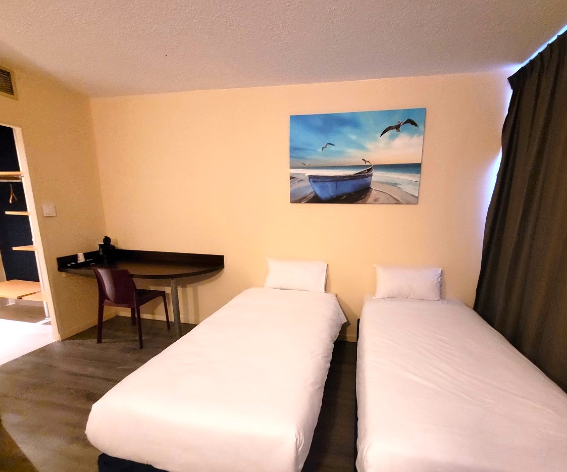 Klimatisiertes, vollständig renoviertes Hotel, gegenüber dem Parc Expo und der Arena, 3 km vom Flughafen und 4 km von den Stränden und Montpellier entfernt. 74 Zimmer. Kostenloser WLAN-Zugang, Kanal +, Parkplatz, Haustiere erlaubt (5 Euros)