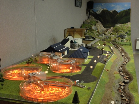 Dieses Modell gibt die gesamte Funktionsweise der Kläranlage wieder und erklärt mithilfe eines Soundtracks die verschiedenen Schritte der Abwasserreinigung