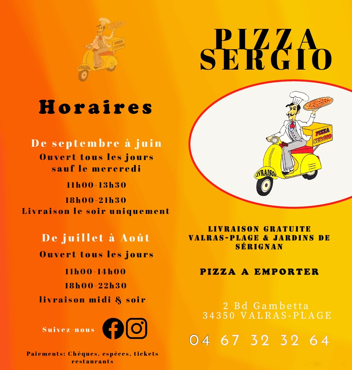 Pizza Sergio ist eine Pizzeria, die eine Küche mit frischen und lokalen Produkten anbietet. und eine große Auswahl an Pizzen. Die Lieferung nach Hause ist in Valras-Plage und den Gärten von Sérignan abends das ganze Jahr über und mittags und abends im Juli/August möglich.
