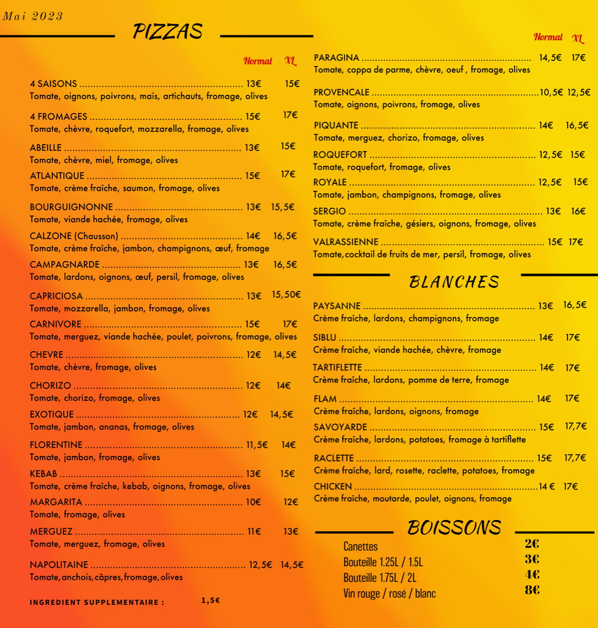 Pizza Sergio ist eine Pizzeria, die eine Küche mit frischen und lokalen Produkten anbietet. Es wird Ihnen eine große Auswahl an Pizzen angeboten. Die Lieferung nach Hause ist in Valras-Plage und den Gärten von Sérignan abends das ganze Jahr über und mittags und abends im Juli/August möglich.