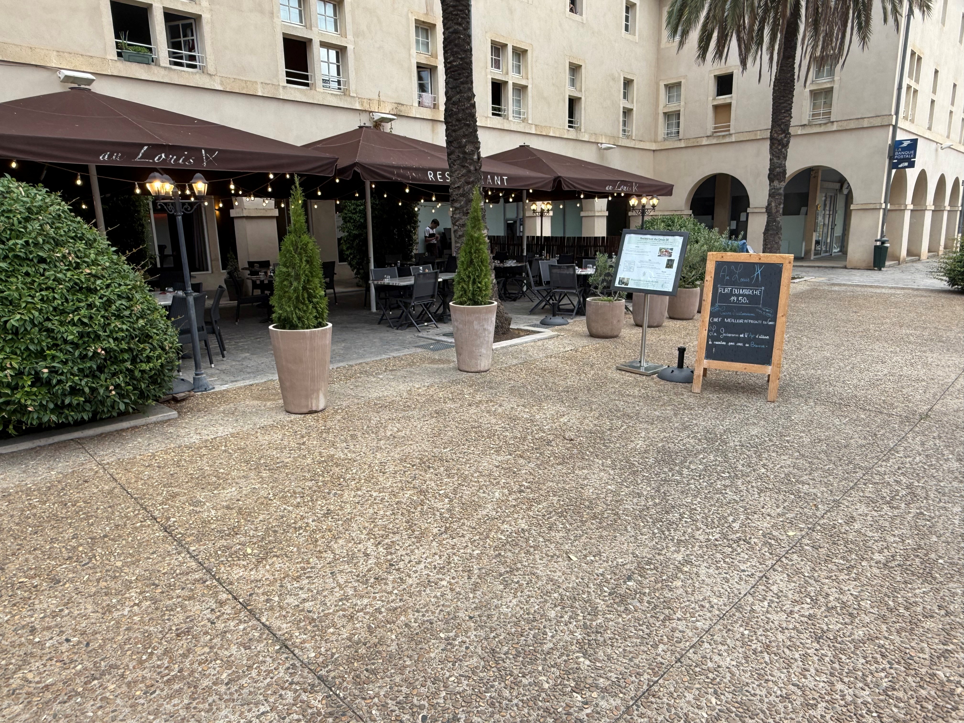 Au Louis IX ist ein Restaurant mit südländischen Aromen, das an einem ruhigen Platz innerhalb der Stadtmauern von Aigues-Mortes liegt.