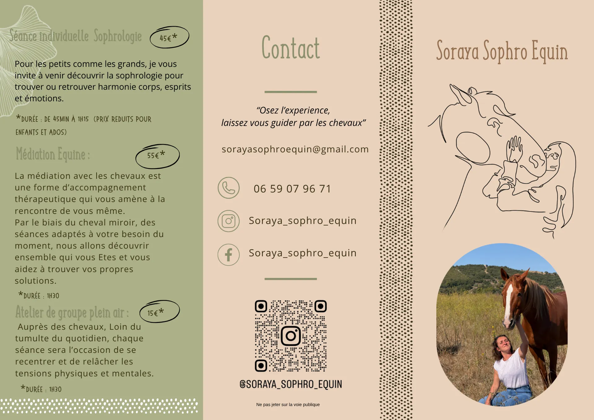 Je propose des séances de sophrologie et de médiation équine, pour accompagner chacun vers plus d’équilibre, de sérénité et d’amour de soi. Je propose des séances individuelles et en groupe, des ateliers à thèmes d’1 à 2 h et des stages demi journée ou journée.