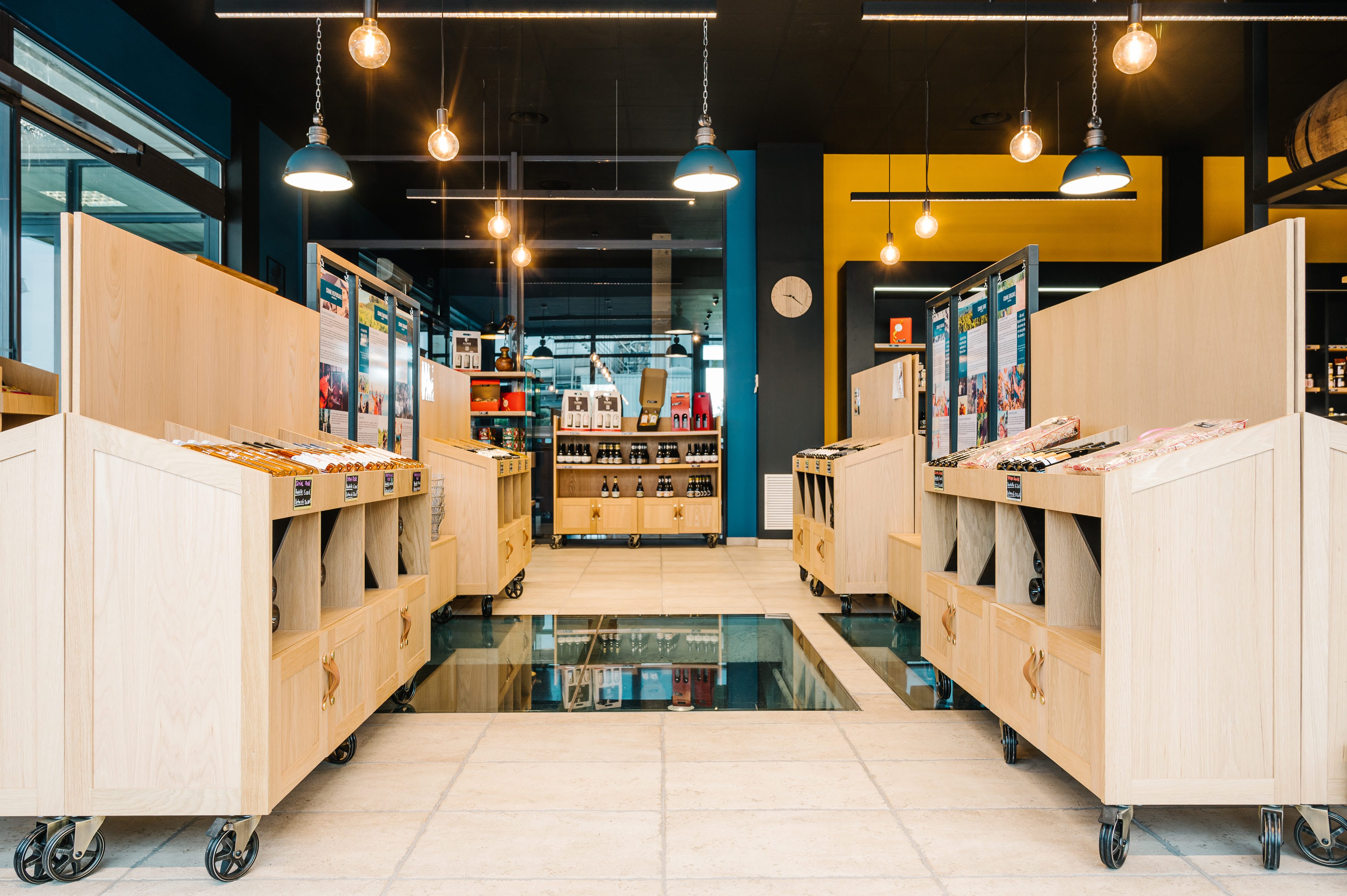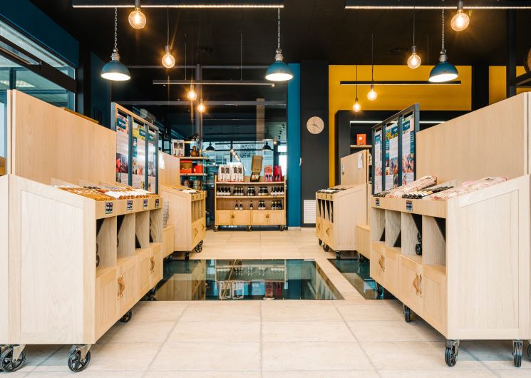The tasting and shop area is built around a modern wine cellar, offering a selection of wines, local produce and souvenirs.