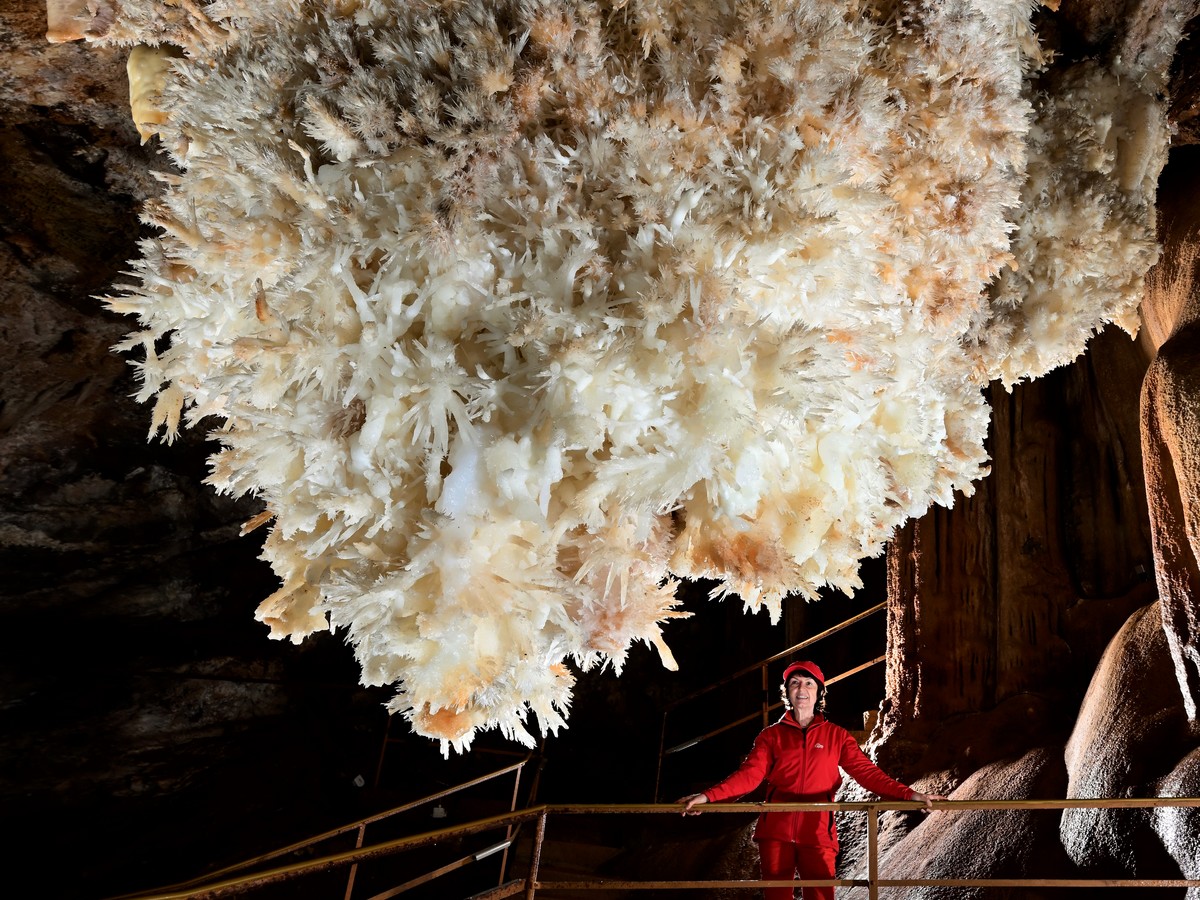 Explore 7 extraordinary rooms and 2 lakes with magical reflections on an easy 1-km path. One-hour guided tour. Carried pets accepted, photos and videos authorised, shop, snack bar, toilets, picnic area. Free audio guide. The temperature in the cave is 14°C all year round, so don’t forget warm clothing, even in summer. Additional tours at 12.30pm in June and September. The first room was the cave bear’s refuge. The marks of their claws are still visible. Prehistoric man settled here from the Neolithic period and the caves were inhabited until the Middle Ages. The concretion of the following rooms is wonderful. At the end, a suspension bridge over a mirror of clear water leads you to the final show: the Aragonite “chandelier,” the largest set of aragonite crystals in the world, enhanced by a play of light. A true wonder of nature!