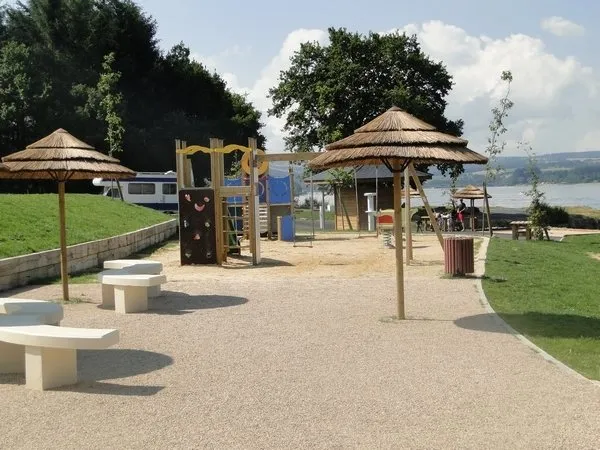 Beach Vernhes, in Salles Curan, monitored from mid July to end of August. Coarse sand and lawn Picnic tables on the shores of the lake, to the right the monitored beach, beach volley ground, hard table tennis table, child games. Car park Sanitary facilities (showers and toilet). The shops await you: snack bar, restaurant, boat trips, boat, pedalo hire …