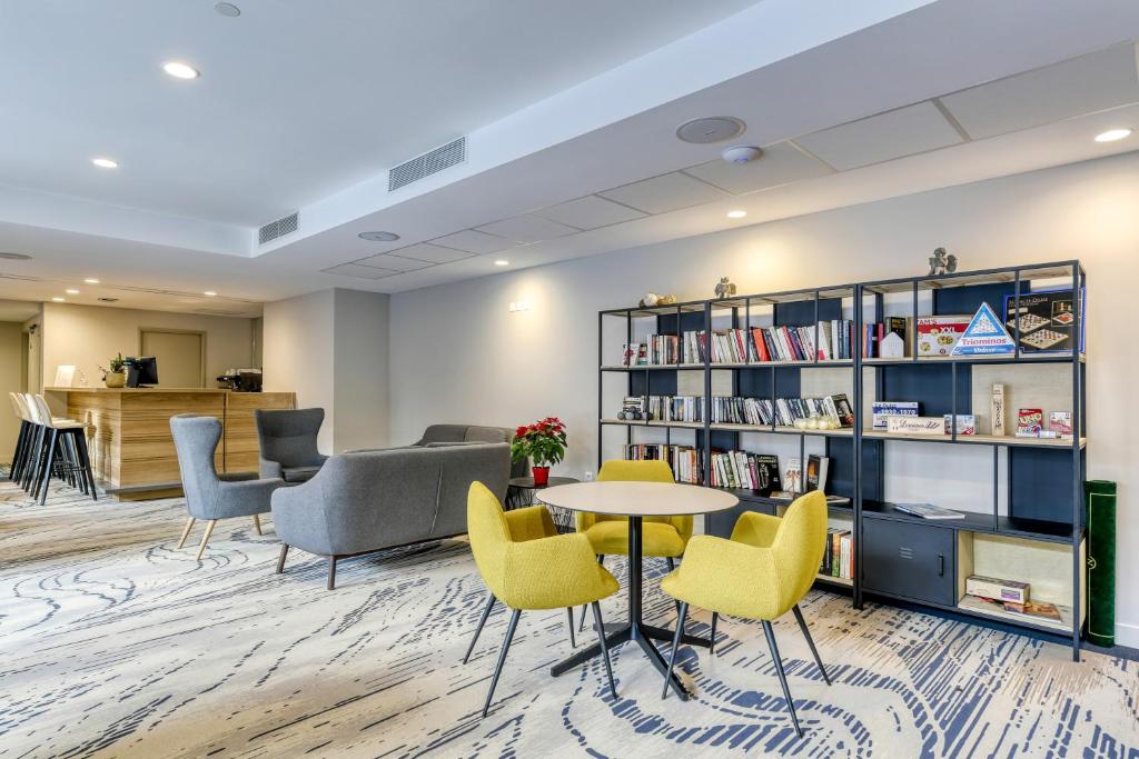 Our residence is made of studio and one-bedroom apartments, all our accommodations have a terrace, an equipped kitchen, a walk-in shower and offers quality equipment. Wi-Fi is available throughout the residence, and you will have free access to the fitness room, the library, the bowling alley and the pool table. Secure parking, with an additional cost, is at your disposal, as well as a restaurant in the heart of a green patio for lunch in peace.