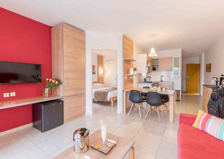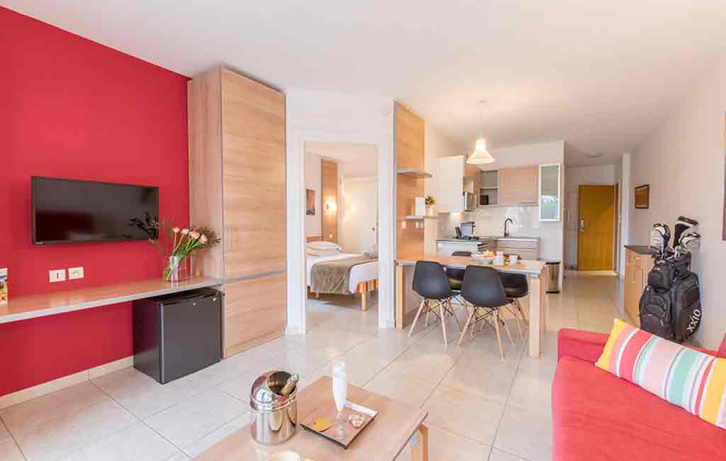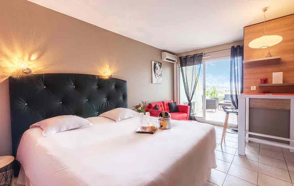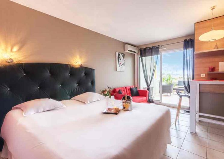 56 luxury apartments from studio to 3-room with terrace or loggia. Reversible air conditioning, satellite TV and fully equipped kitchen.