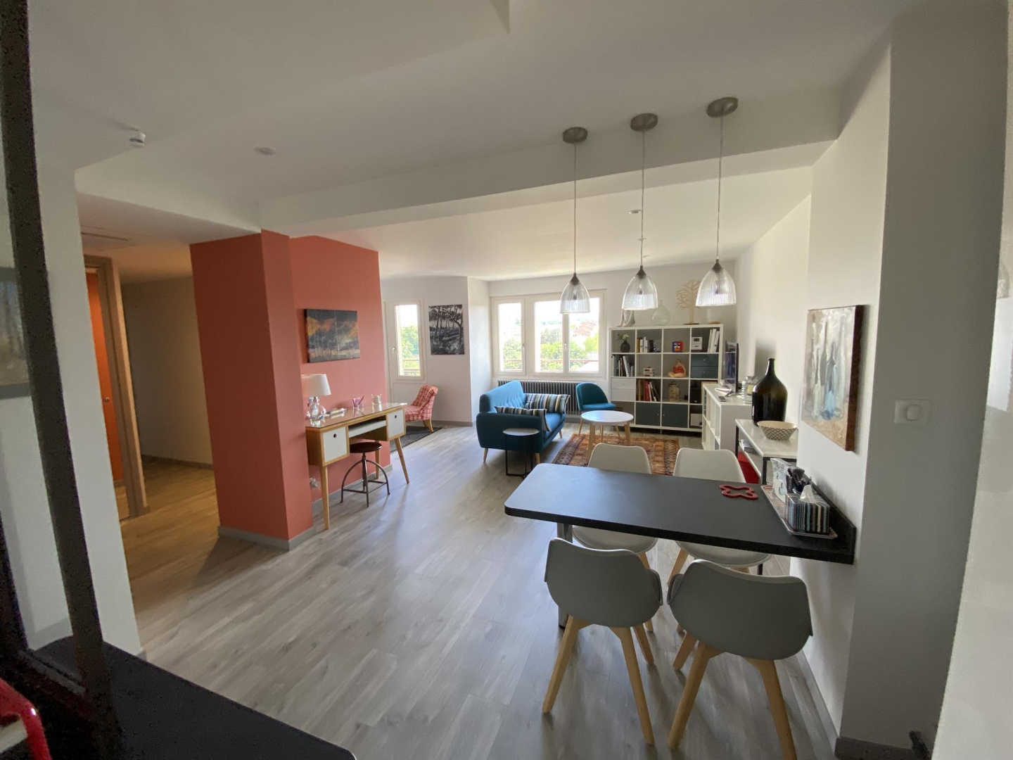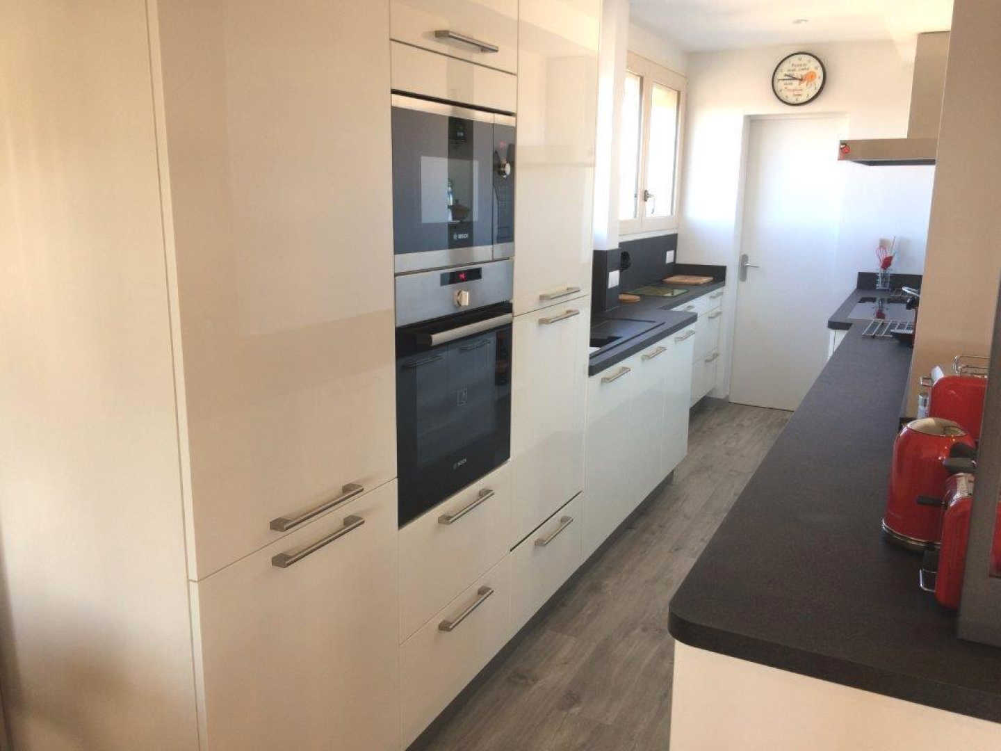 Depuis l’entrée, une grande pièce à vivre, la cuisine ouverte parfaitement équipée et le salon qui donne accès au grand balcon.