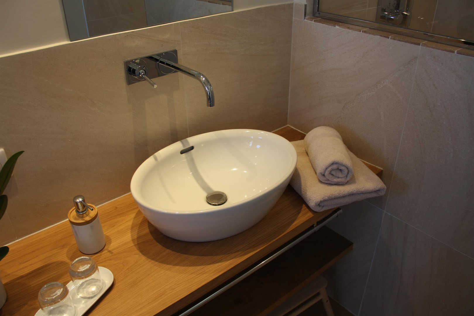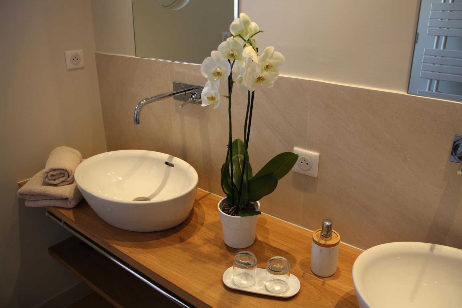 Notre suite, qui peut accueuillir jusqu’à 4 personnes, est située au 2ème étage de notre maison. On y accède par un bel escalier en pierre puis par un large couloir (7 m² – 2 fenêtres donnant sur le jardin et la piscine) équipé d’un bureau. Une première chambre de 25 m², lumineuse, double exposition dont une avec vue sur le jardin et la piscine et l’autre donnant sur la rue. Lit 160X200. Literie de qualité. Penderie et rangement. Téléviseur écran plat, machine à café Nespresso. Seconde chambre de 18 m², 2 lits de 90X190. Literie de qualité. Grande penderie et rangement. Vue sur la rue. Grande salle d’eau (6m²) avec éclairage naturel et vue côté cathédrale, double vasque. Vraie douche à l’italienne. WC suspendu indépendant. Charmant balcon/souleilhou donnant sur la rue côté cathédrale.