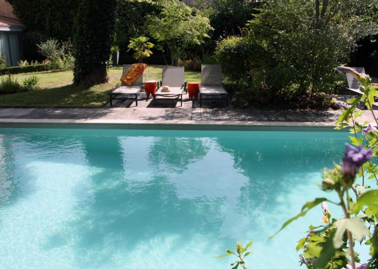 Piscine partagée (10×4,5m), chauffée et traitée au sel, avec plage-enfants, à disposition du 30 mai au 27 septembre.