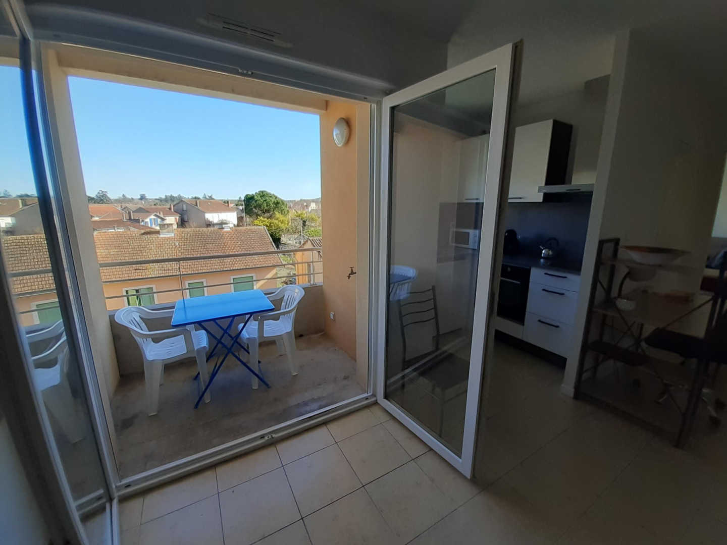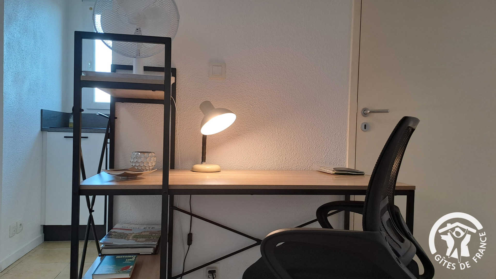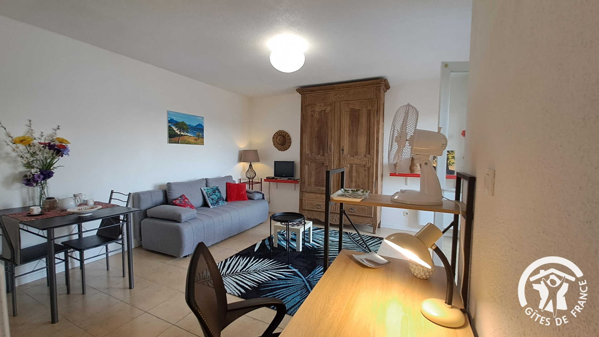 Séjour (avec tv, bureau), coin cuisine équipé : réfrigérateur, plaque à induction, four, micro-ondes, cafetière…