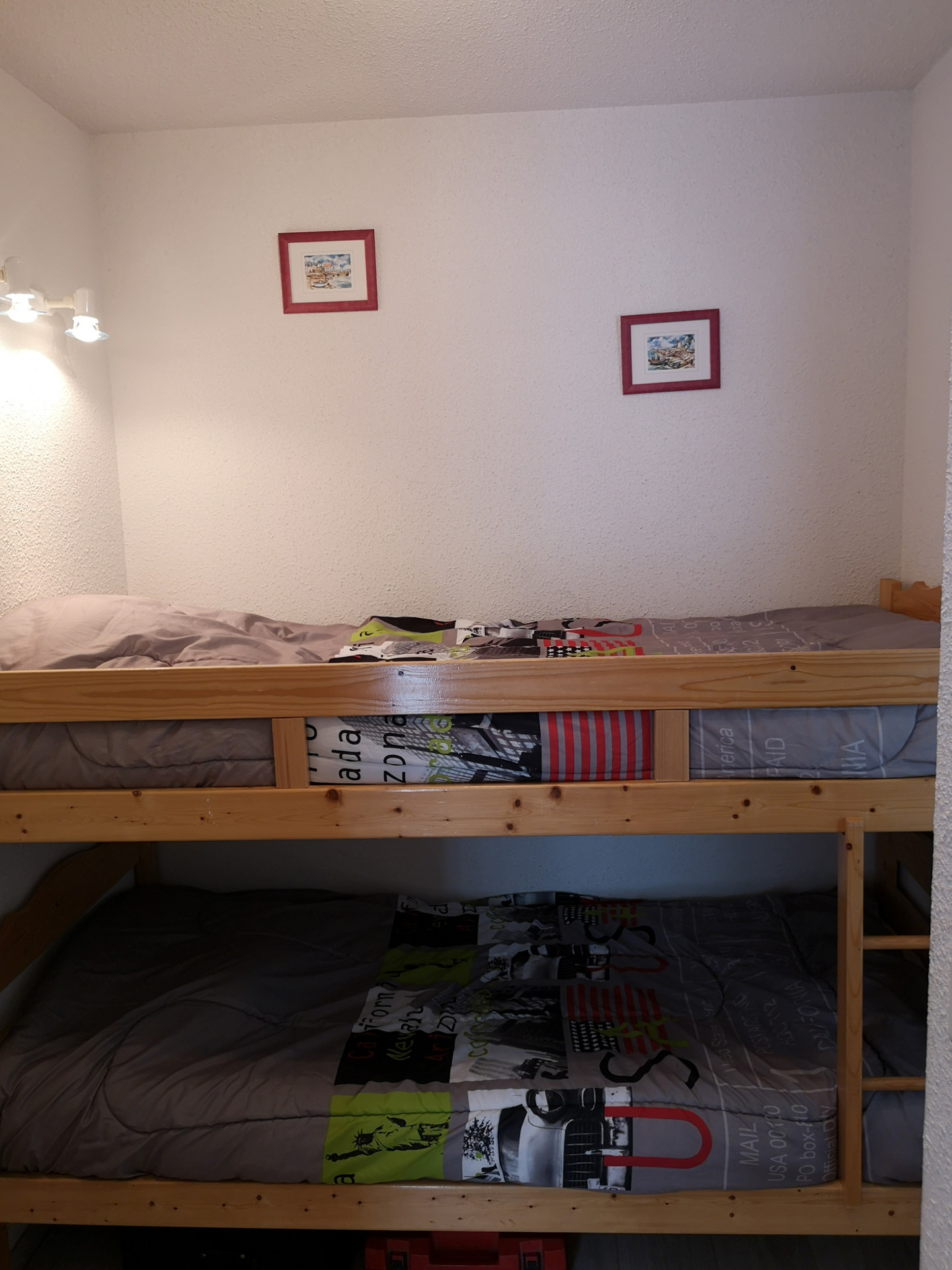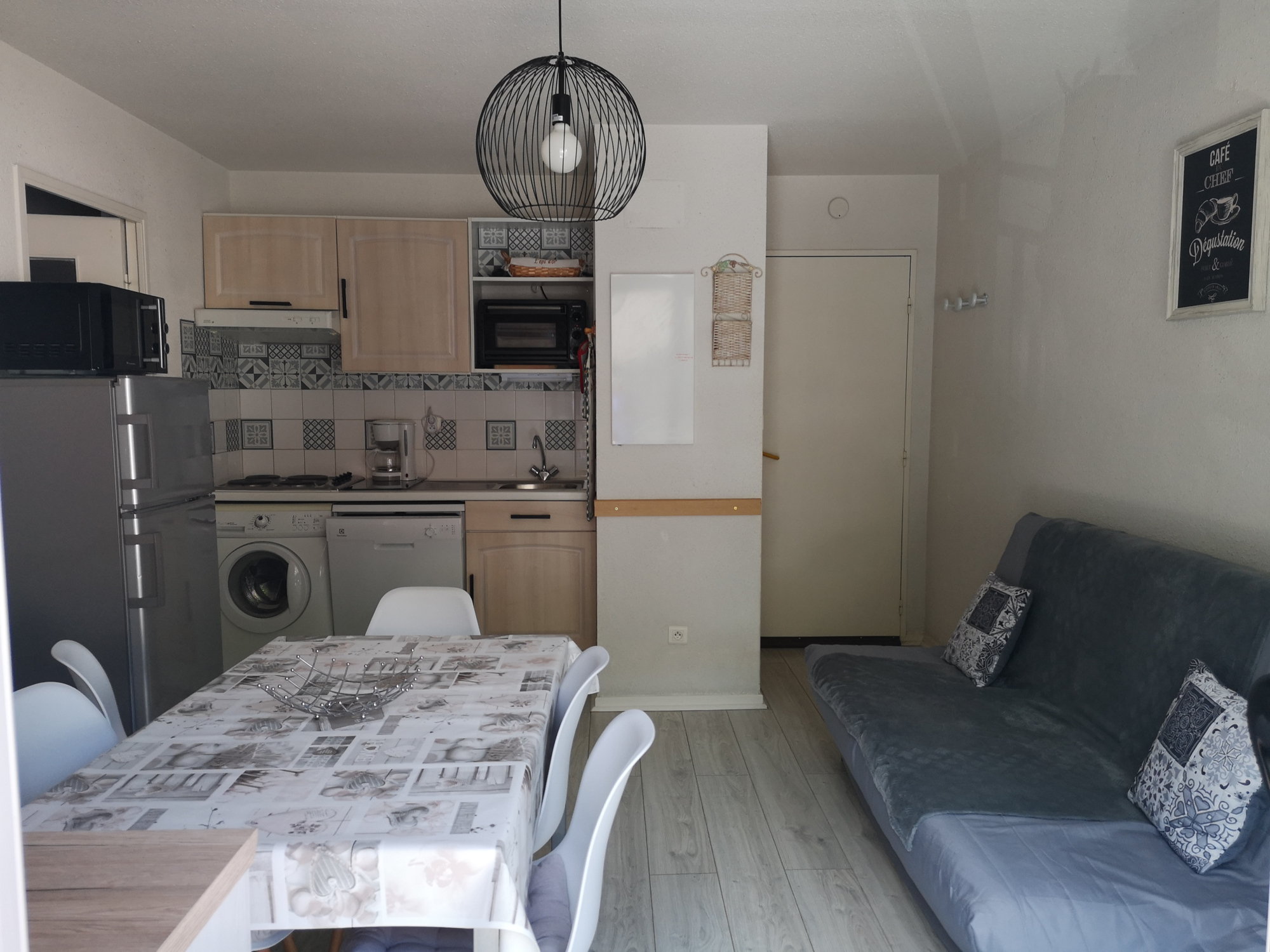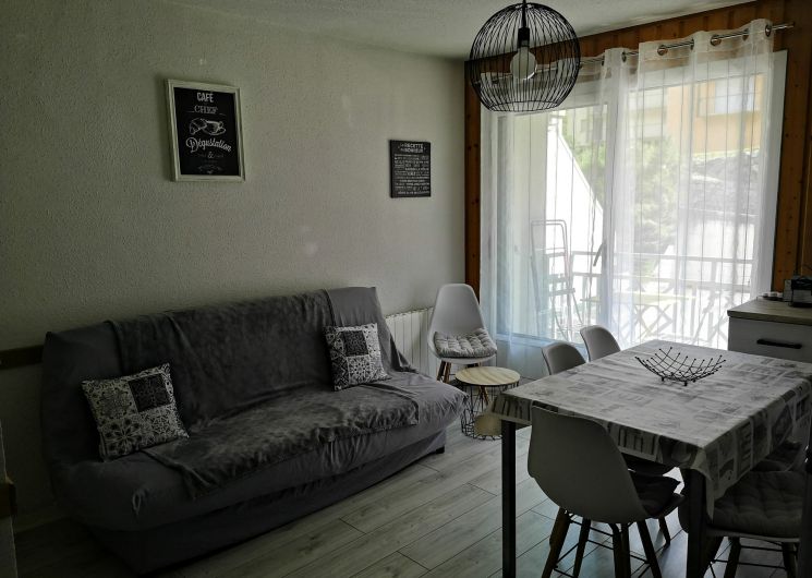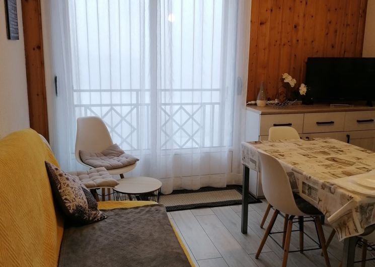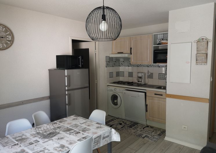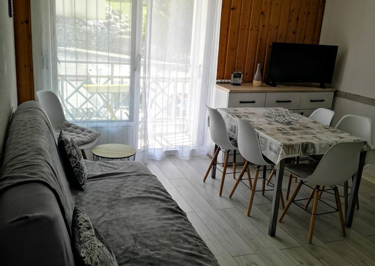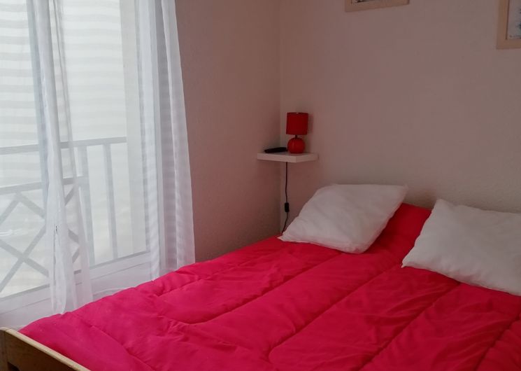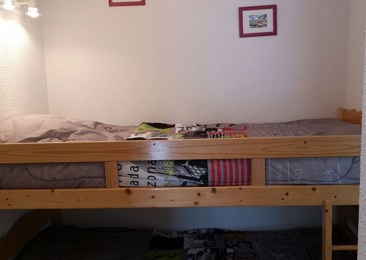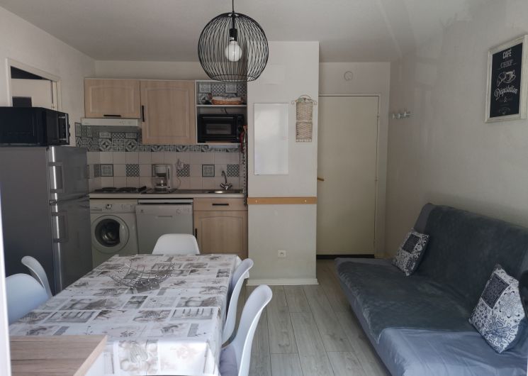 An equipped kitchenette, a bright living room with sofa bed (2 people), a bedroom (1 bed 140 and TV), a sleeping area (2 bunk beds 90), a bathroom (bathtub) and an independent toilet.