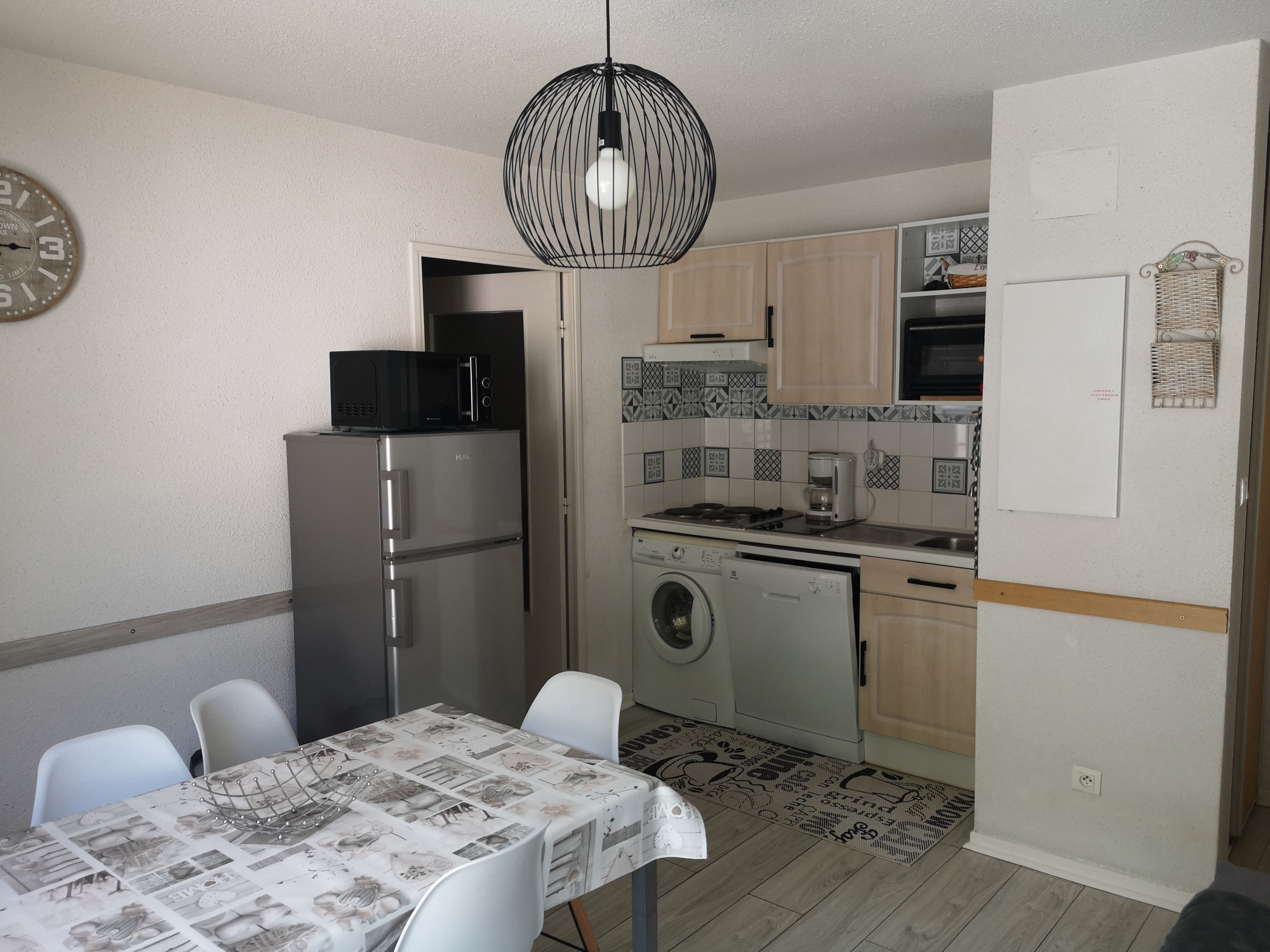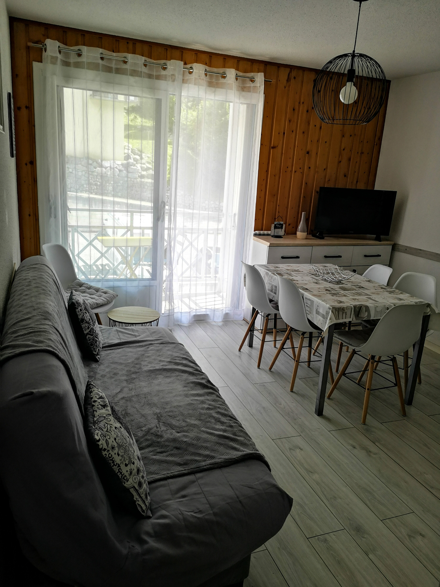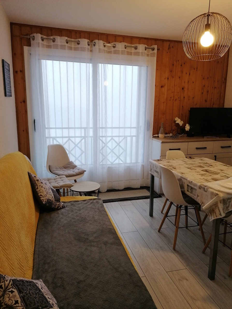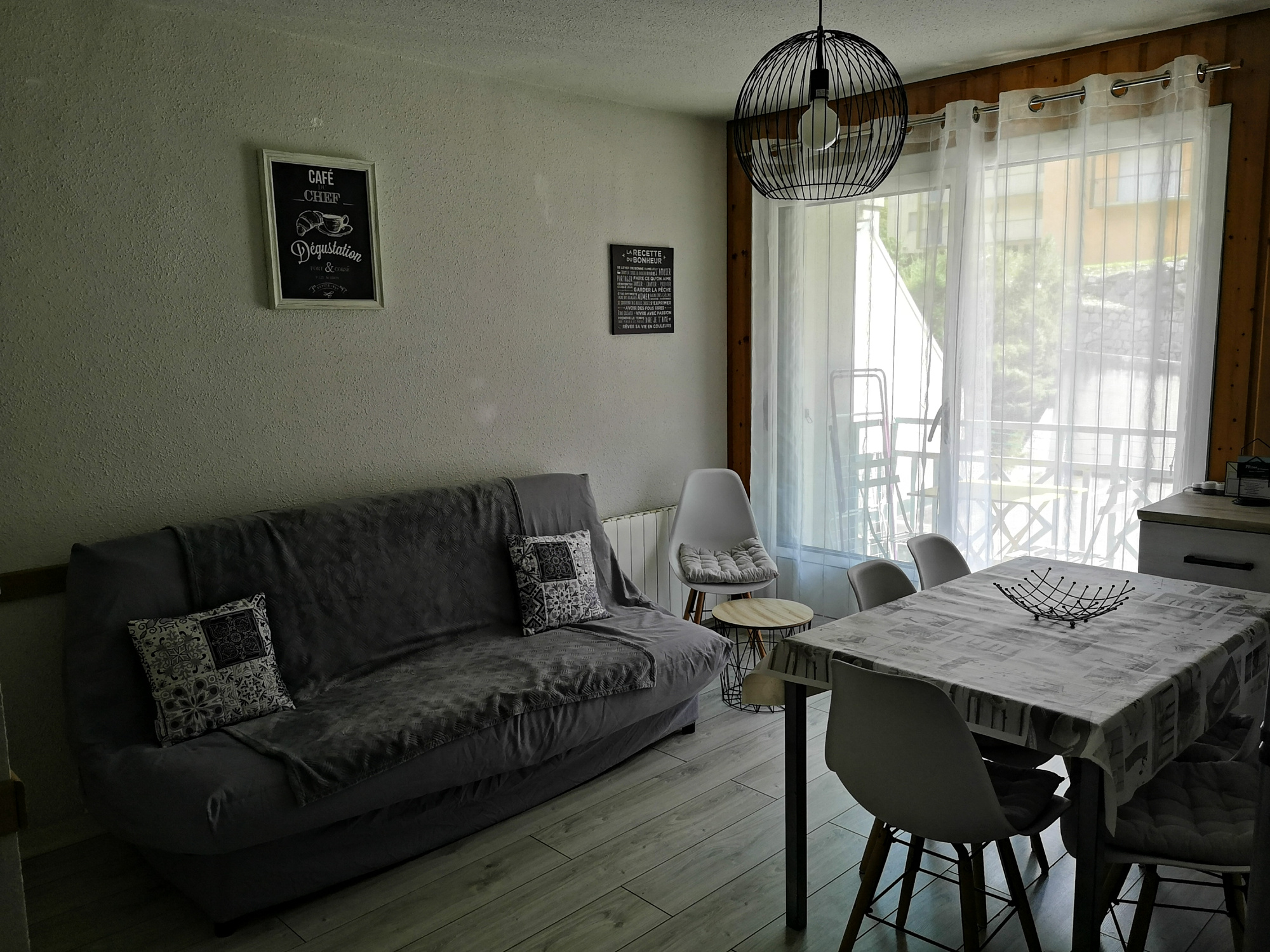 An equipped kitchenette, a bright living room with sofa bed (2 people), a bedroom (1 bed 140 and TV), a sleeping area (2 bunk beds 90), a bathroom (bathtub) and an independent toilet.