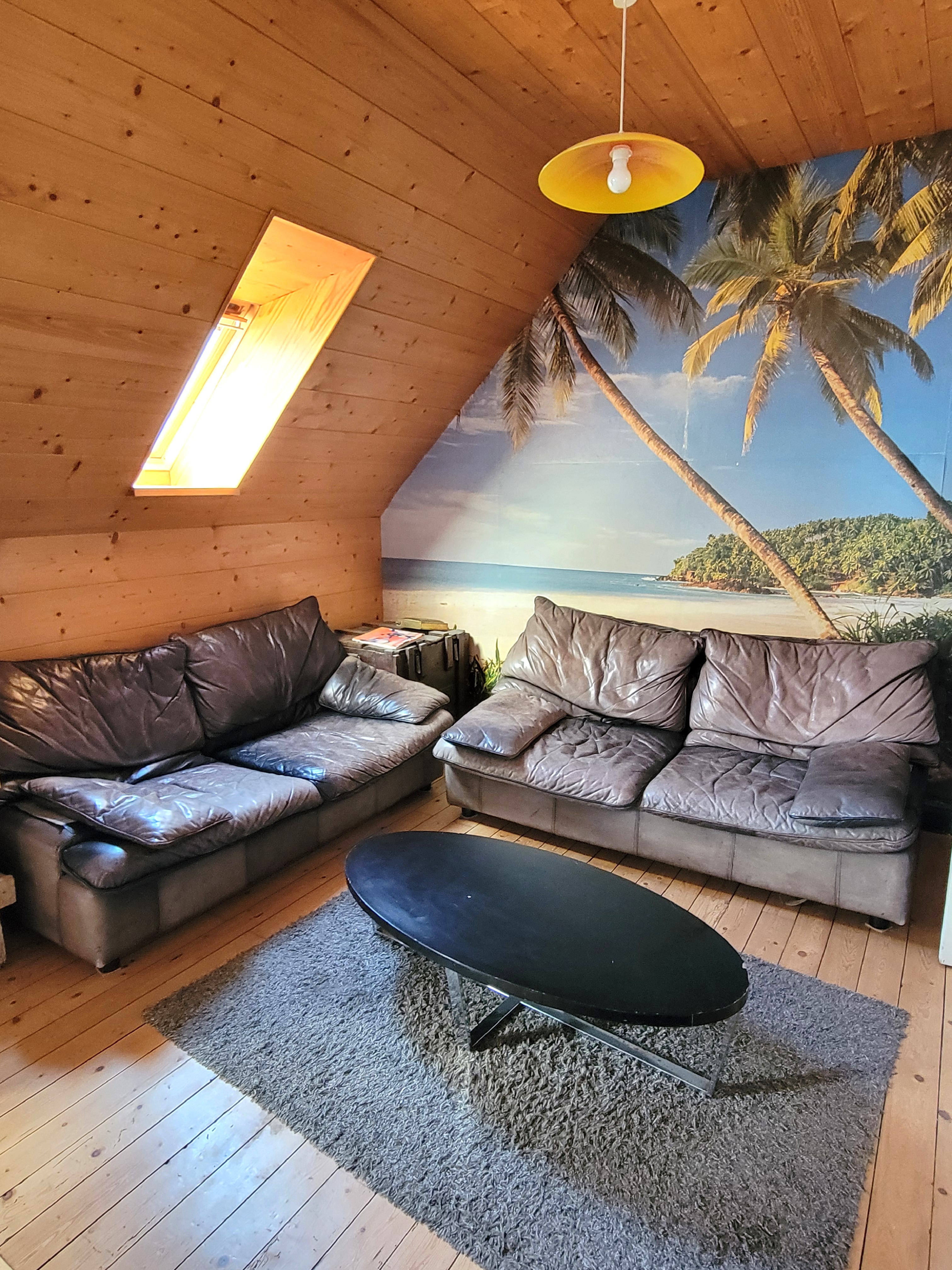 Spacious living room with two comfortable sofas, flat-screen TV.