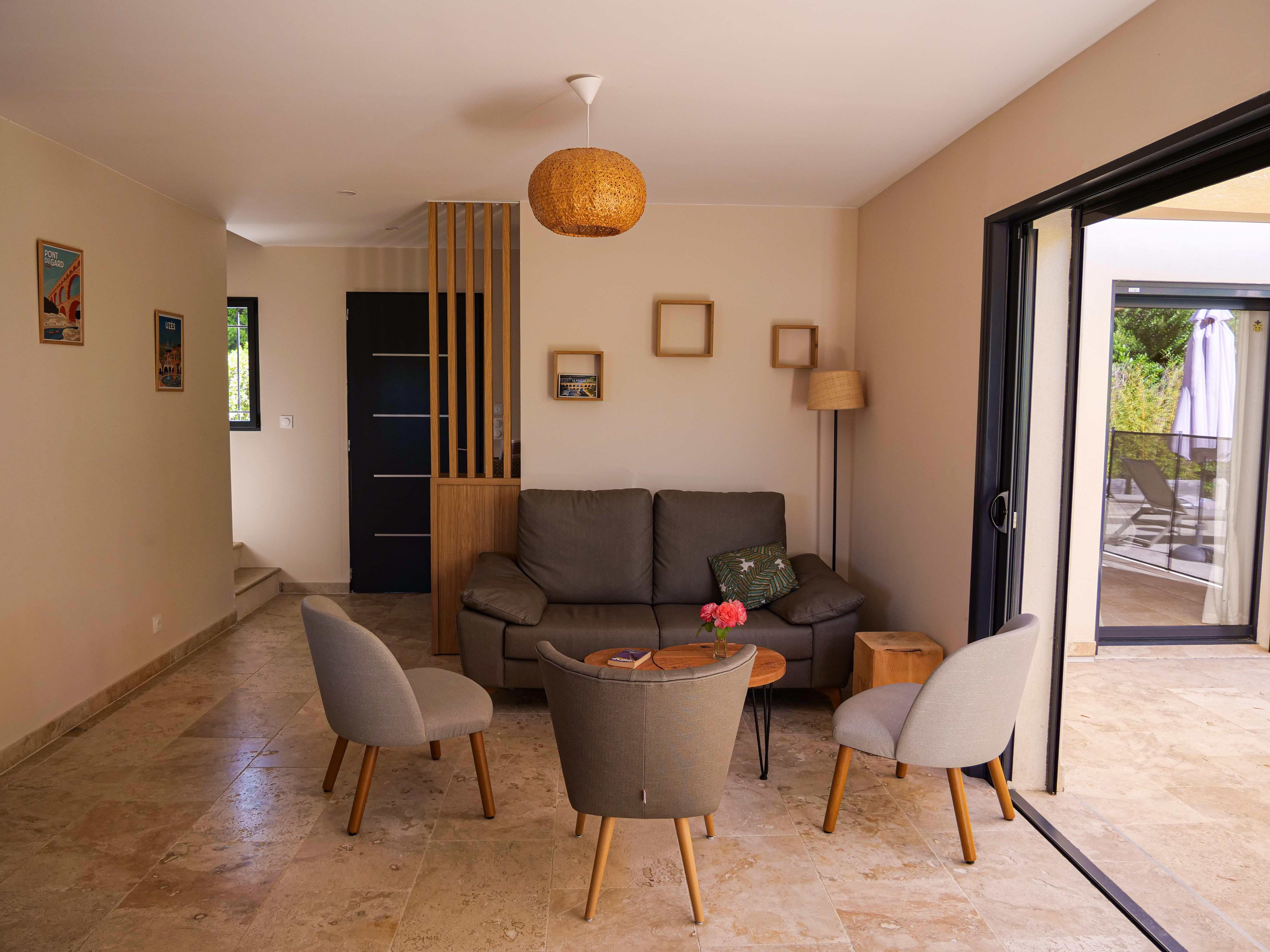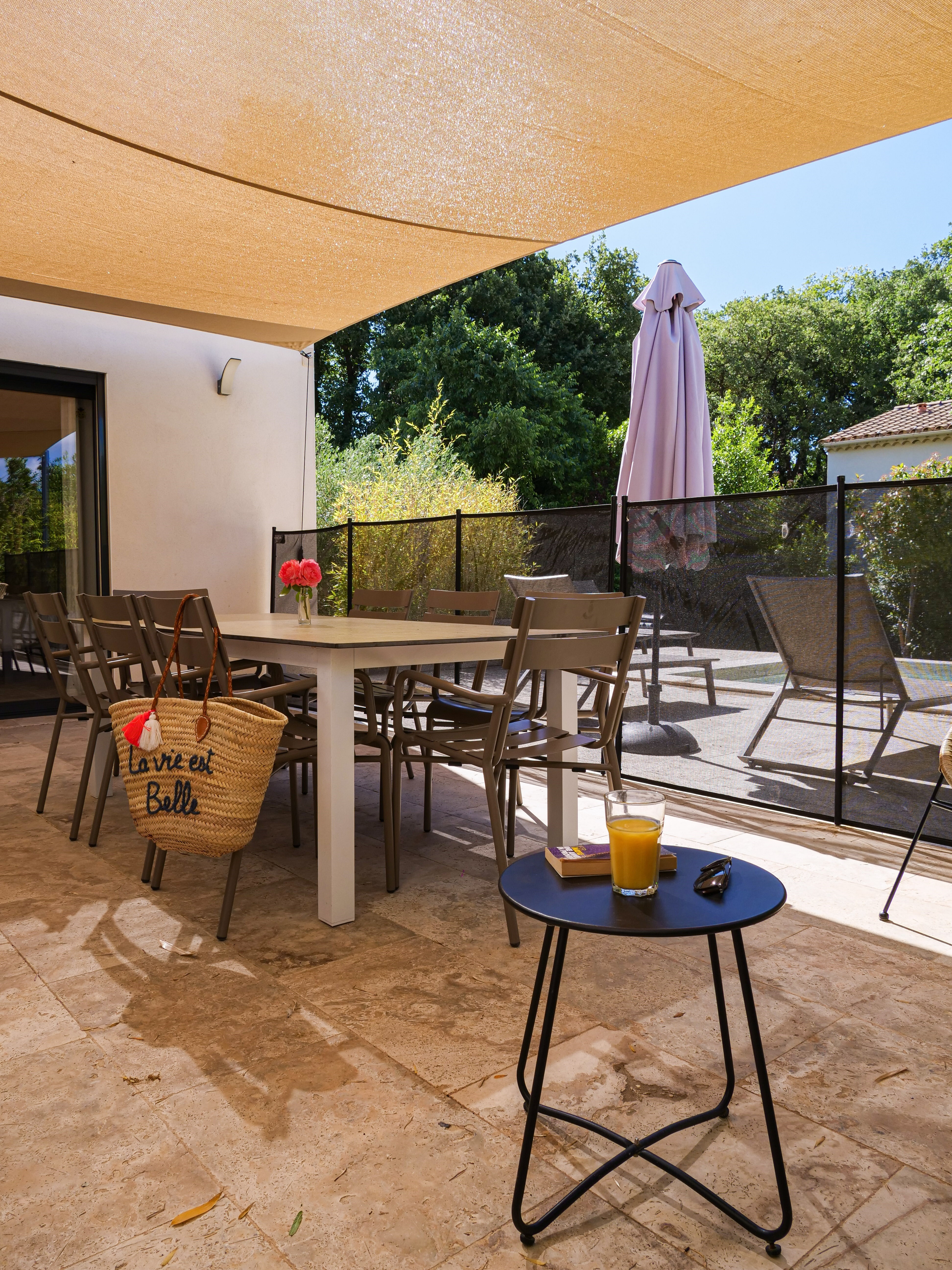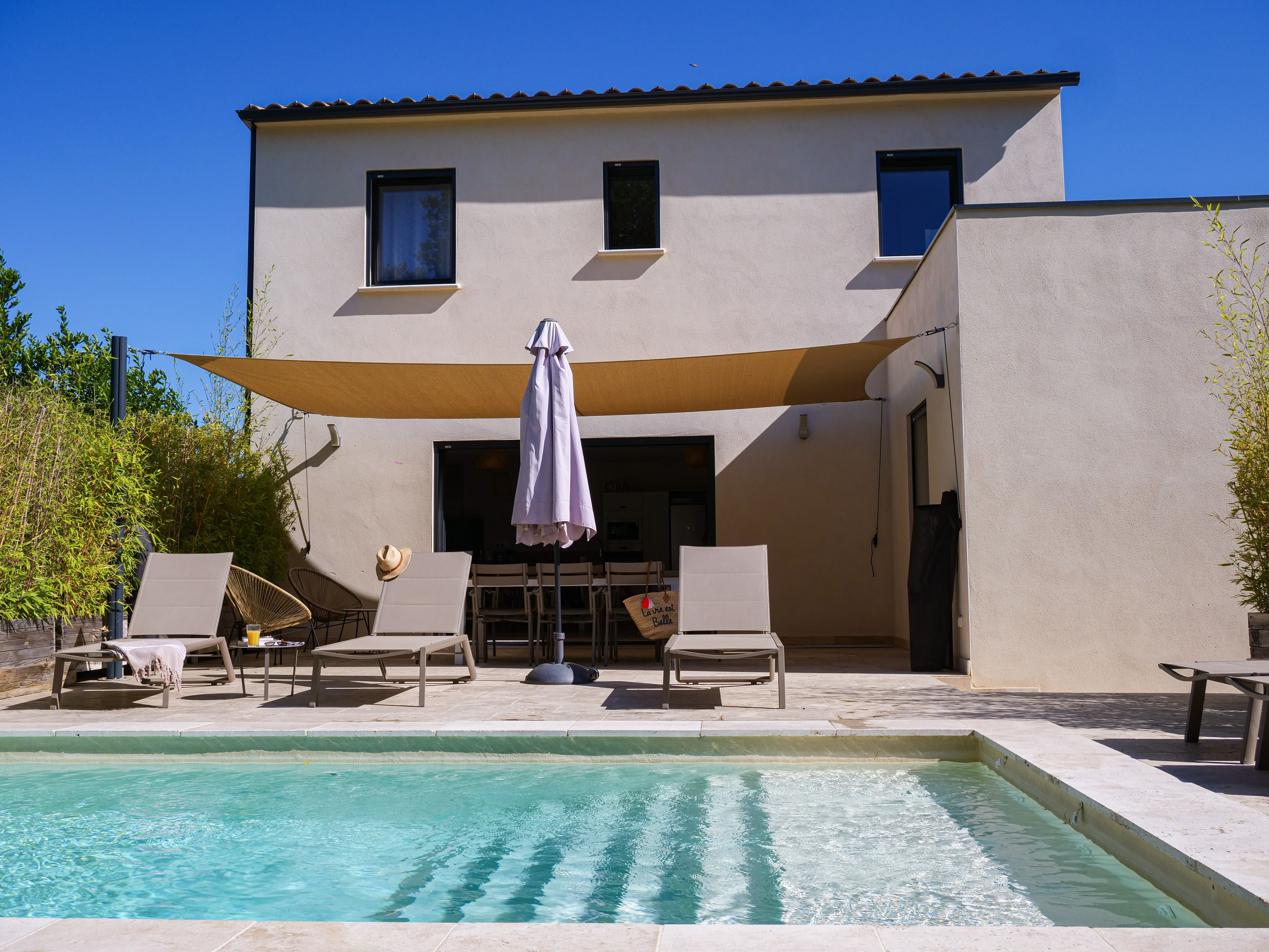 You have direct access to the private swimming pool via the large, glazed, sliding door.