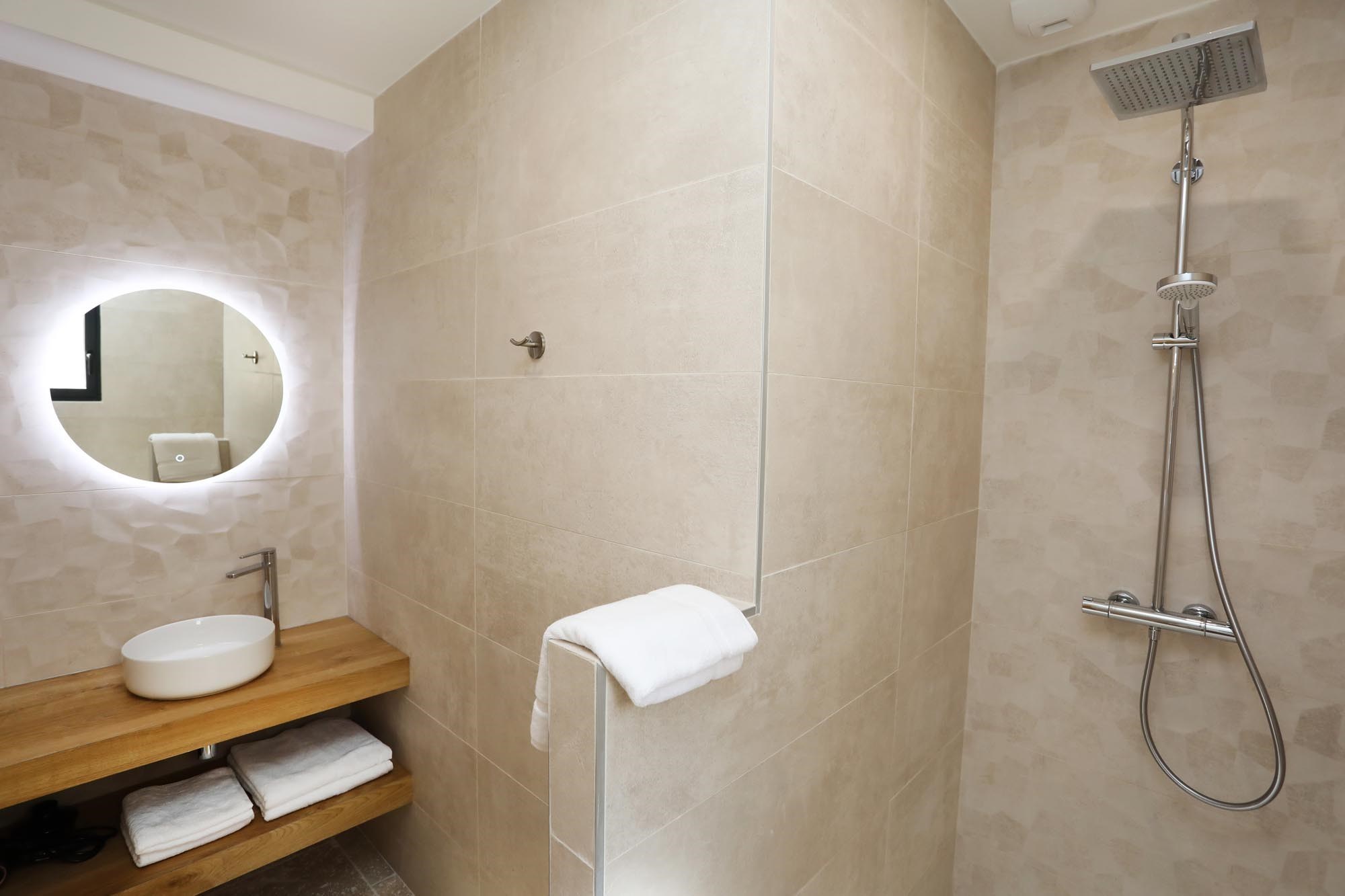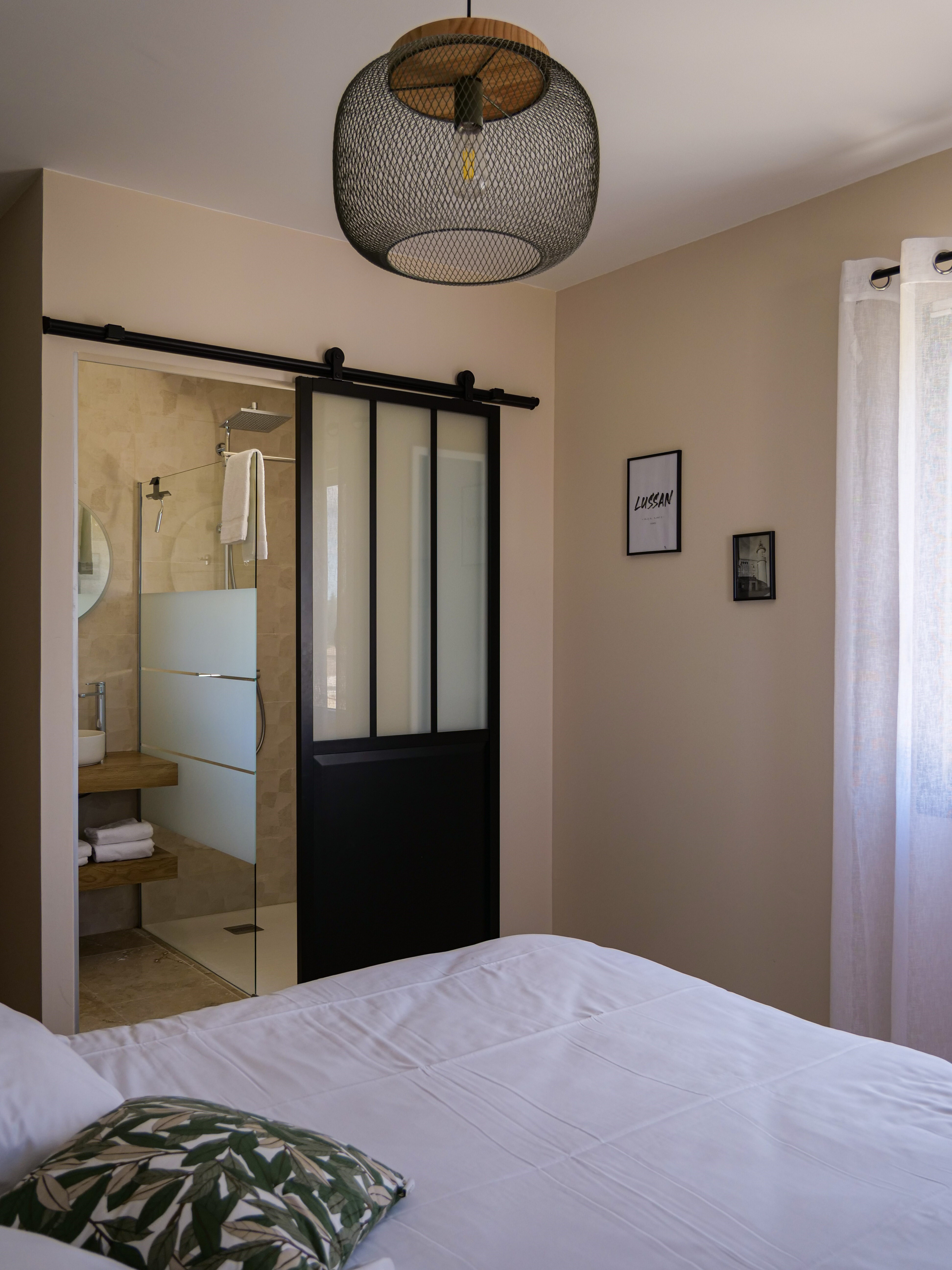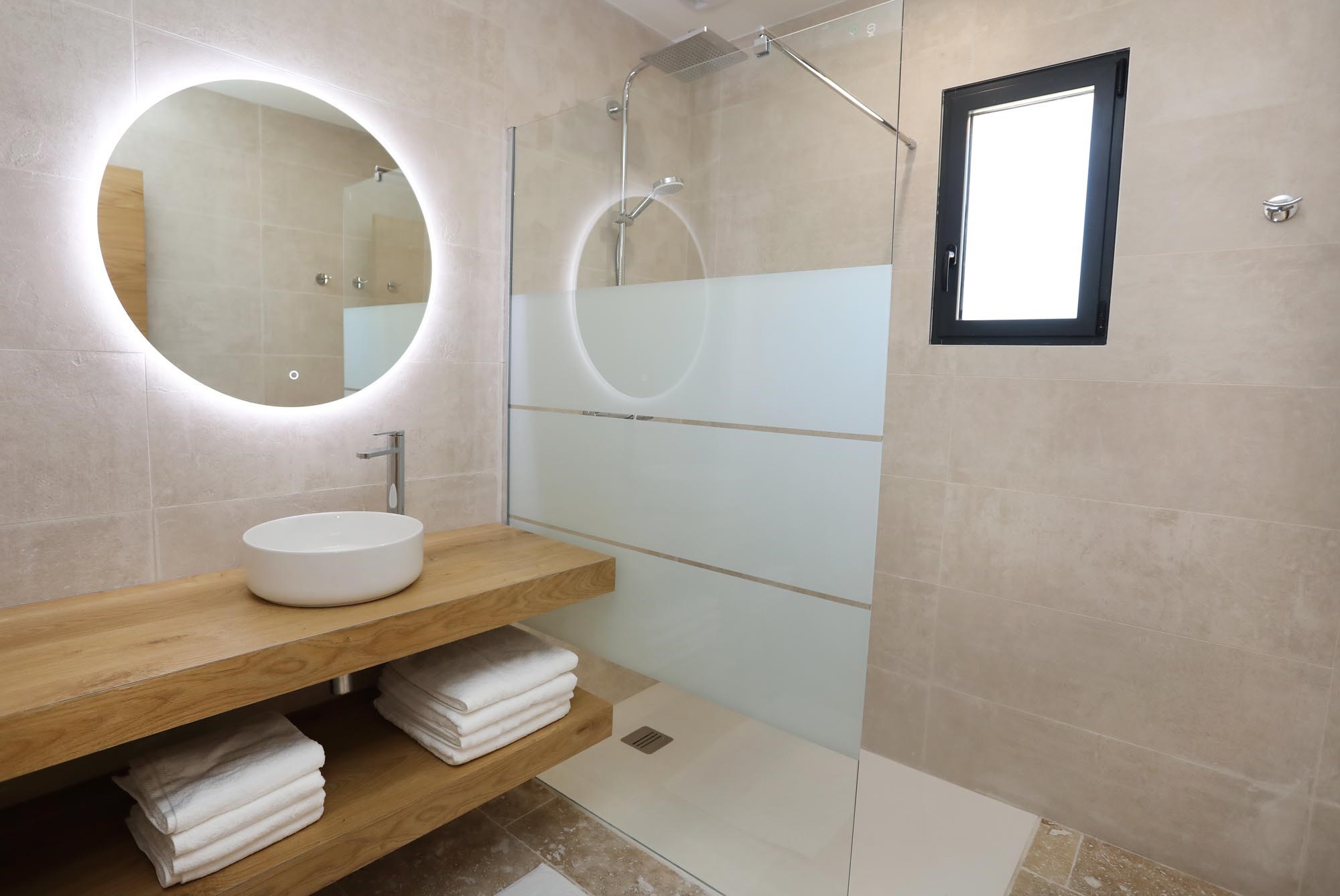 In the master bedroom on the ground floor, you can enjoy privacy and access to the swimming pool also via a glazed, sliding door. On the first floor, there are 2 bedrooms, one for the children with a shared shower room, and a second master suite with its own shower room. The décor is simple, soft and contemporary, highlighting the surrounding green landscape.