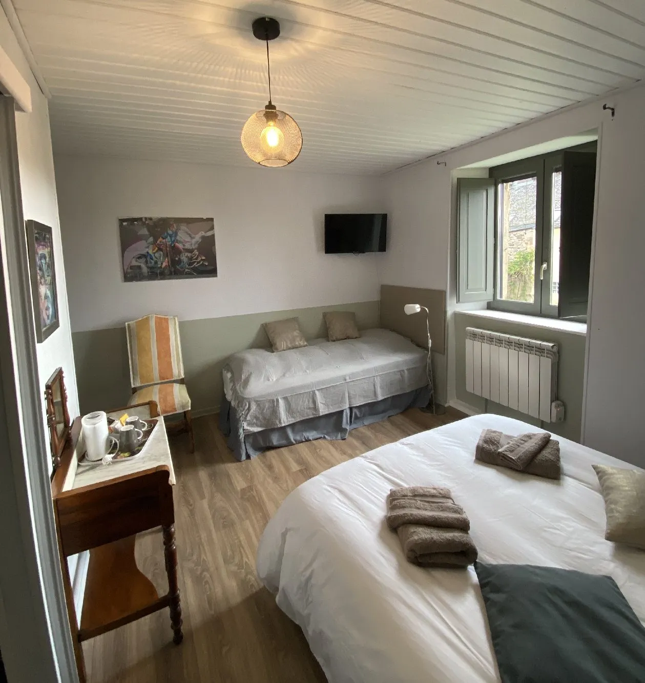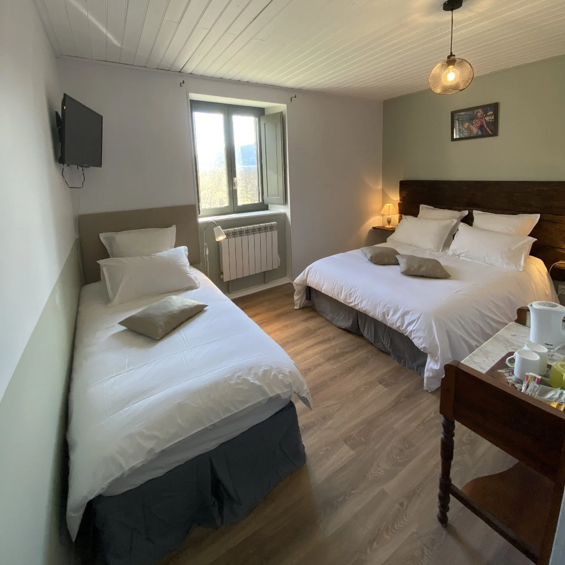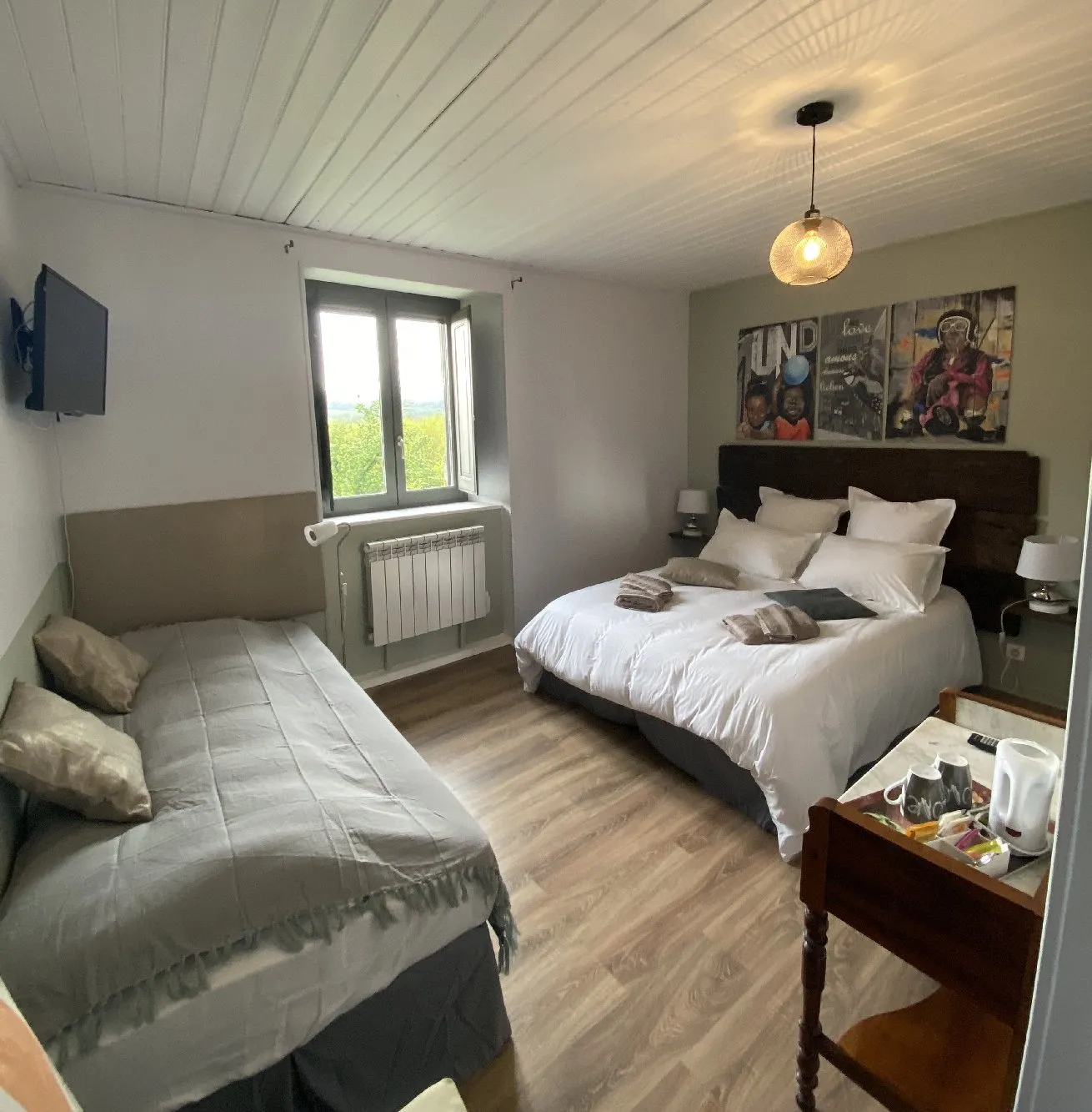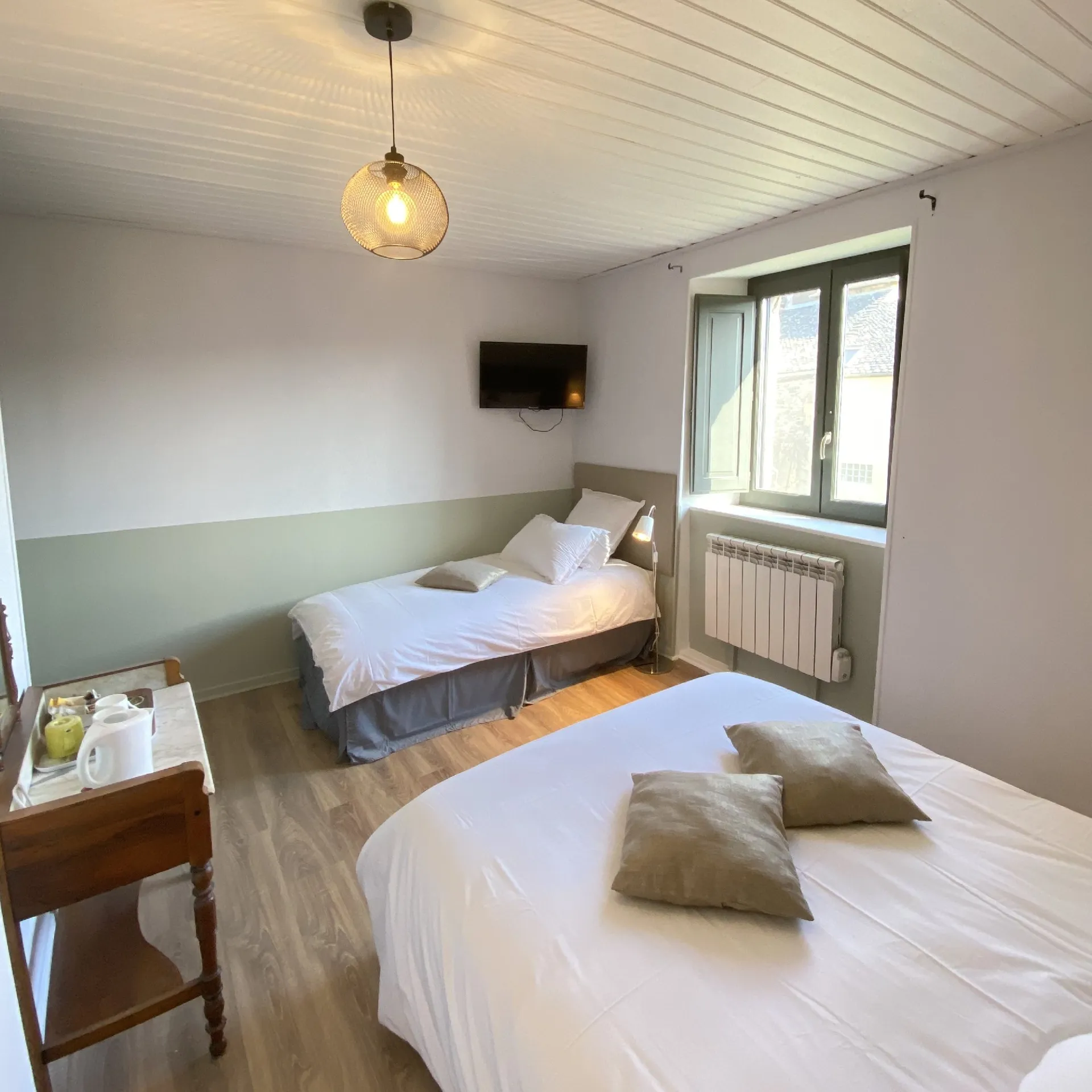 Chambre São Paulo 4 pers (lit 140 + 2 lits 90), chaque chambre est dotée d’une télévision écran plat, plateau bouilloire, linge de lit et linge de maison.