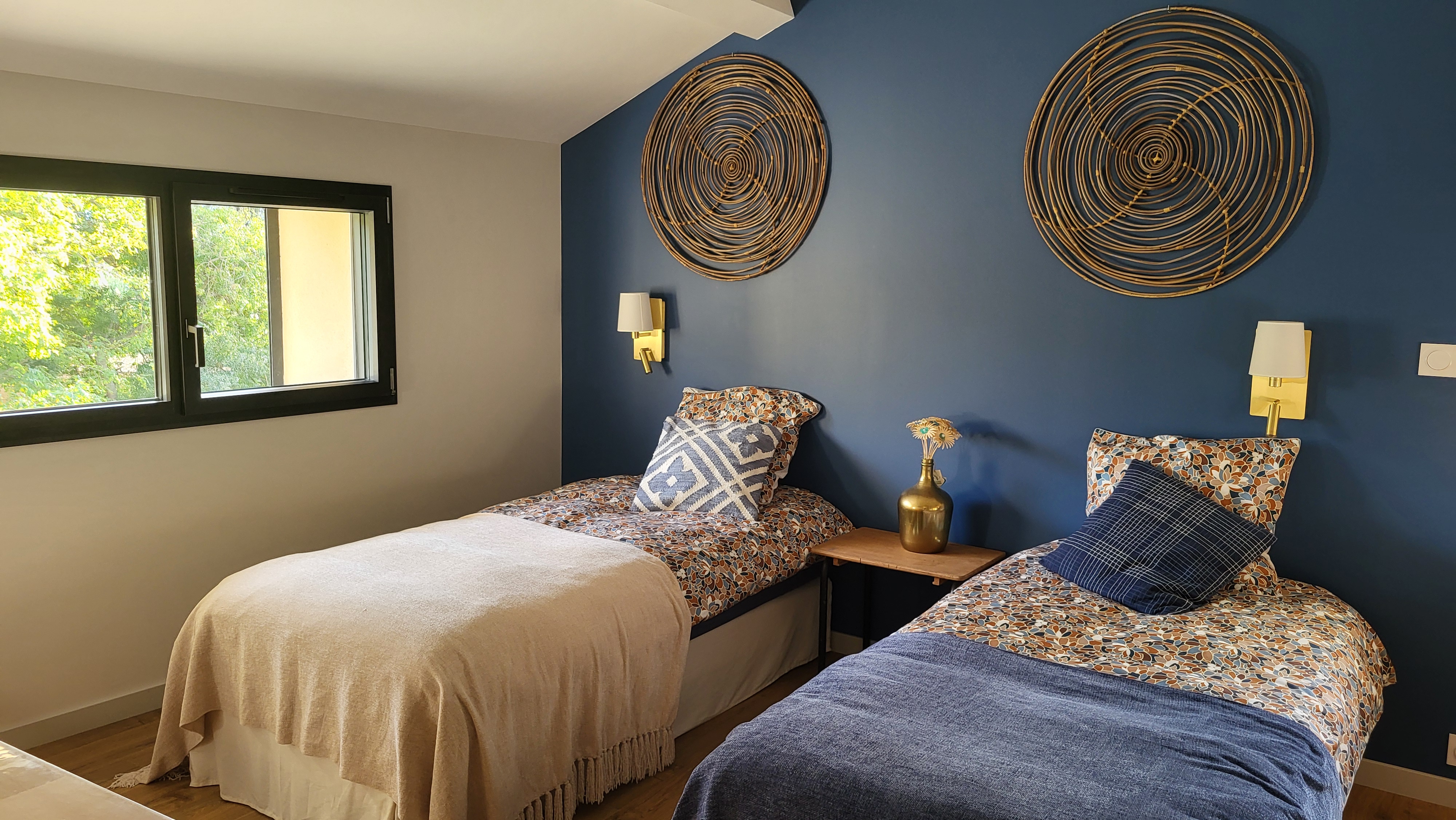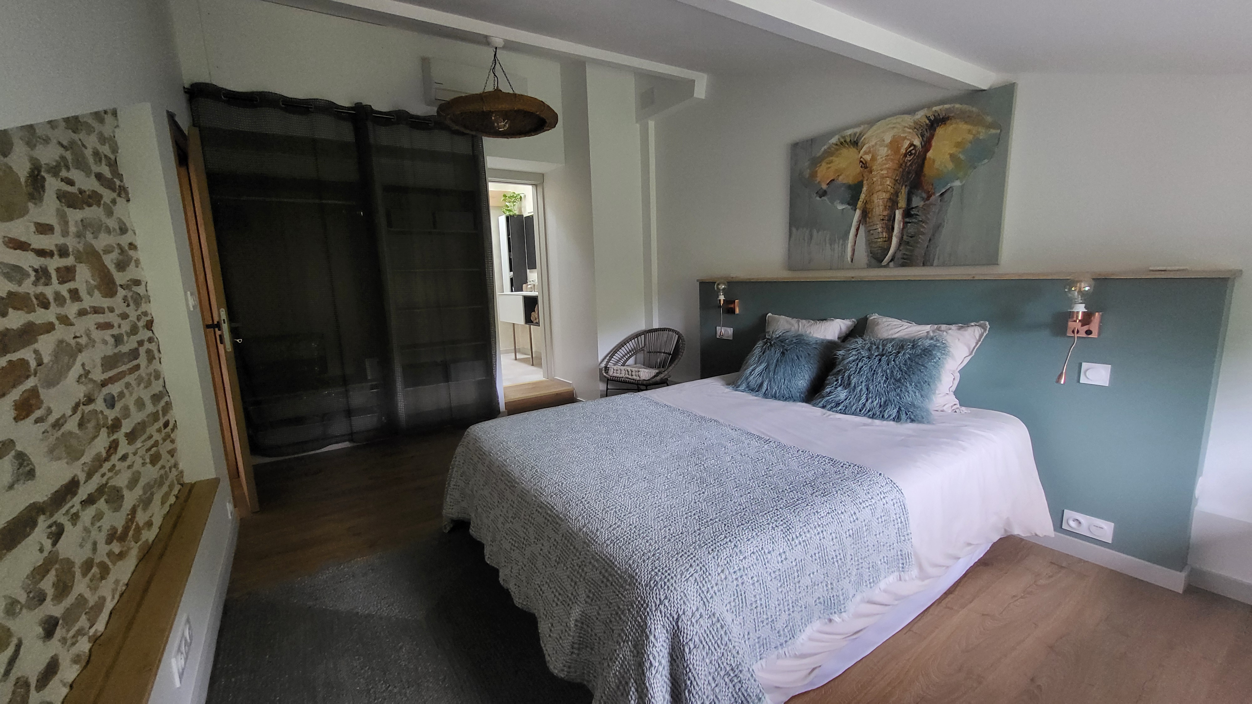 This spacious flat is on the second floor, without a lift, with its own entrance and off-street parking: – A master suite with a 160cm bed, a dressing room and a shower room with walk-in shower and toilet. – One bedroom with 2 single beds (90cm) with washbasin and shower (or 1 single bed (180cm) with mattress topper on request). – Very bright 35m 2 living room with sitting area with TV, sofa, coffee table and large table, fully equipped kitchen (fridge, hob, sink, dishwasher, washing machine). – Separate WC. All rooms have air conditioning and windows overlooking the garden (electric shutters in bedrooms). Quality bed linen and towels provided. Peaceful setting Old charm, free parking, terrace. Away from the building, you’ll find a swimming pool with its Californian beach, sun loungers on the lawn and a shaded sitting area out of sight.