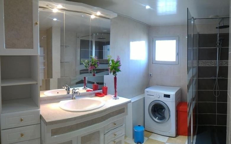 Cuisine indépendante, bureau (ordinateur/internet/wifi), Au rez de chaussée 1 chambre (1 lit 160), 1 chambre (1 lit 140) 2 salles d’eau, wc indépendant, grand salon / salle à manger (cheminée), arrière-cuisine. A l’étage: 1 chambre enfant (2 lits 90 ), 2 chambres ( 2 lits 160) , WC.