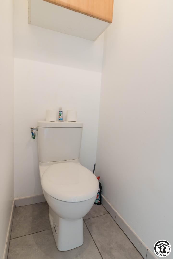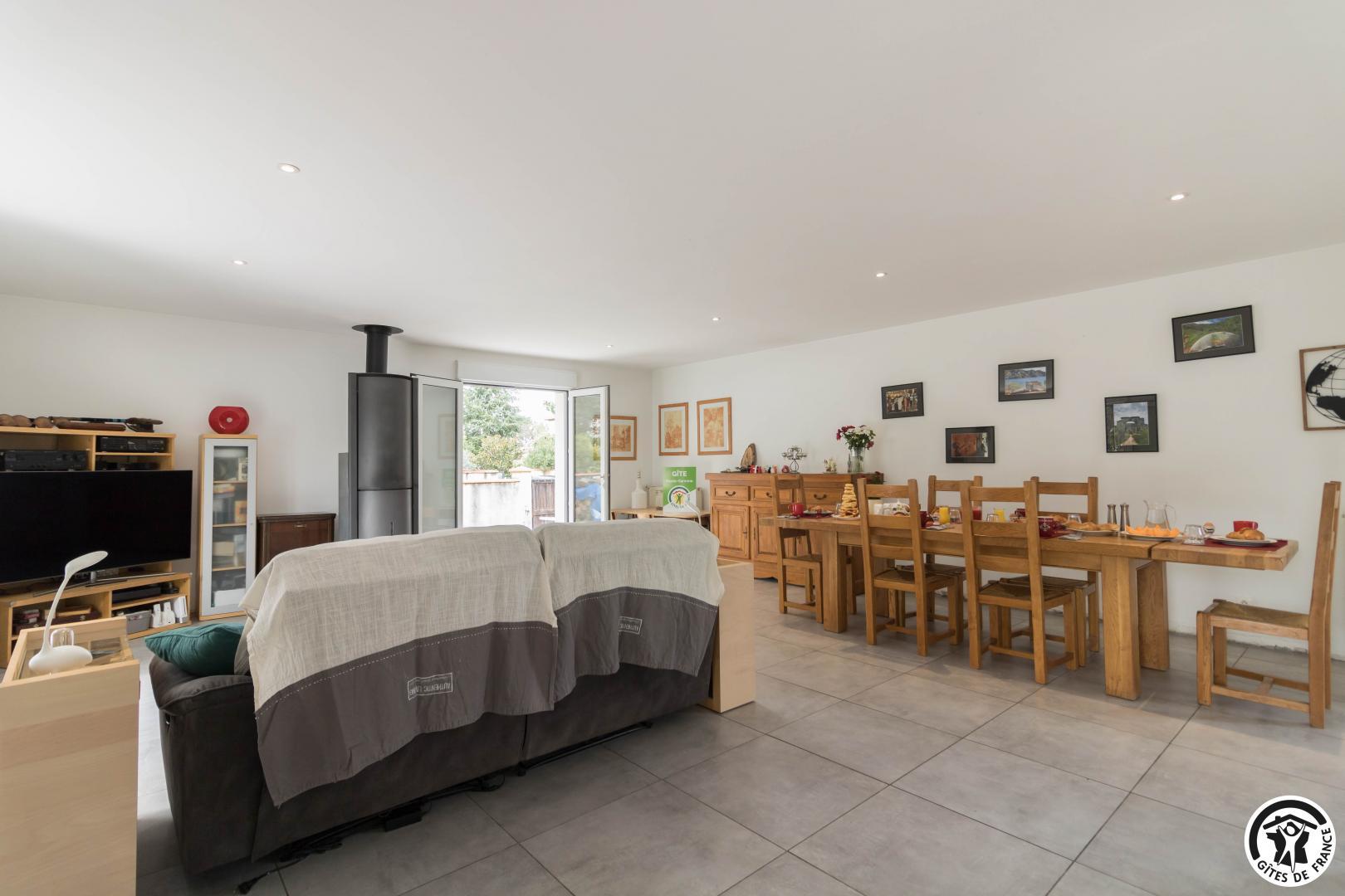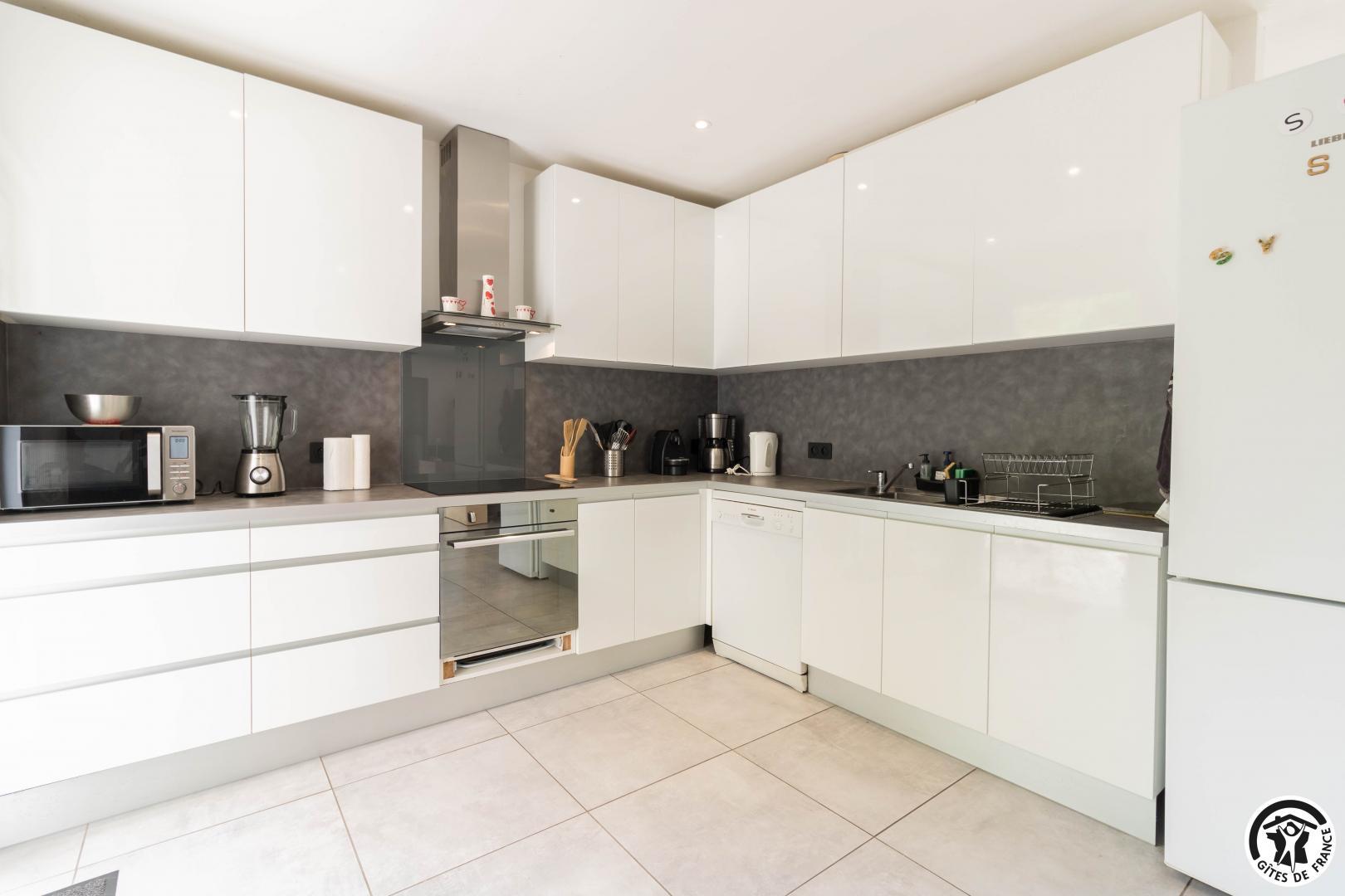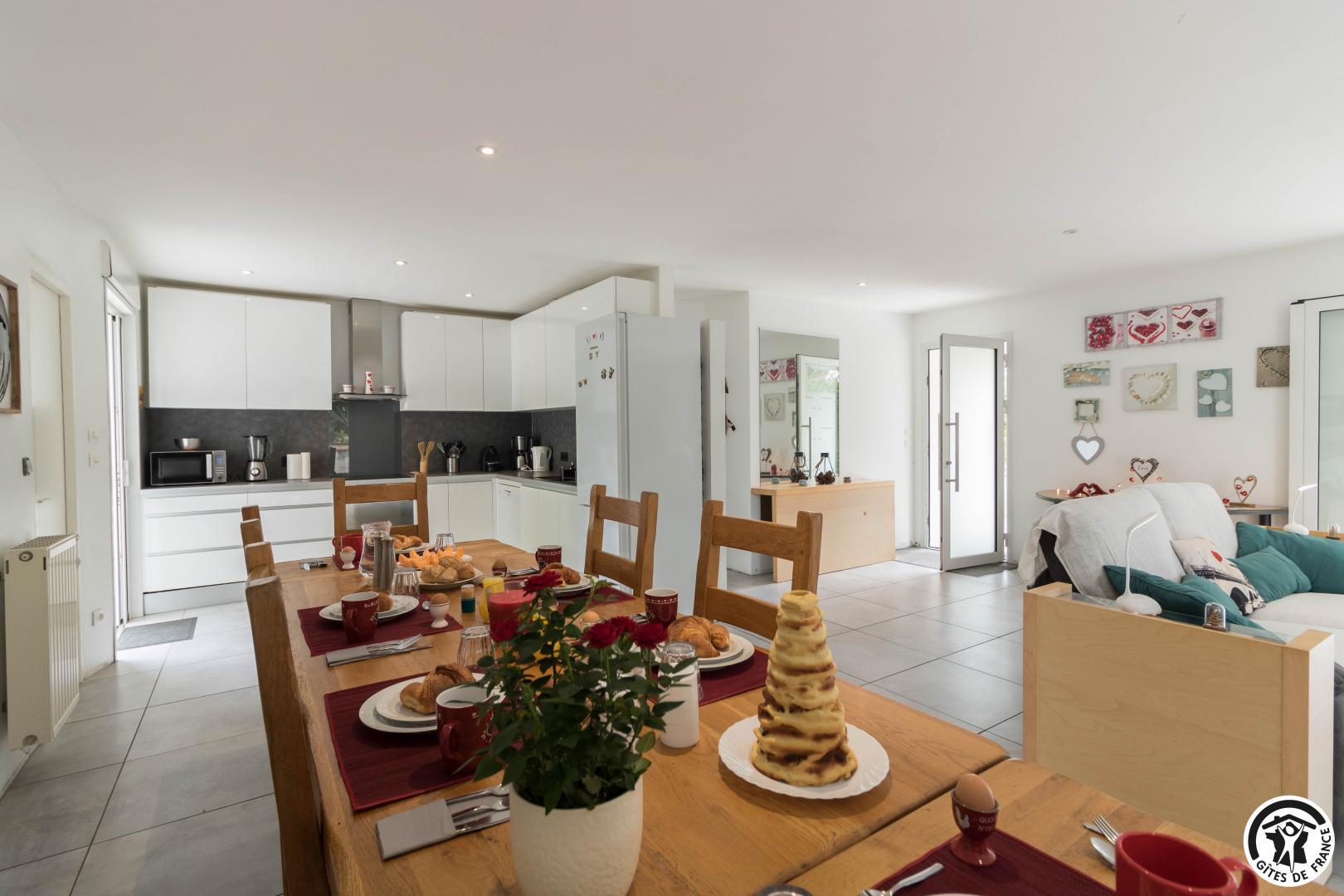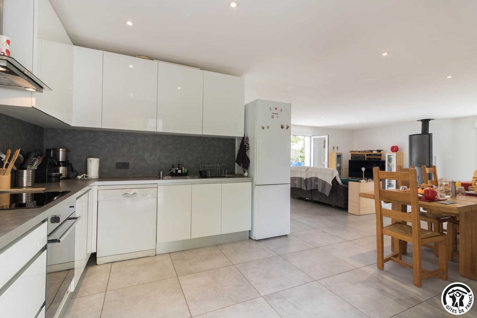 Gîte de plain-pied : séjour avec coin salon, espace repas et cuisine intégrée, 3 chambres (1 lit double en 140*190cm, salle de bains séparée et WC indépendant)(1 lit double en 140*190cm, douche, vasque et WC)(1 lit double en 140*190cm, douche et vasque), buanderie (lave-linge et sèche-linge).