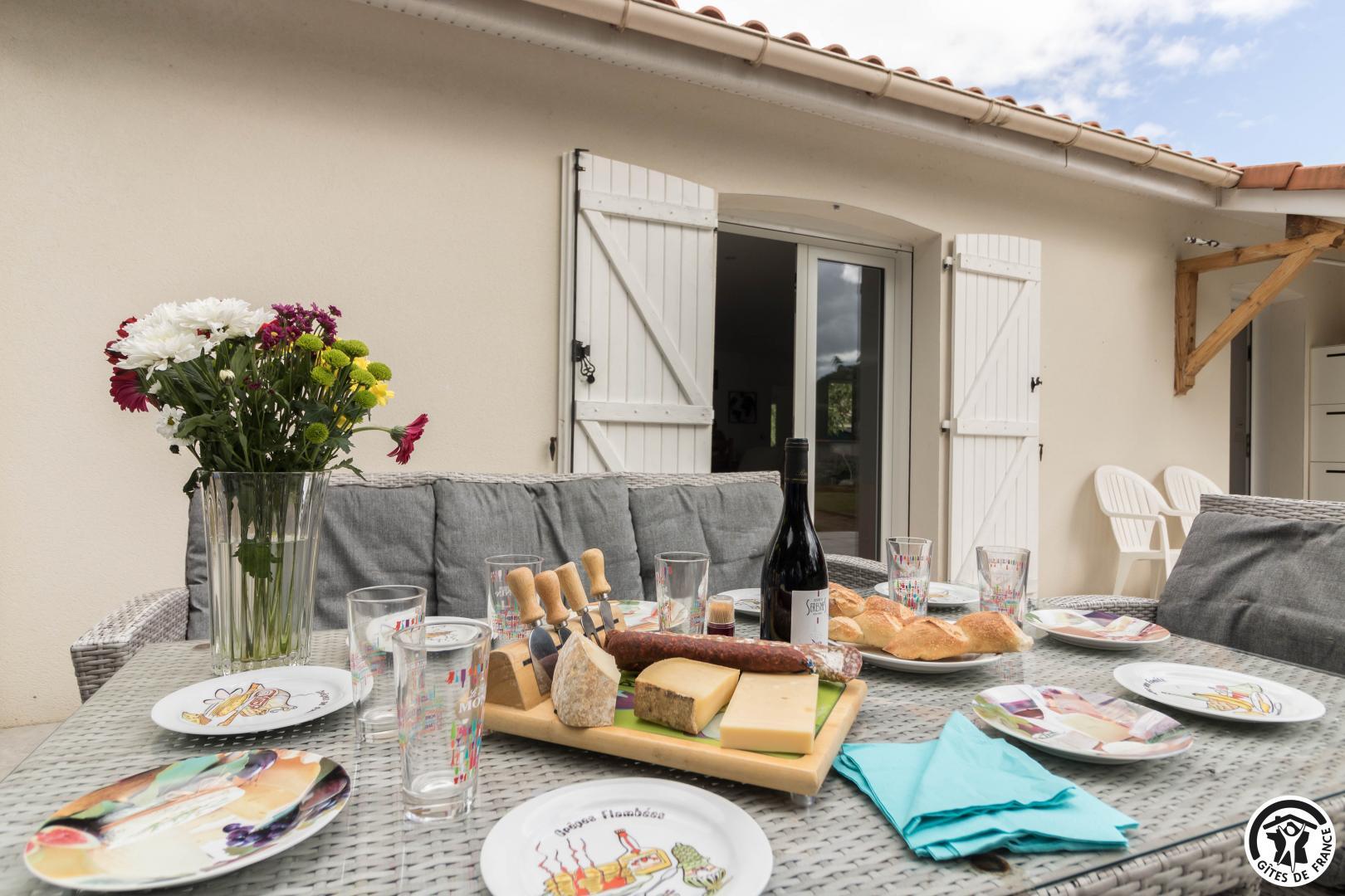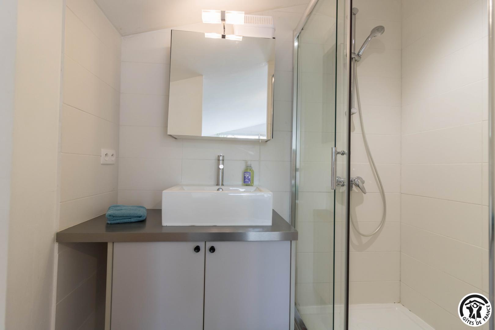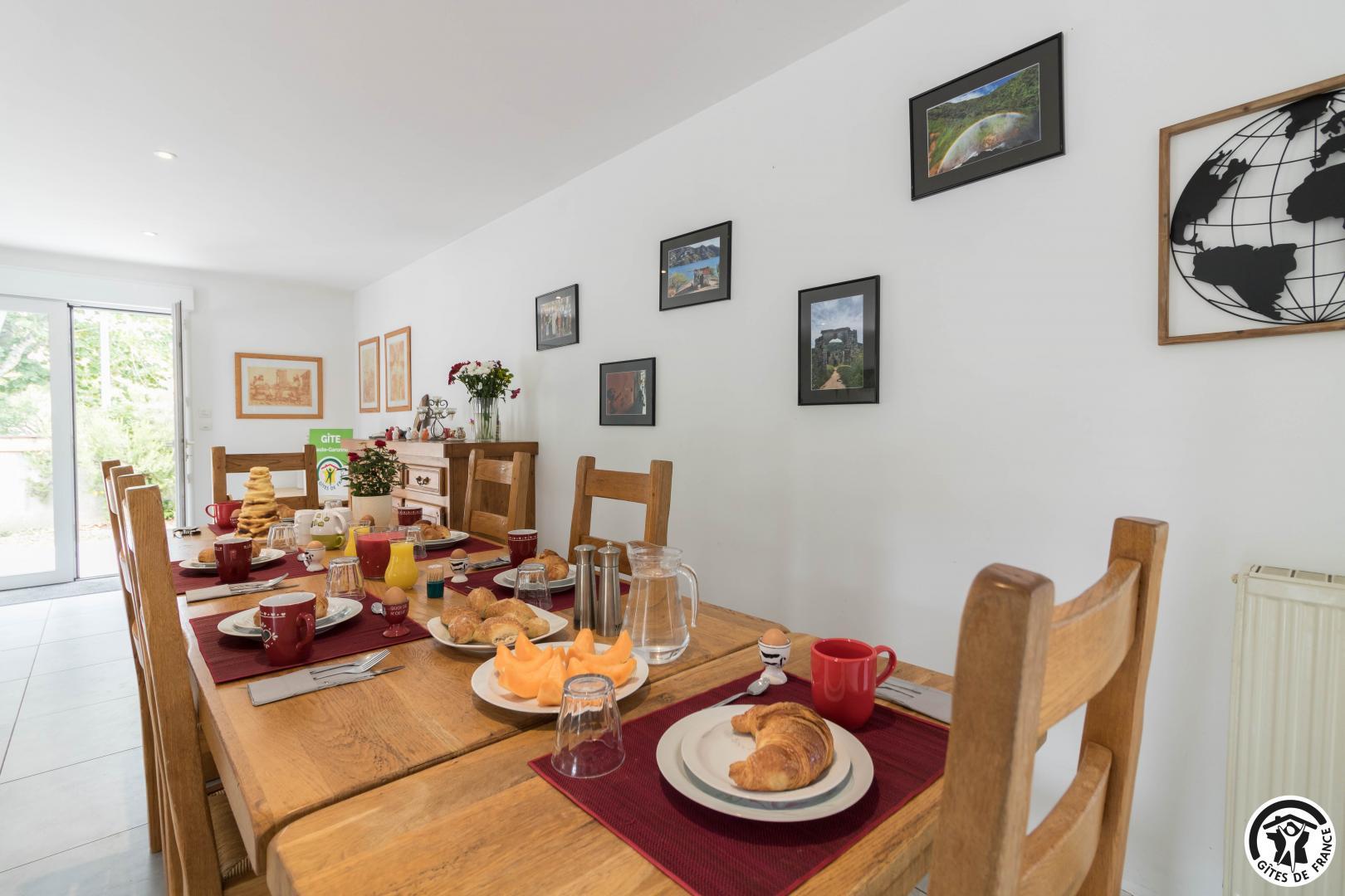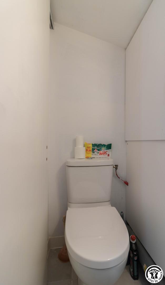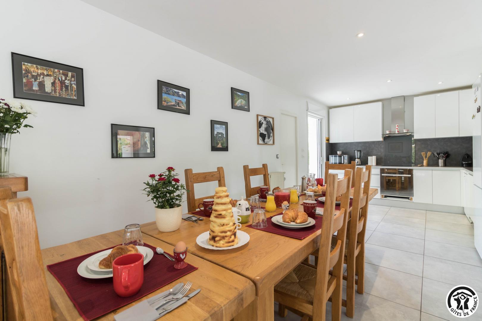 Gîte de plain-pied : séjour avec coin salon, espace repas et cuisine intégrée, 3 chambres (1 lit double en 140*190cm, salle de bains séparée et WC indépendant)(1 lit double en 140*190cm, douche, vasque et WC)(1 lit double en 140*190cm, douche et vasque), buanderie (lave-linge et sèche-linge).